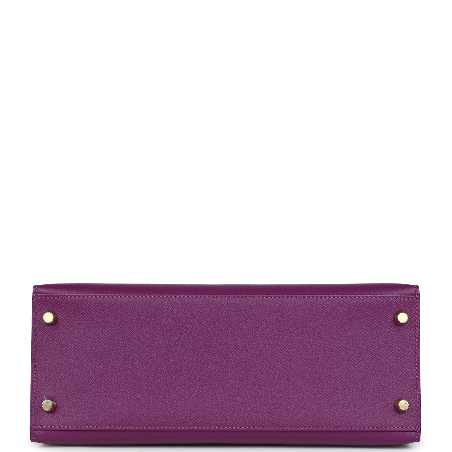 Kelly, in the Sellier style, is of Anemone epsom leather with gold hardware, features tonal stitching, a front toggle closure, a clochette with lock and two keys and a single rolled handle.