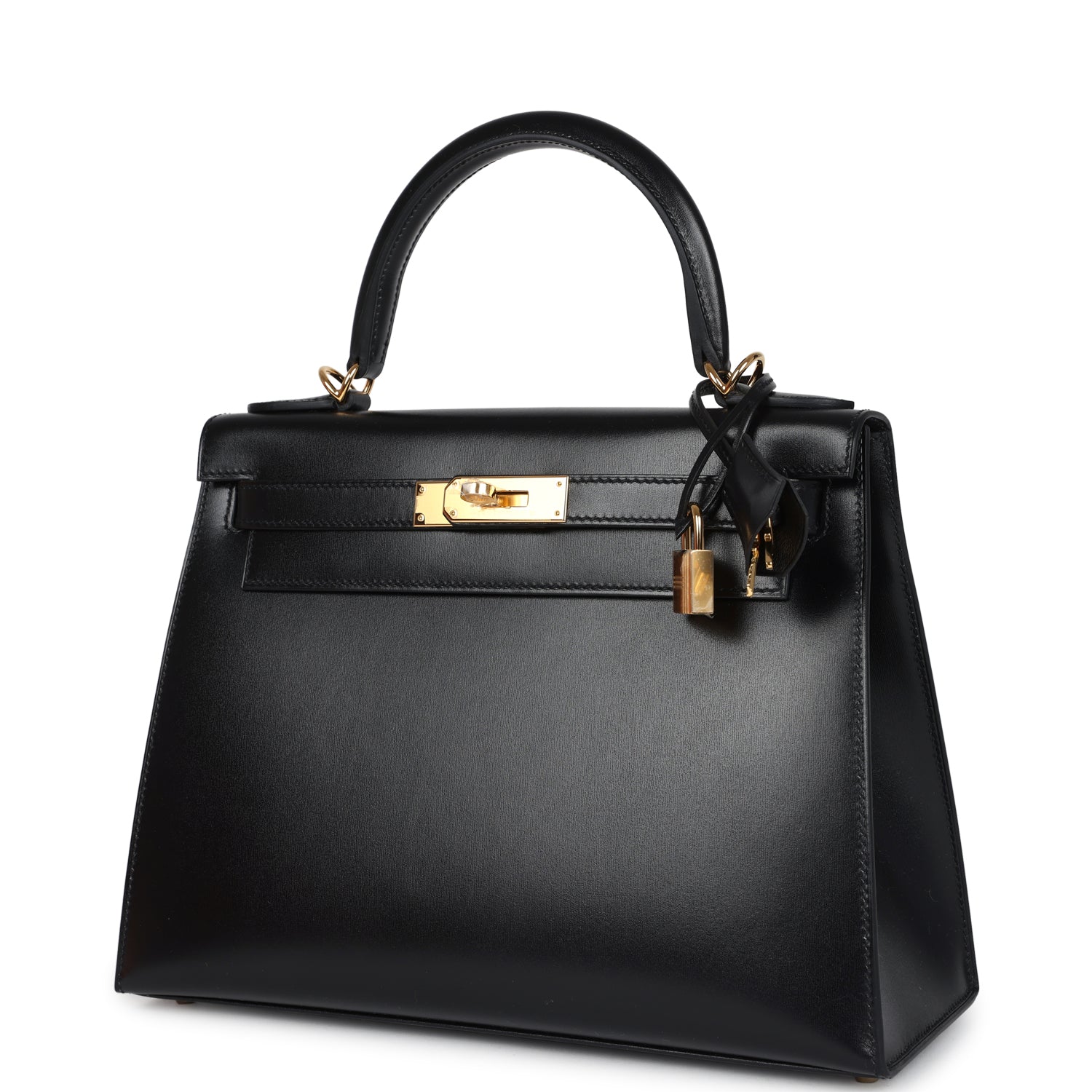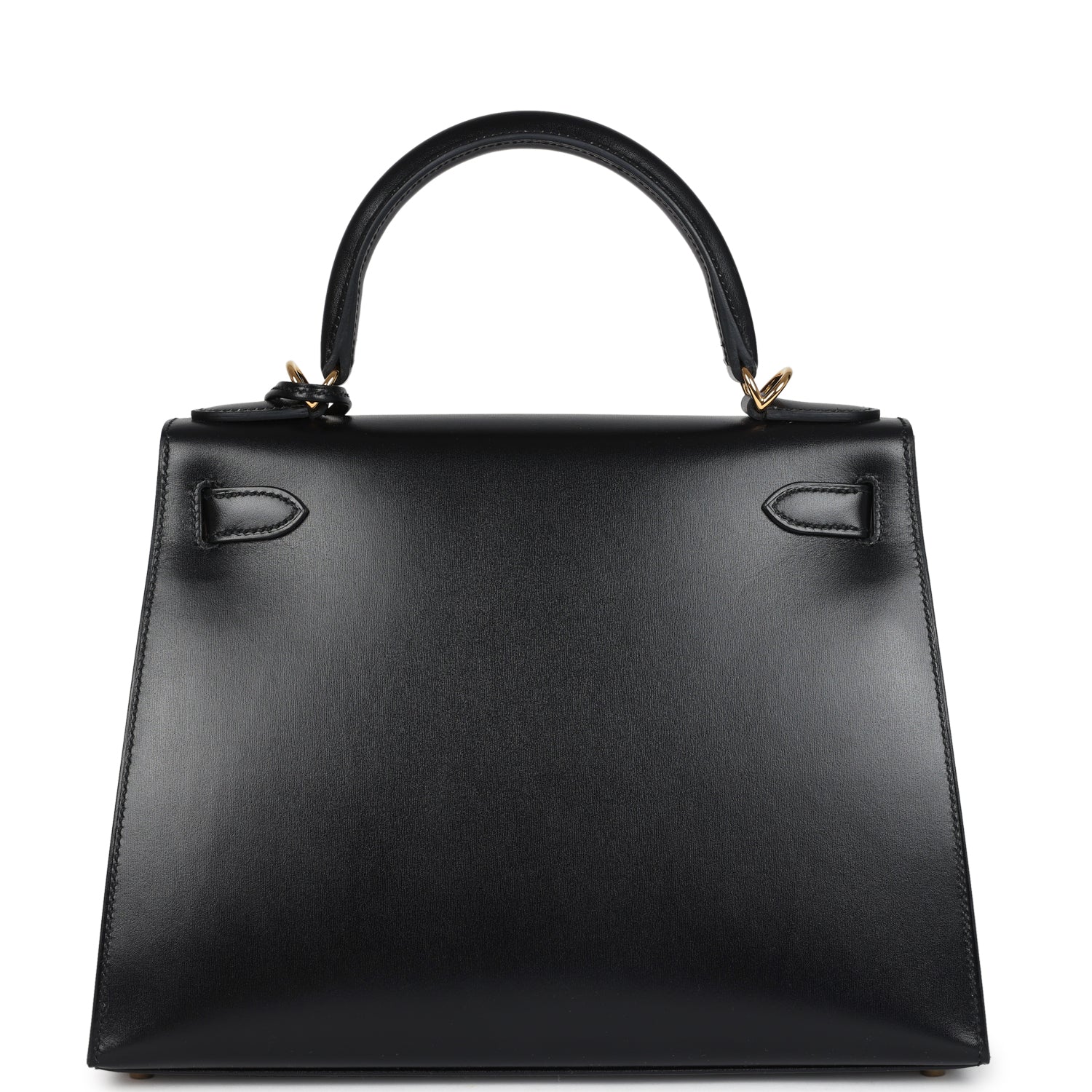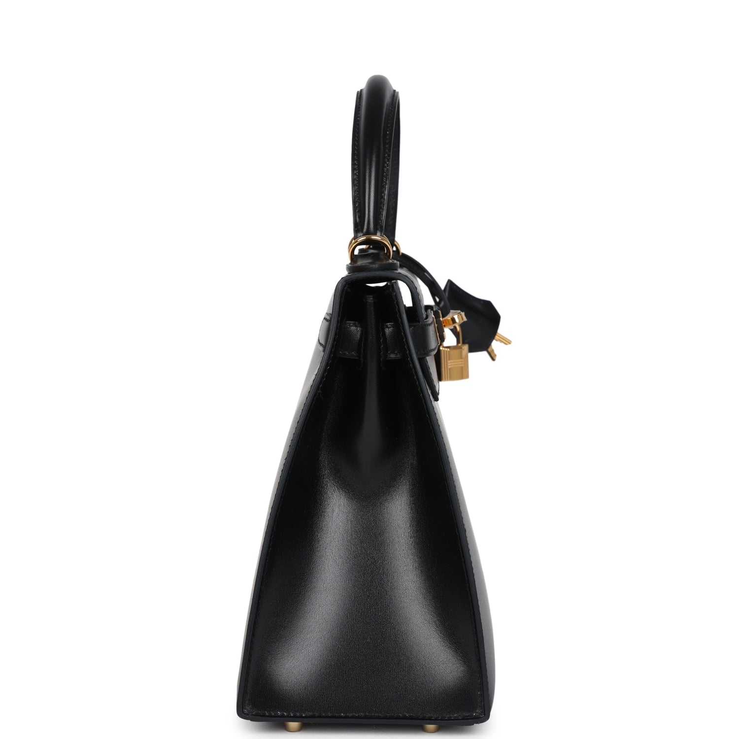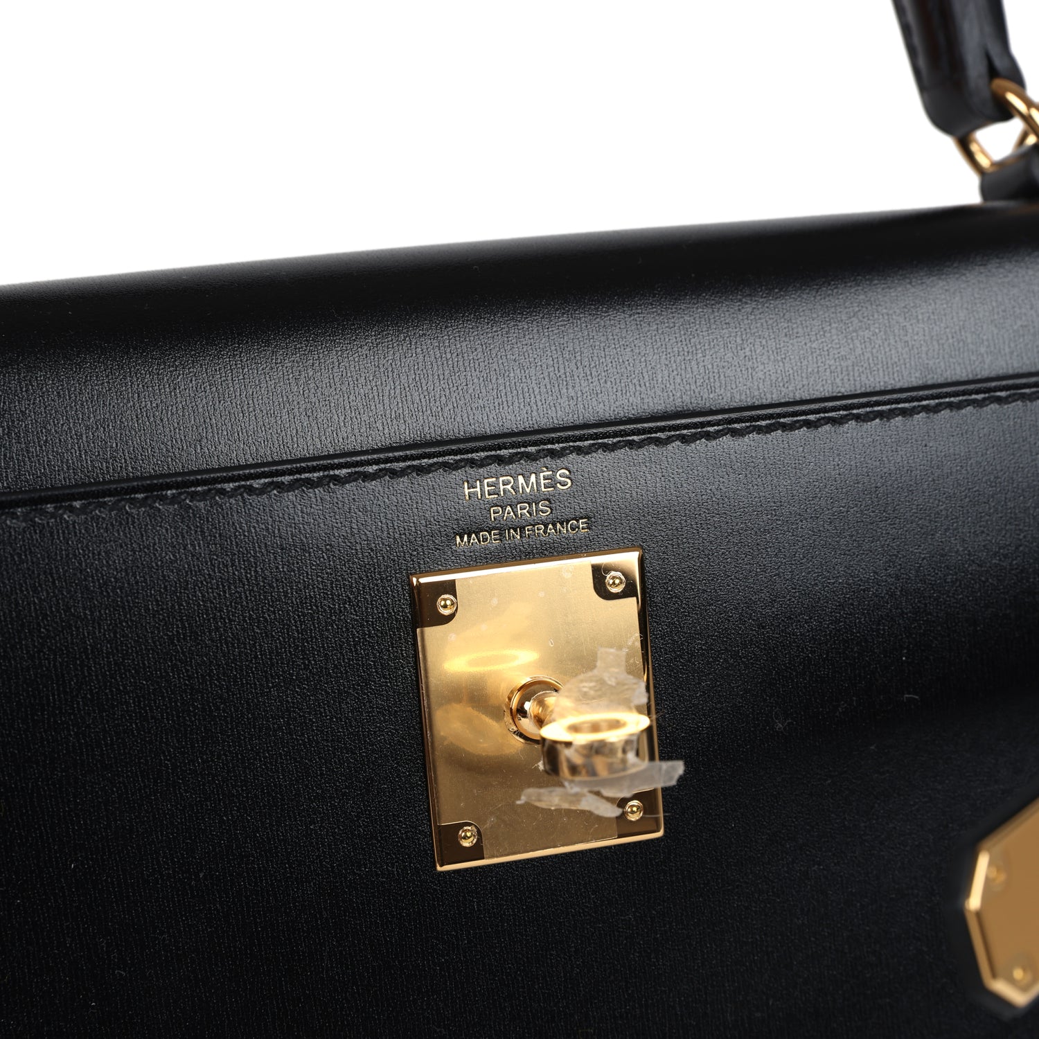 This Kelly, in the Sellier style, is in Black Box calfskin leather with gold hardware and has tonal stitching, two straps with front toggle closure, clochette with lock and two keys, single rolled handle and removable shoulder strap.