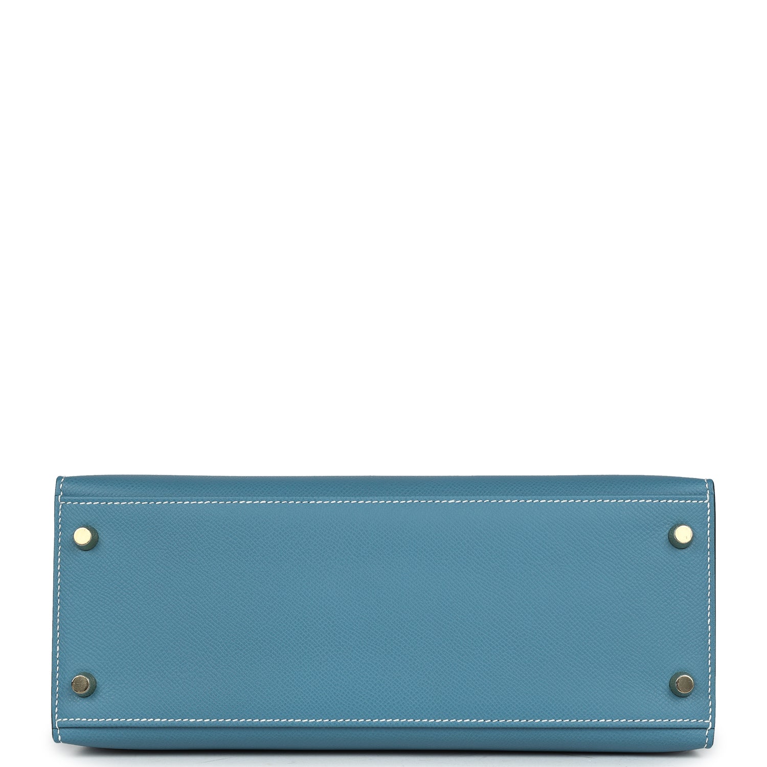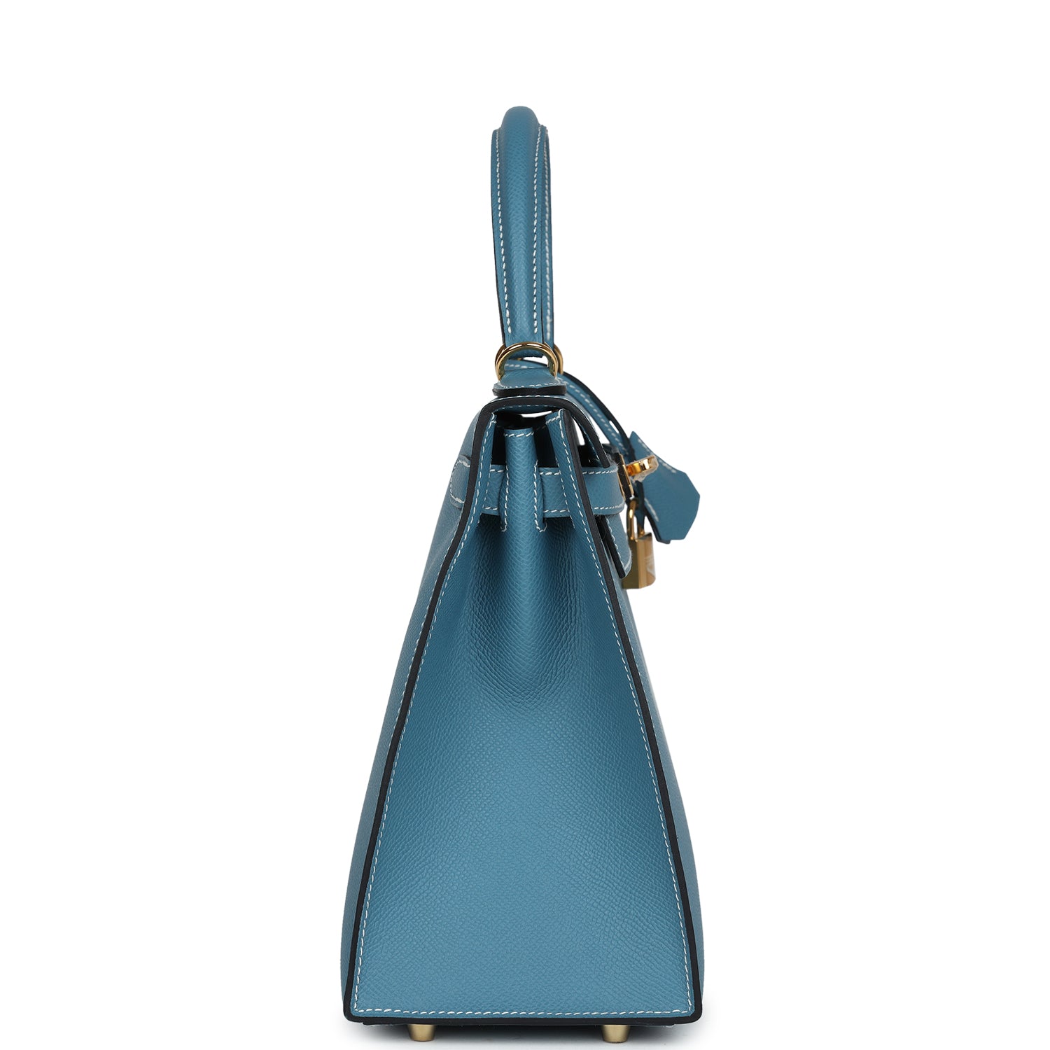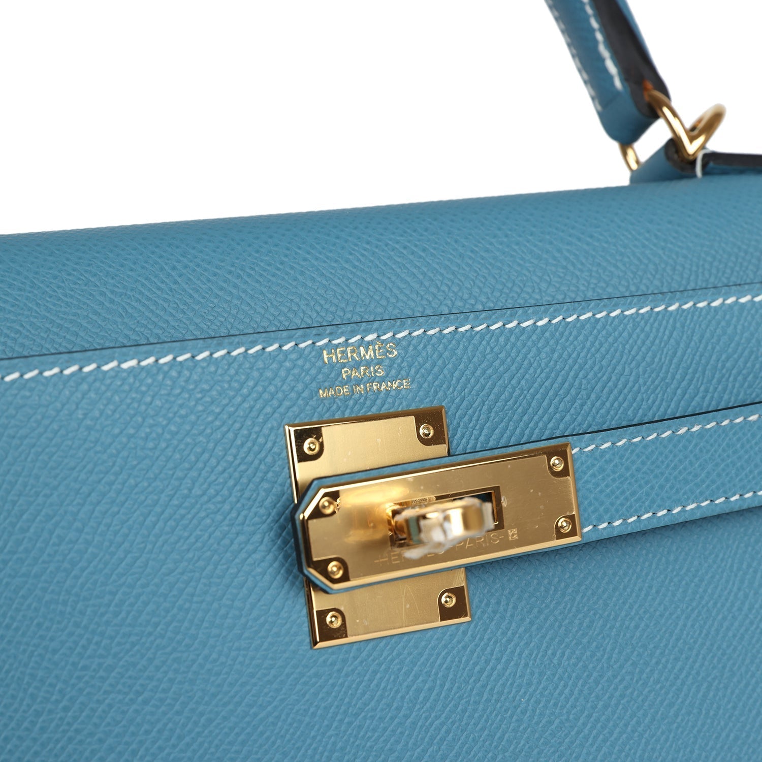 Kelly, in the Sellier style, is in Blue Jean epsom leather with gold hardware, has contrast stitching, front flap, two straps with center toggle closure, clochette with lock and two keys, single rolled handle and removable shoulder strap.
