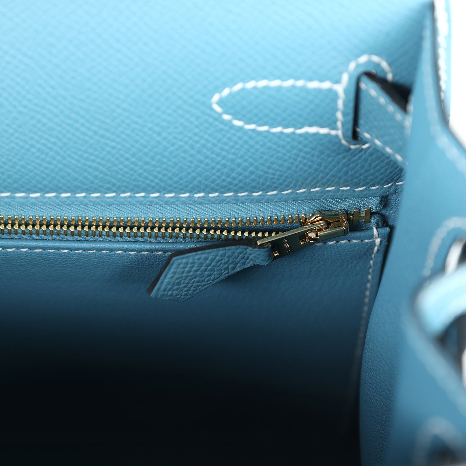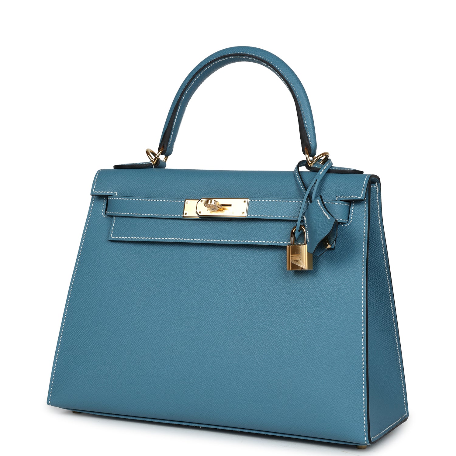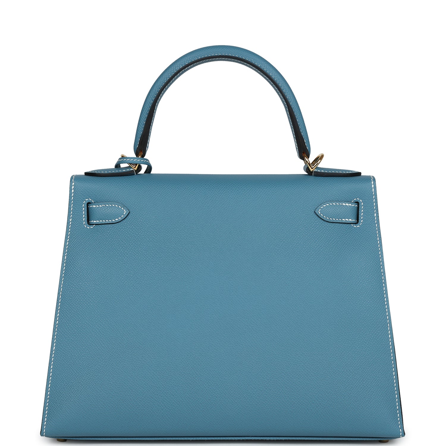 Kelly, in the Sellier style, is in Blue Jean epsom leather with gold hardware, has contrast stitching, front flap, two straps with center toggle closure, clochette with lock and two keys, single rolled handle and removable shoulder strap.