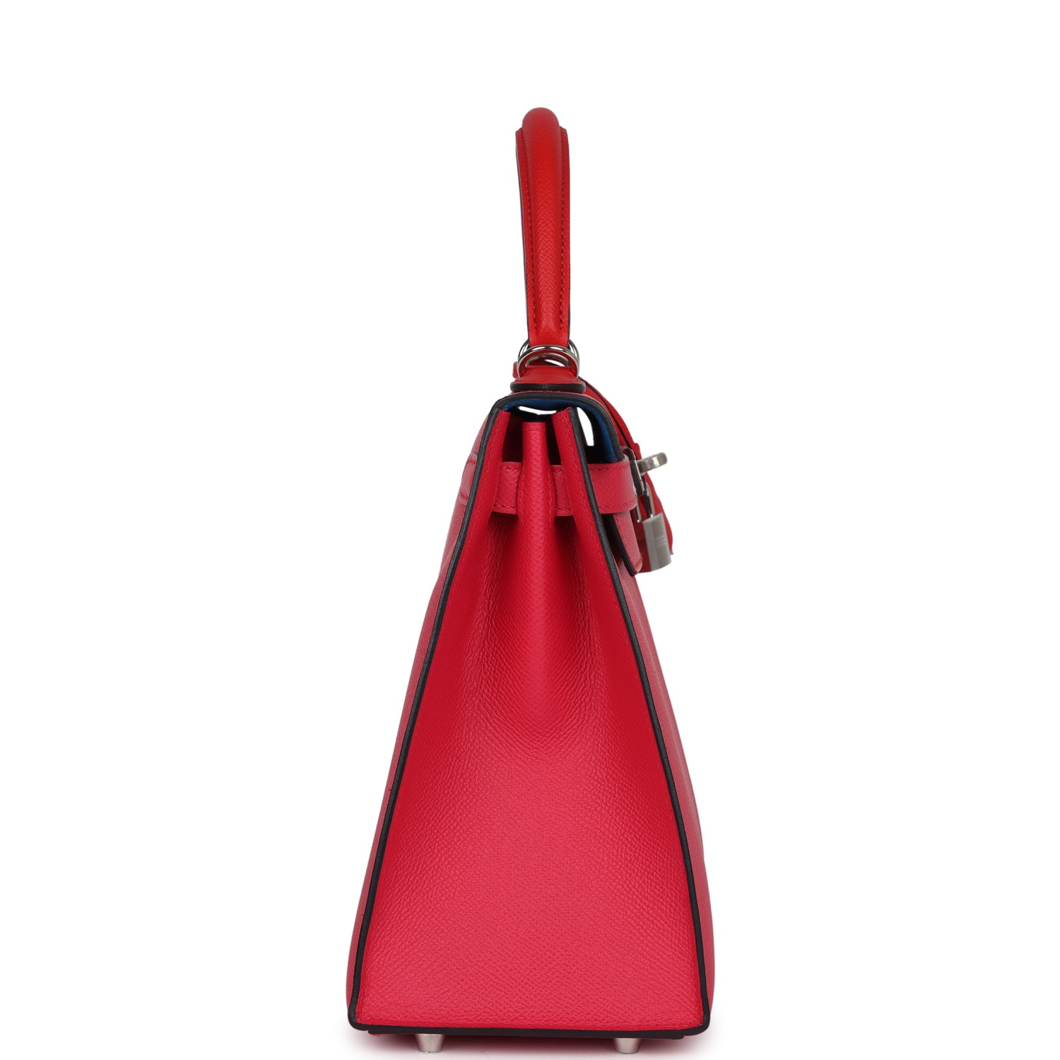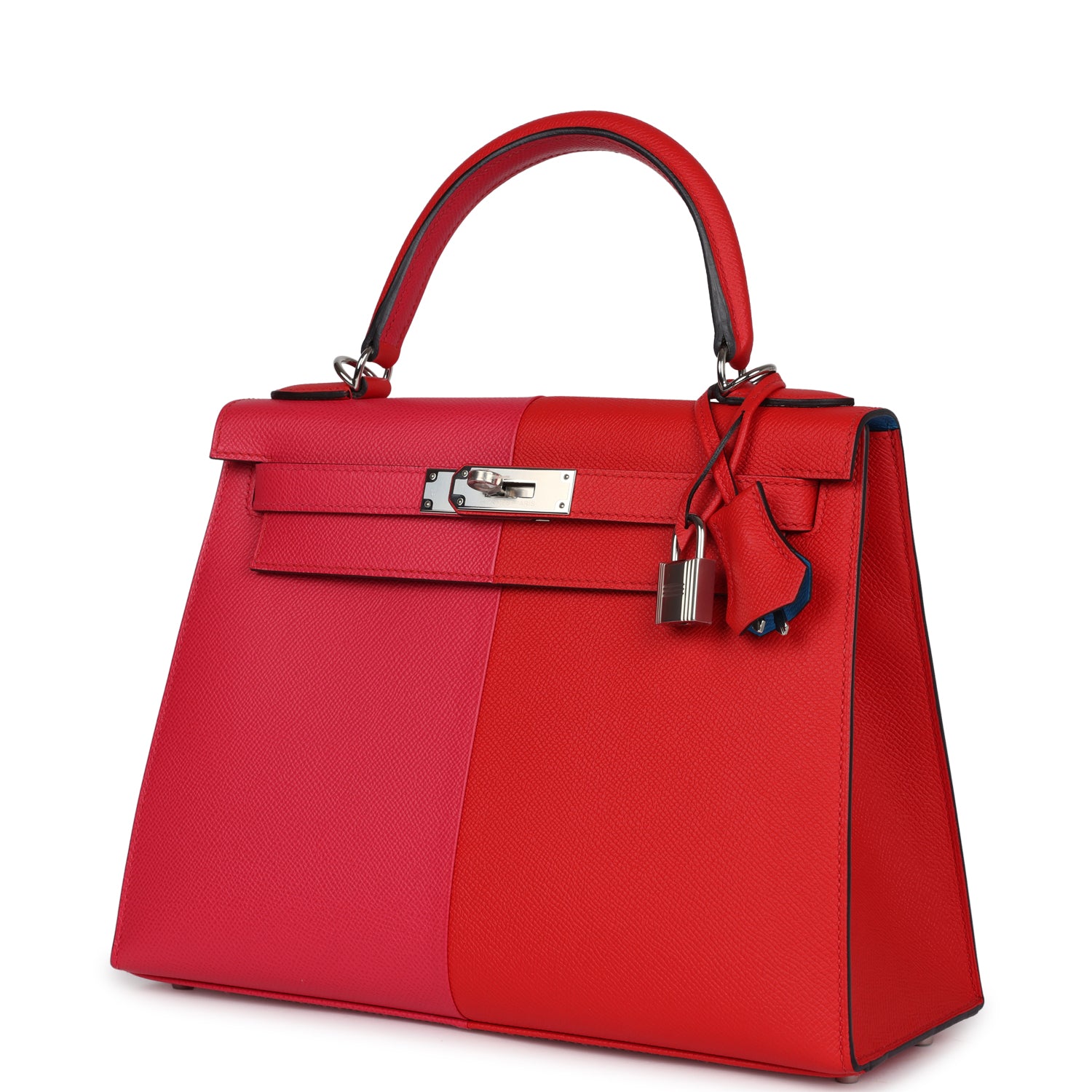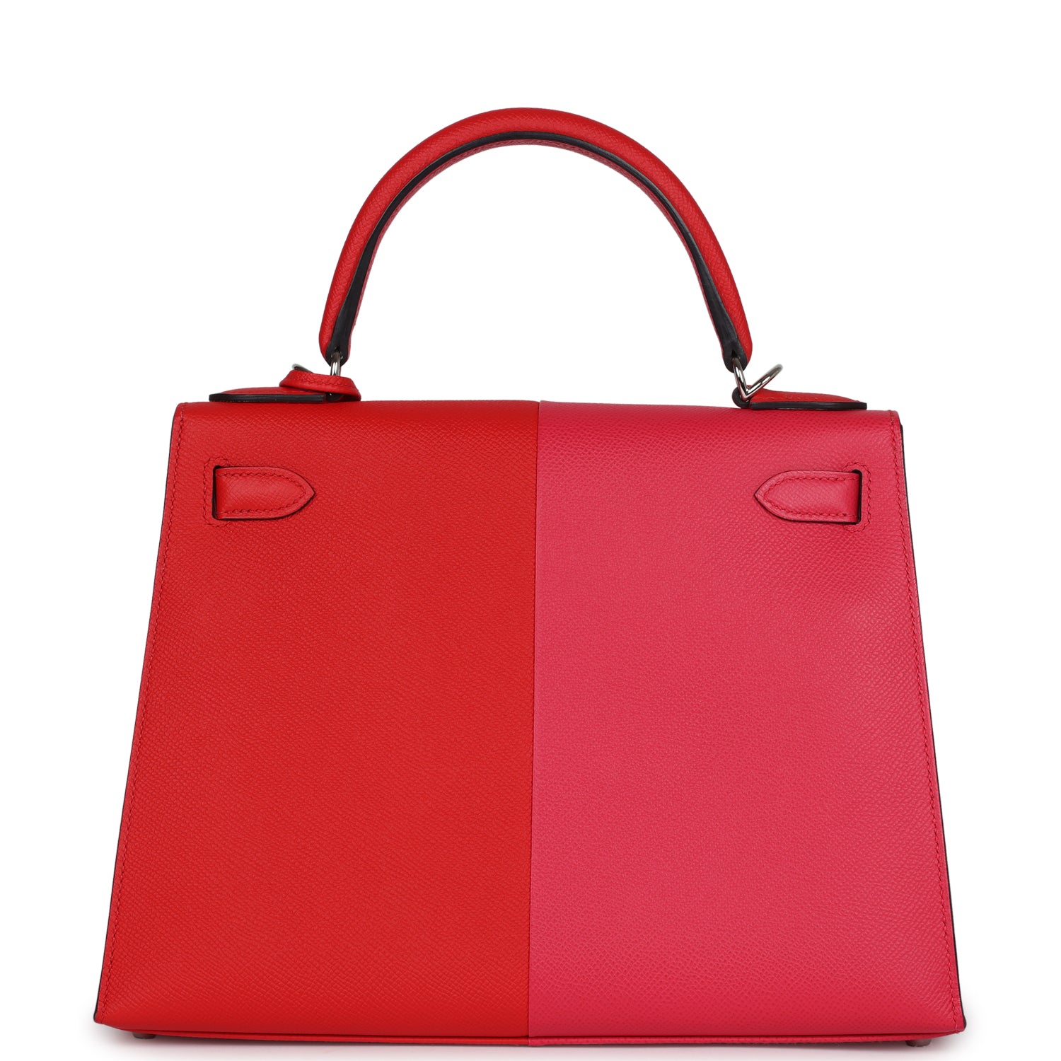 Casaque Kelly, in the Sellier style, is in Rouge De Coeur and Rose Extreme epsom leather with palladium hardware and has tonal stitching, front flap, two straps with center toggle closure, clochette with lock and two keys, single rolled handle and removable shoulder strap.