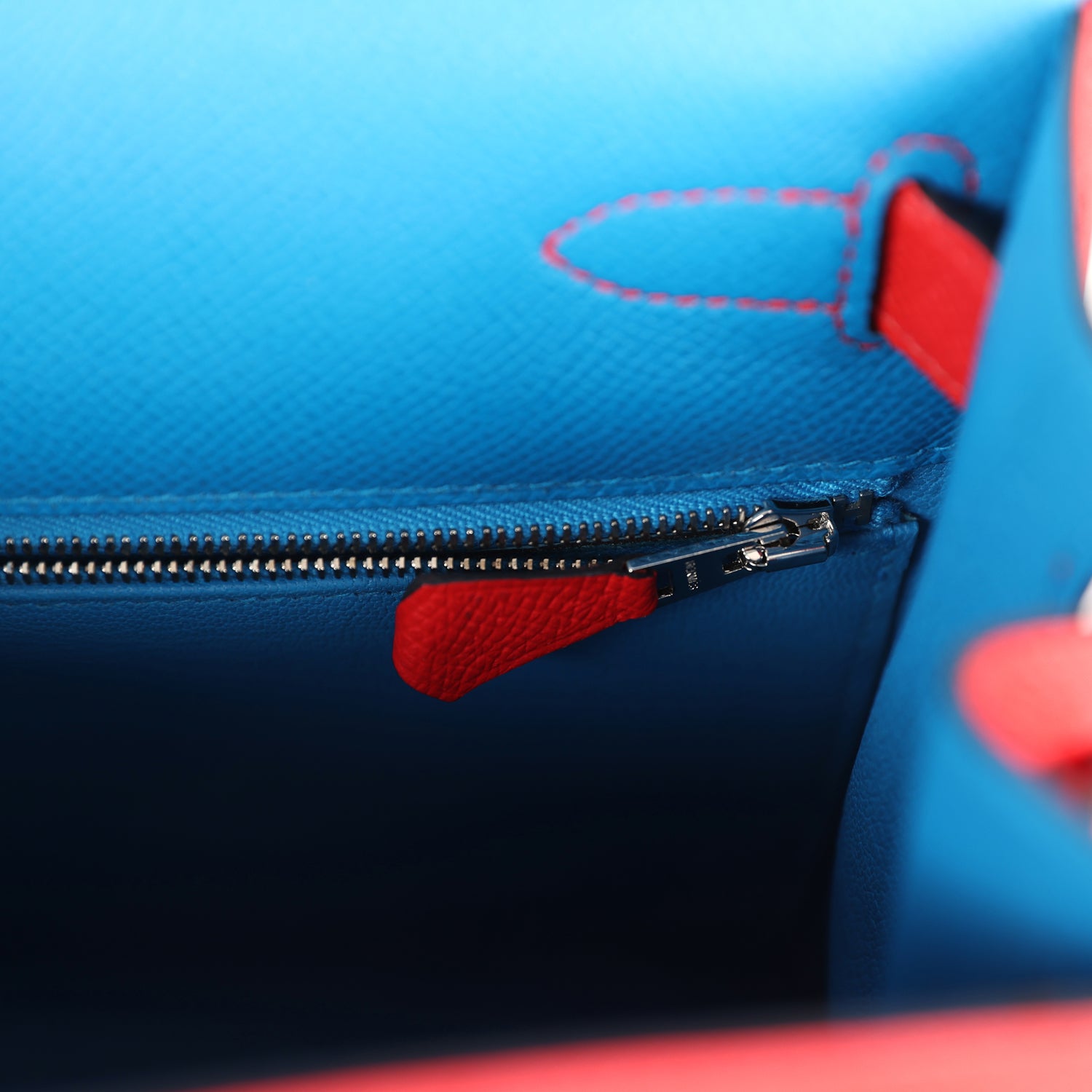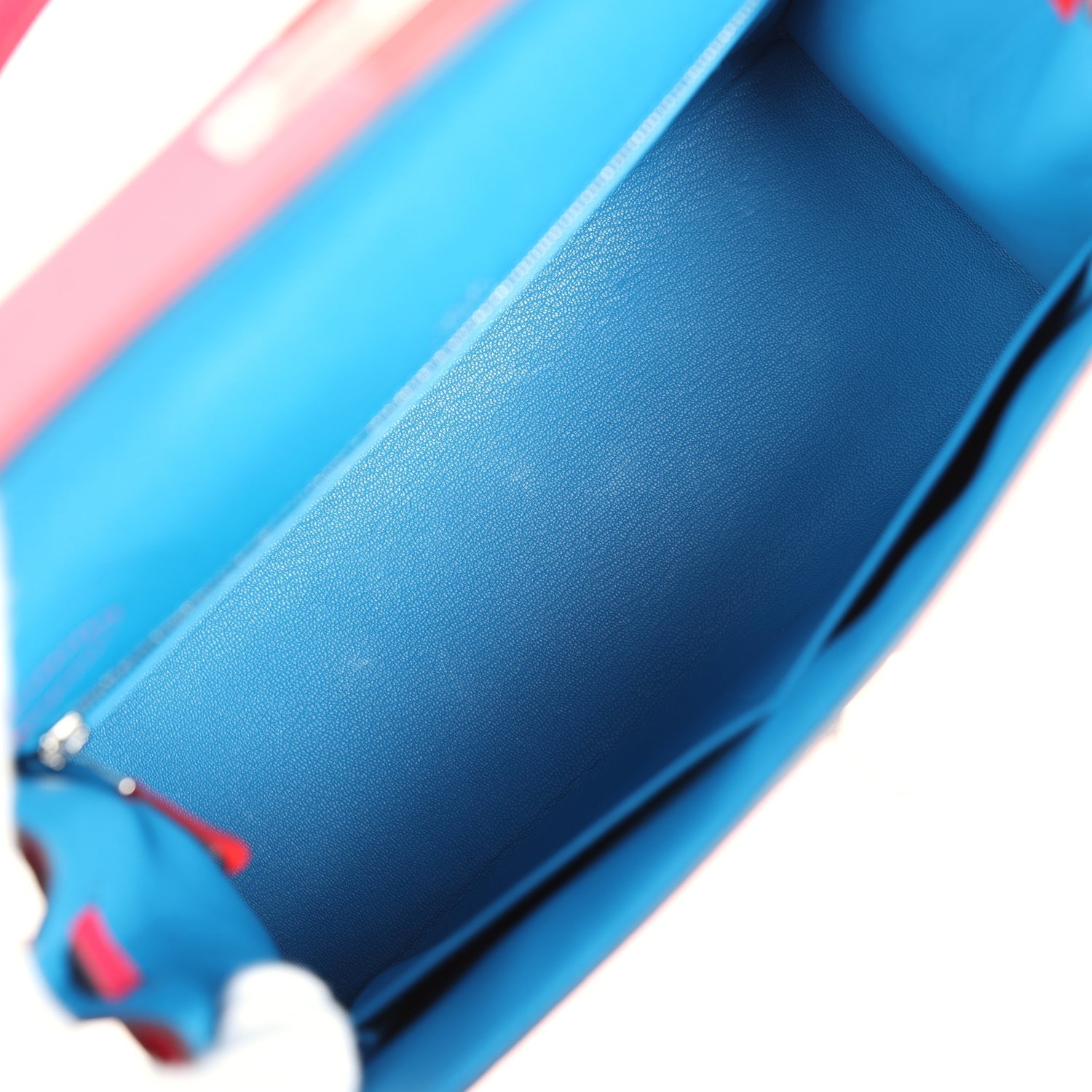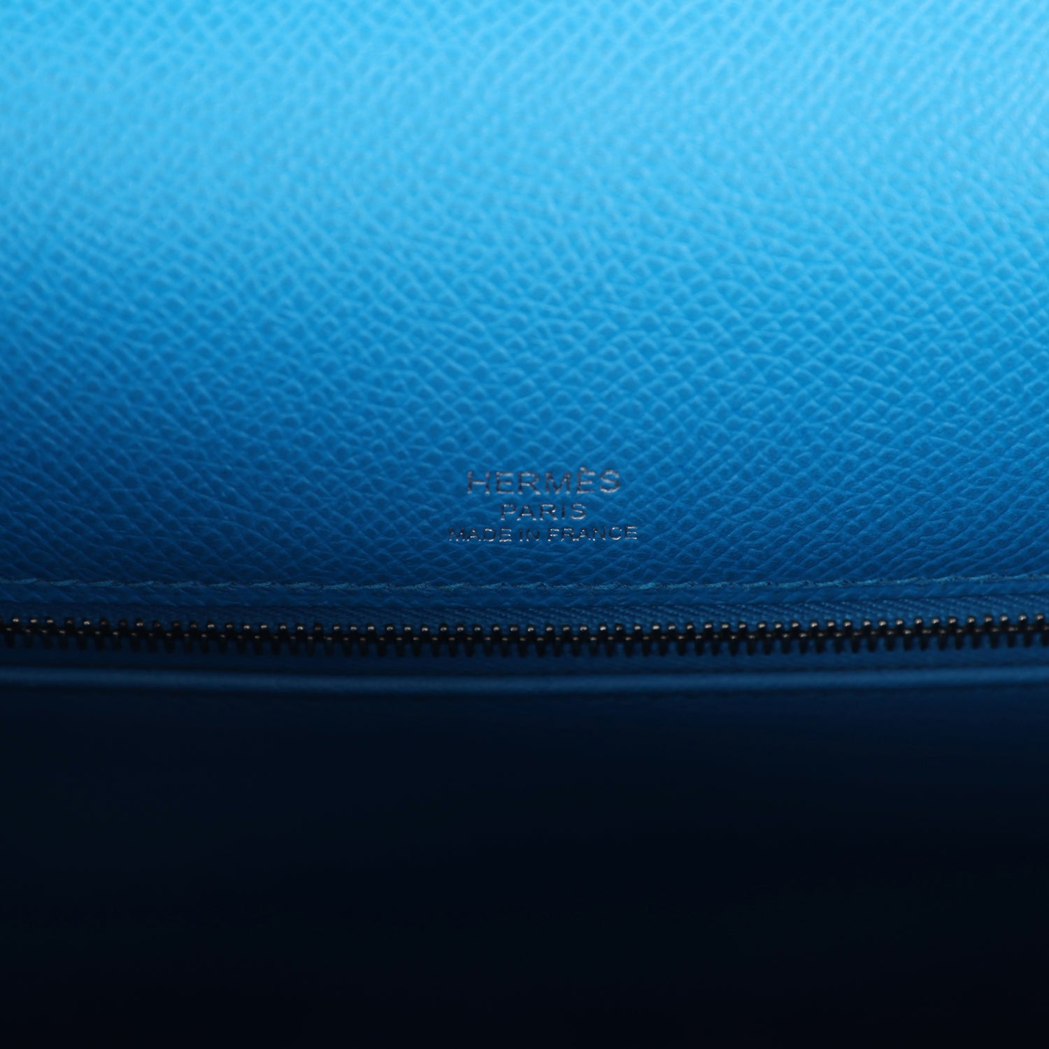 The interior is lined in Blue Zanzibar chevre and has one zip pocket with Hermes engraved pull and two open pockets on the opposite side.