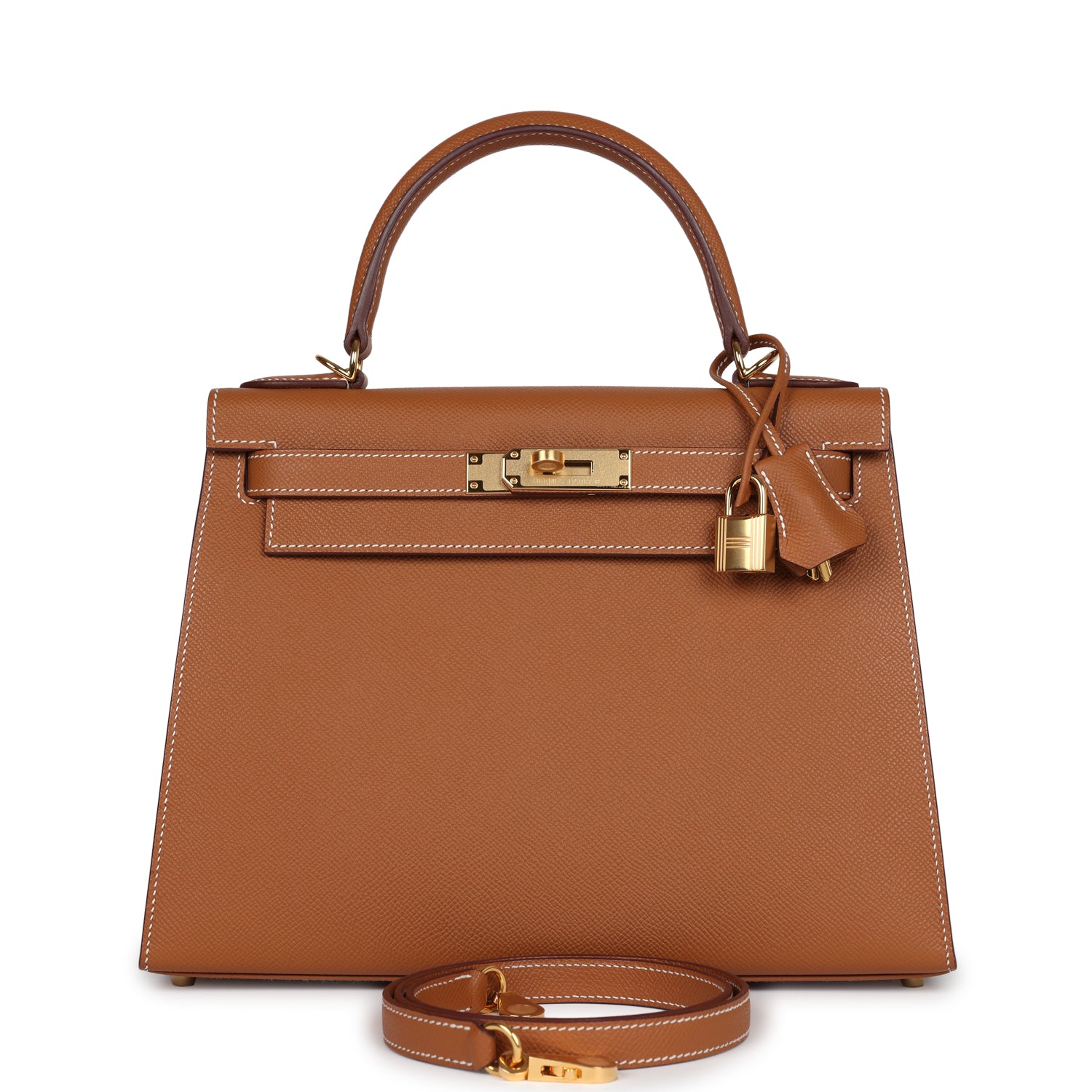 This Kelly, in the Sellier style, is in Gold epsom leather with gold hardware and has contrast stitching, front flap, two straps with center toggle closure, clochette with lock and two keys, single rolled handle and removable shoulder strap.