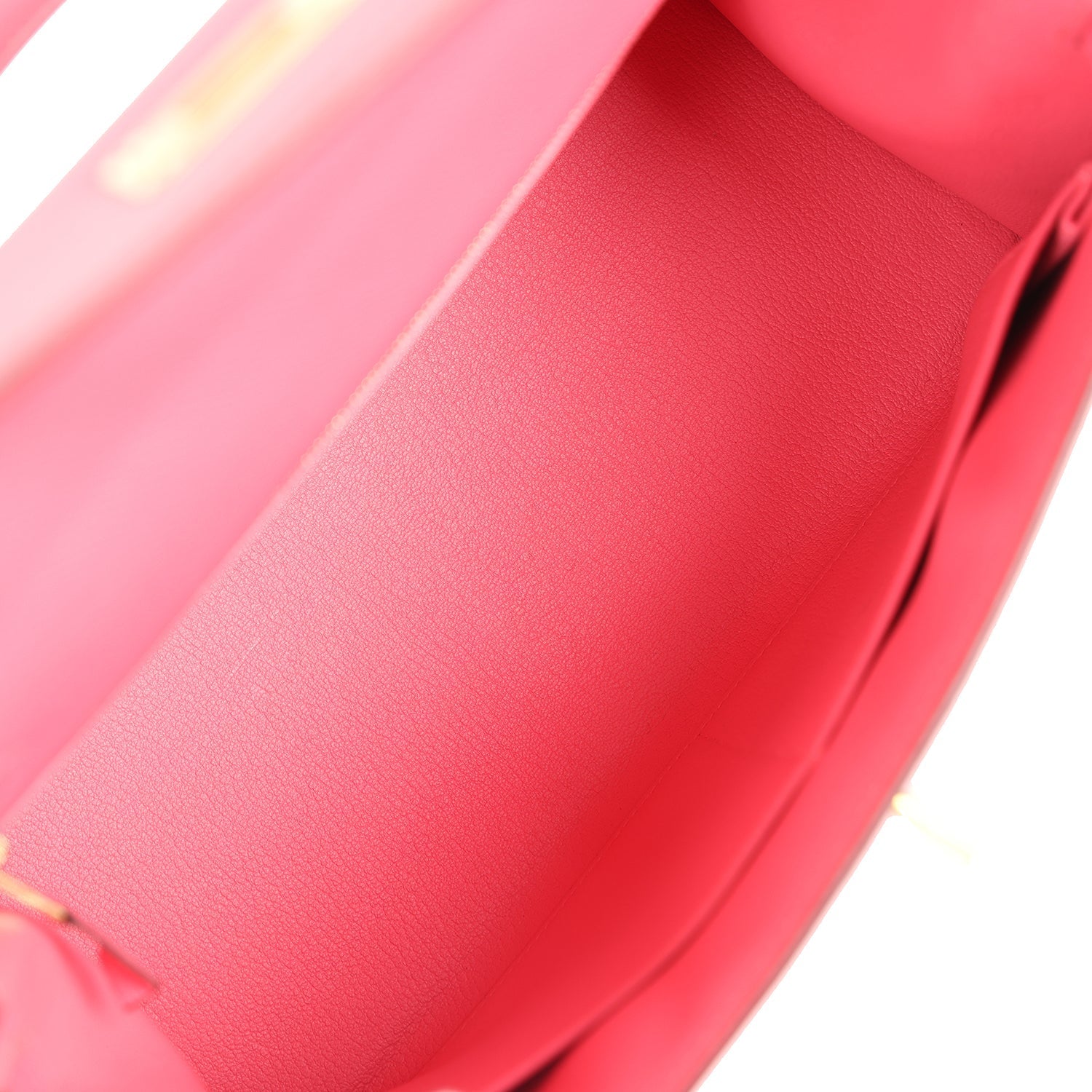 The interior is lined with Rose Azalee chevre leather and has one zip pocket with an Hermes engraved pull and two open pockets on the opposite side.