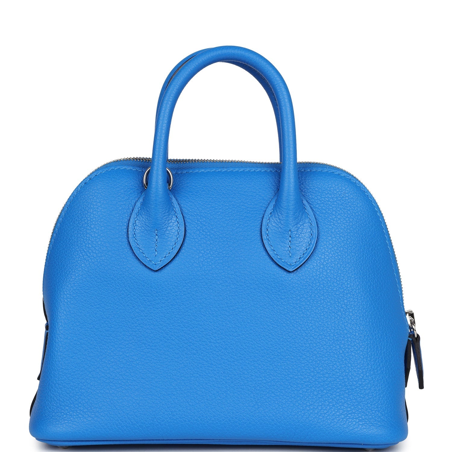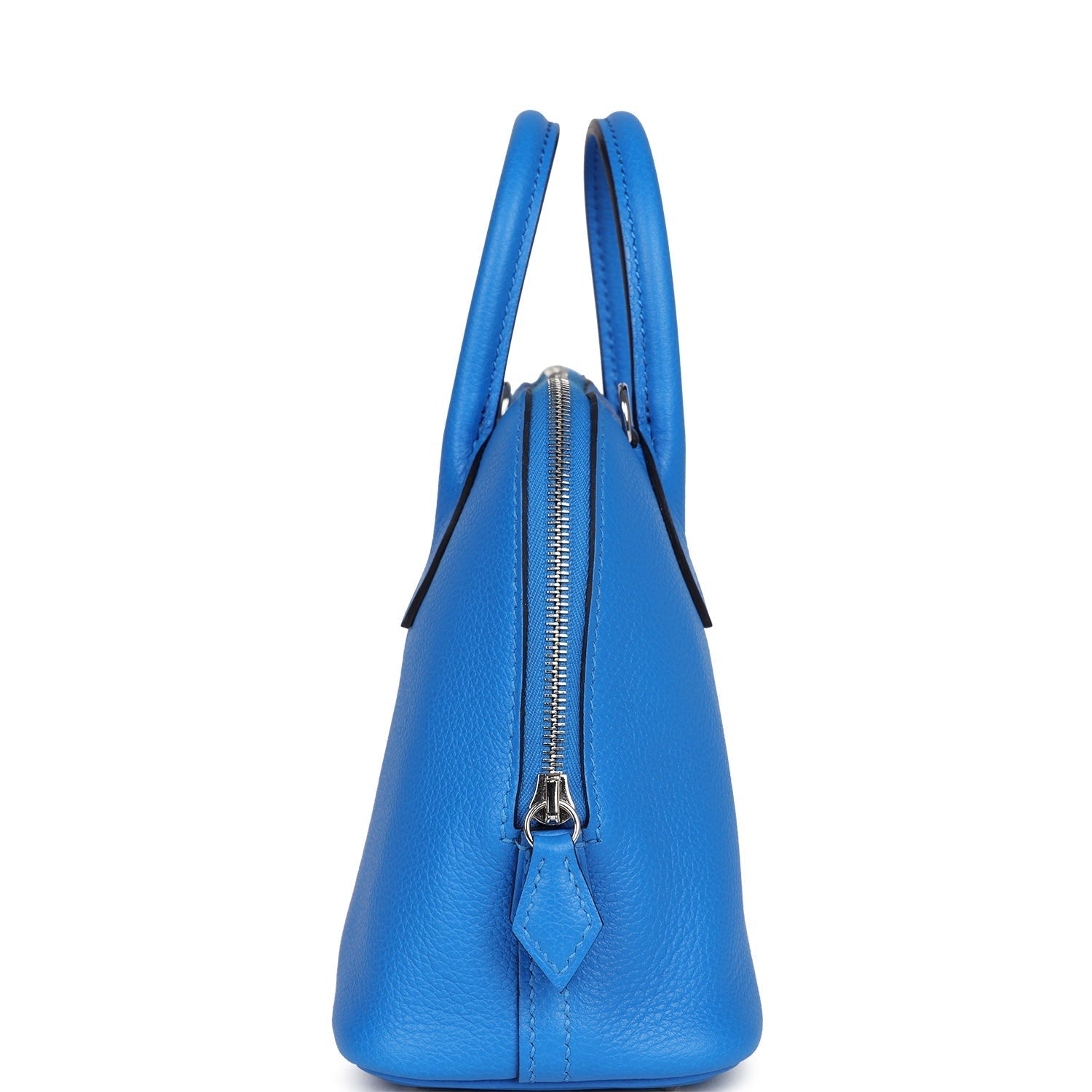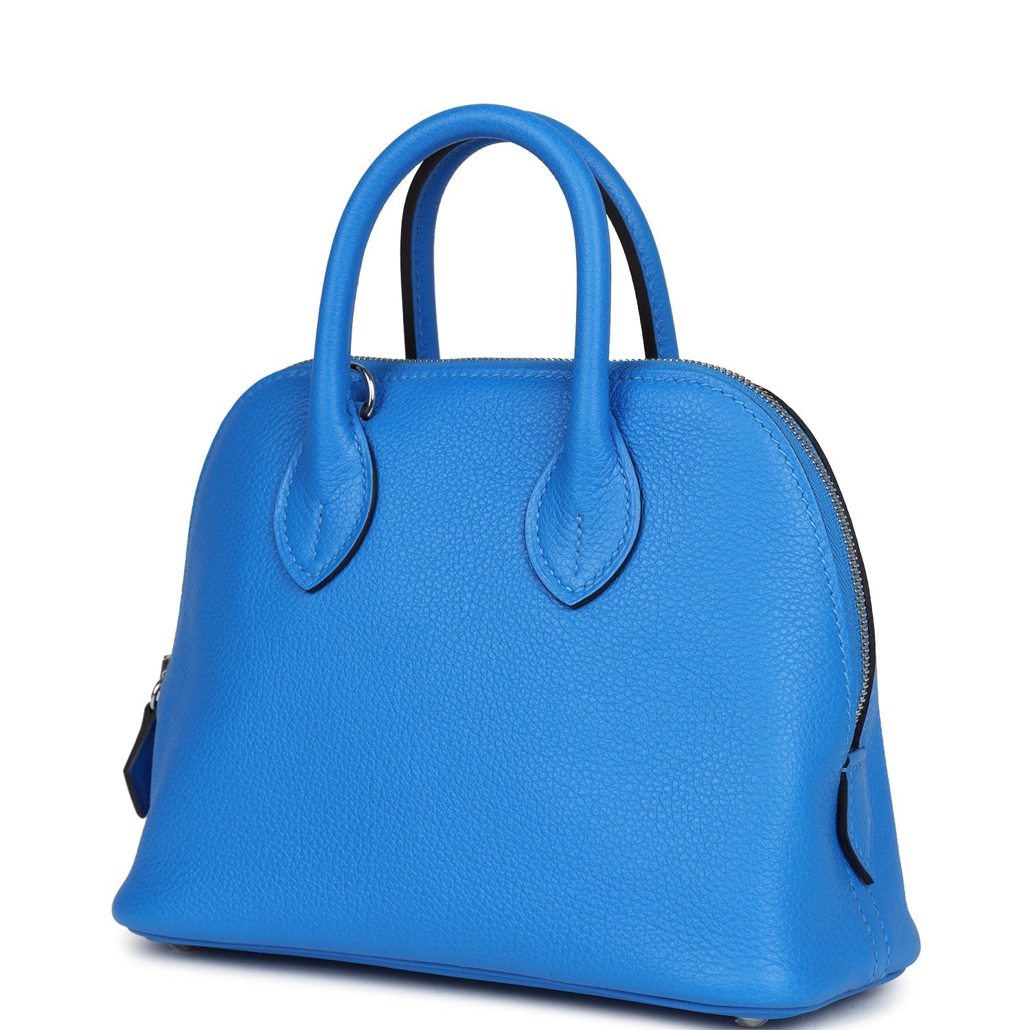 This Mini Bolide is in Bleu France evercolor leather with palladium hardware, has tonal stitching, a top zipper closure, double rolled handles and a removable shoulder strap.