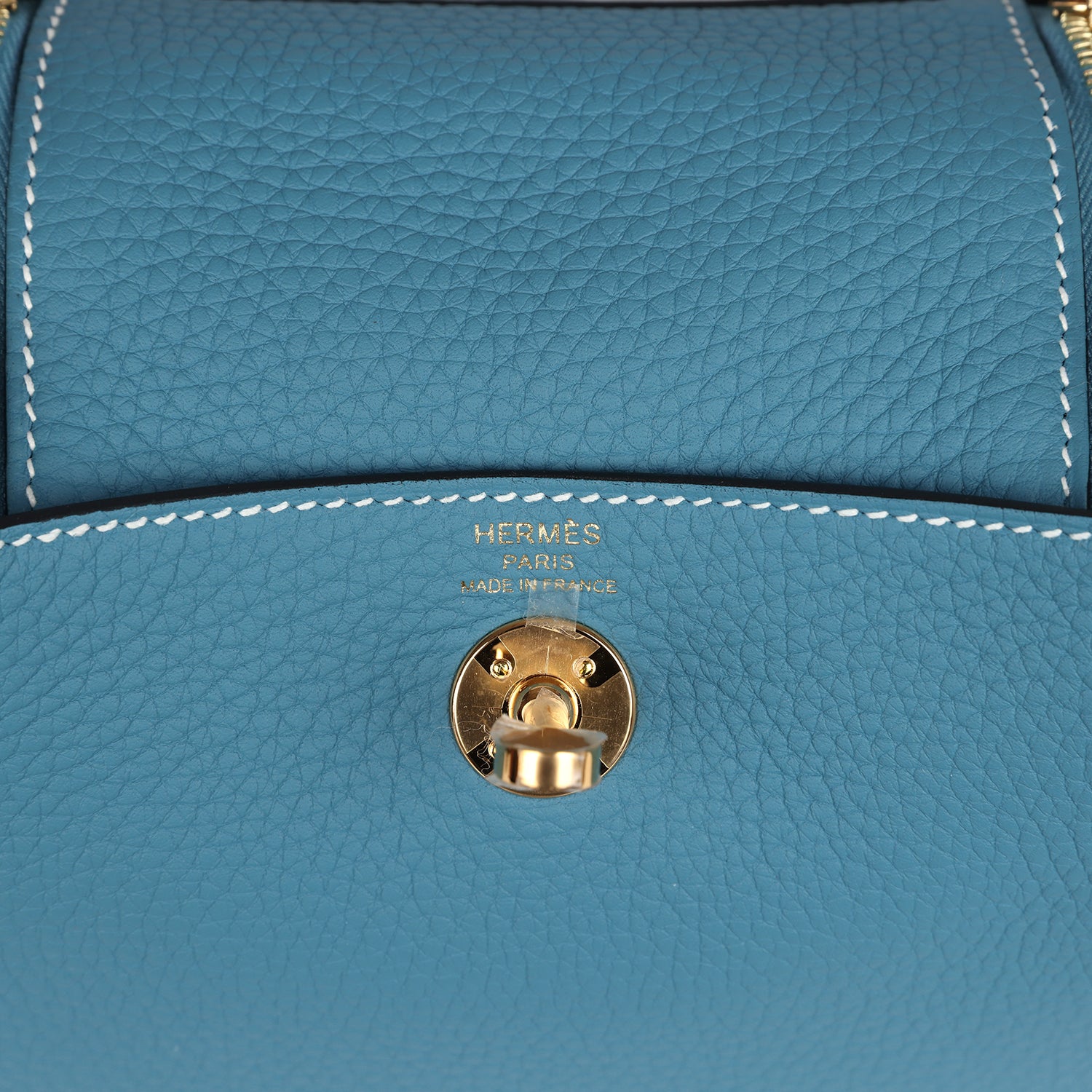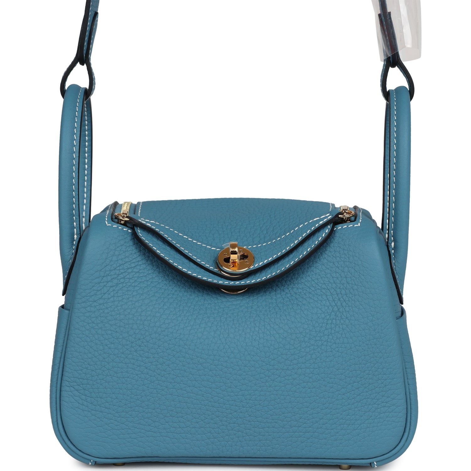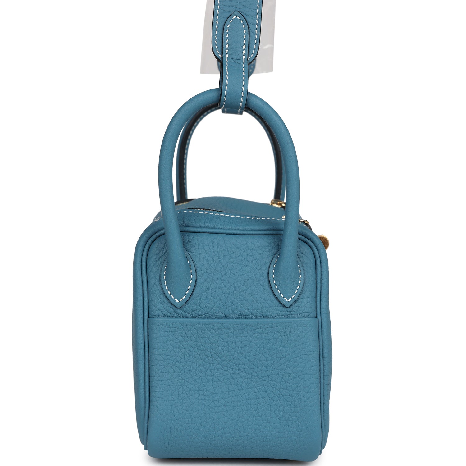 This Mini Lindy is in Blue Jean clemence leather with gold hardware and has contrast stitching, double zipper pulls, front Hermès twist lock, single pocket on each side, two rolled top handles linked by a flat shoulder strap.
