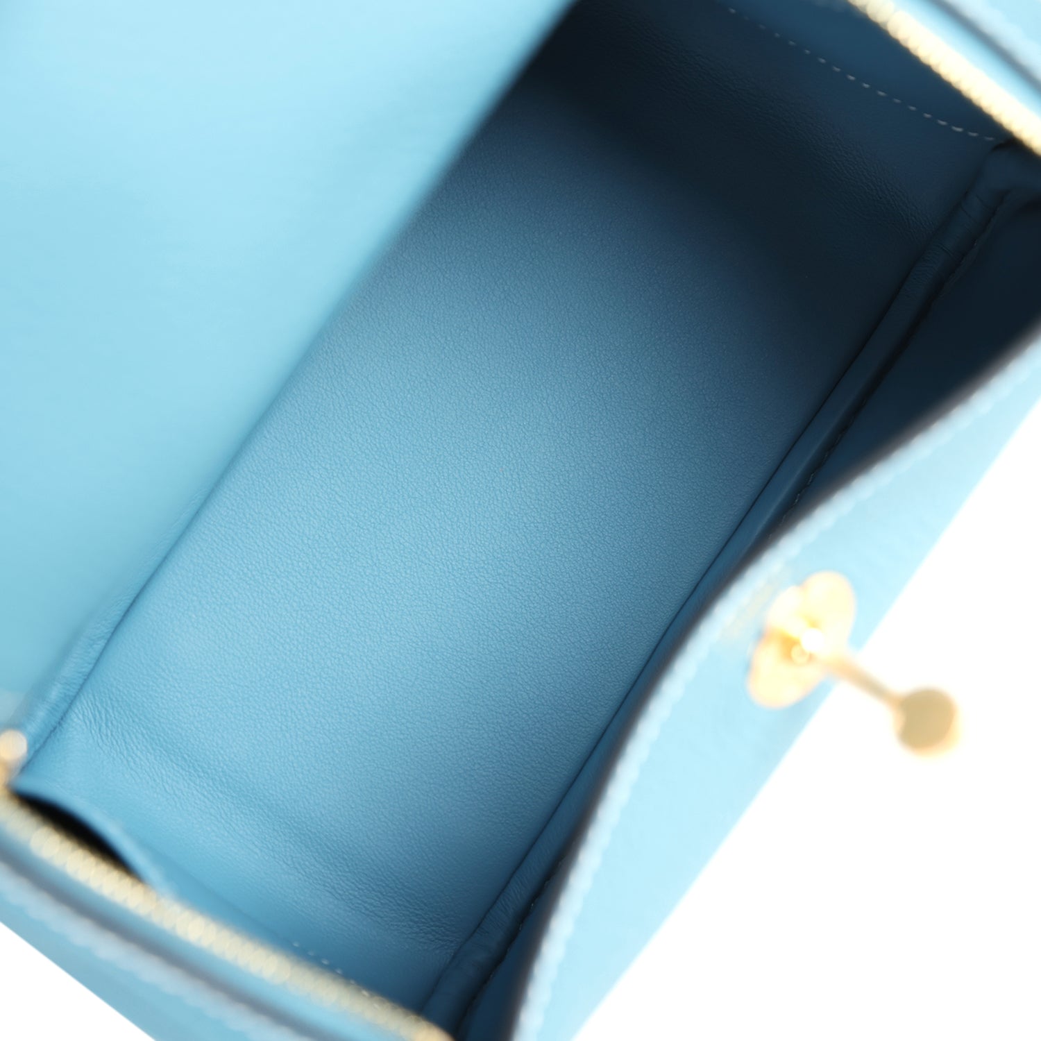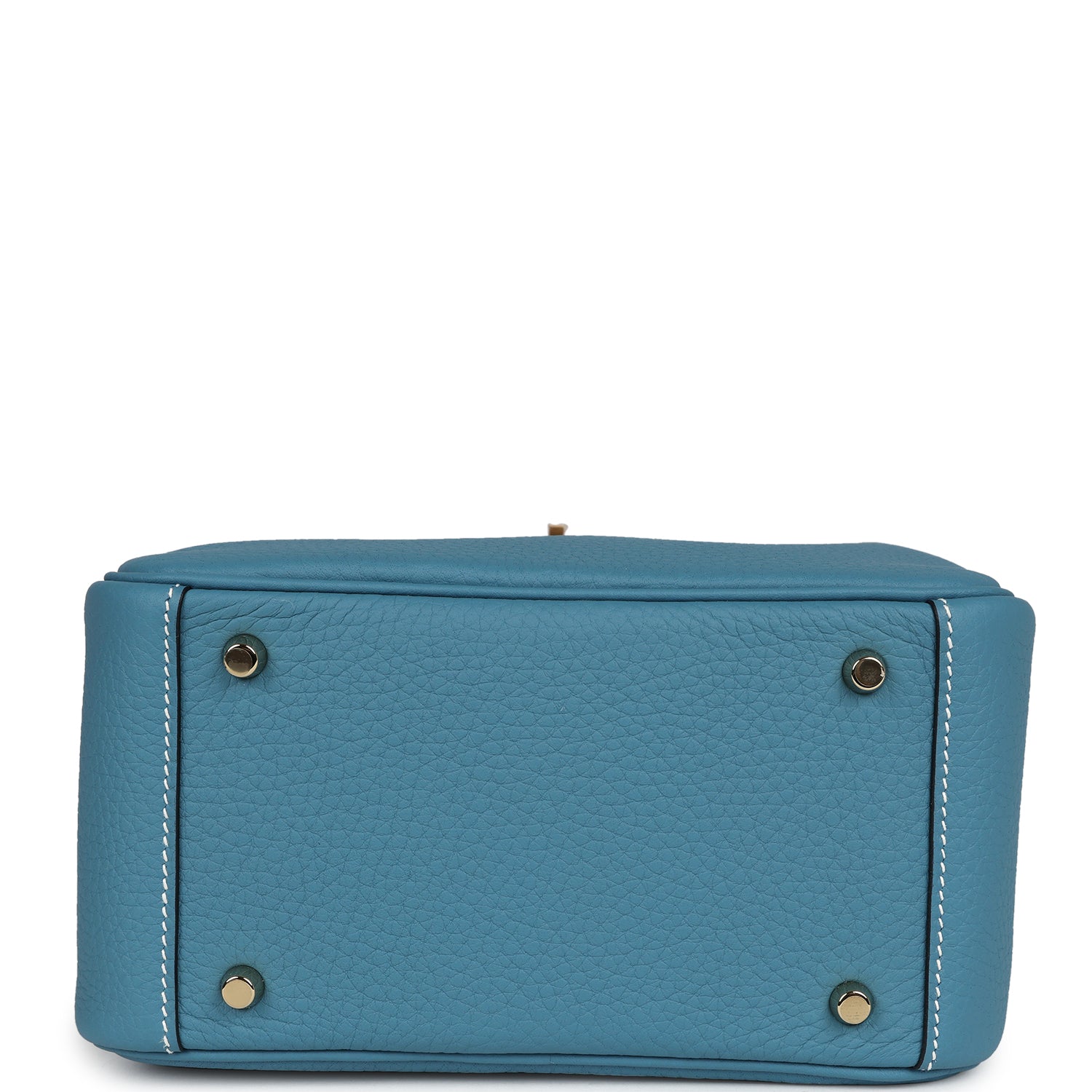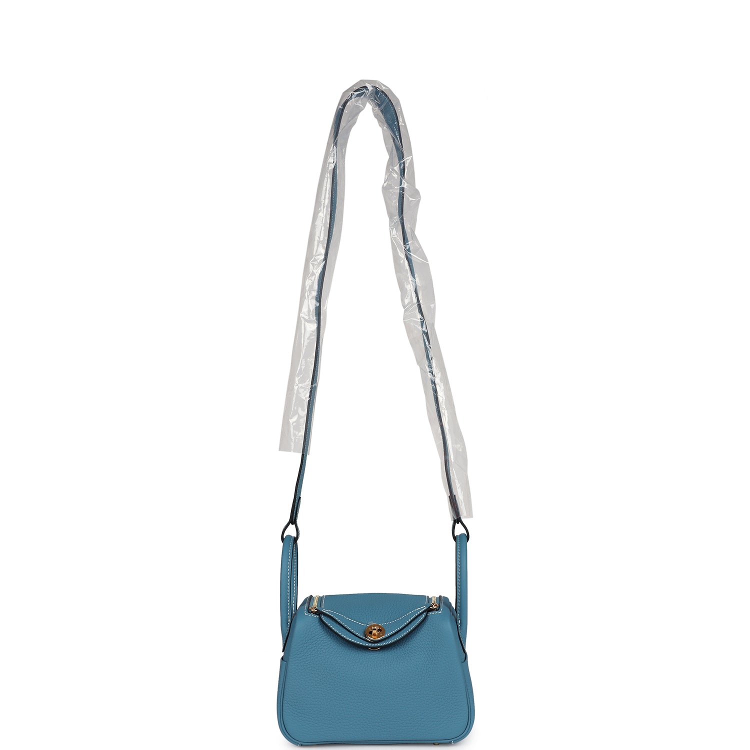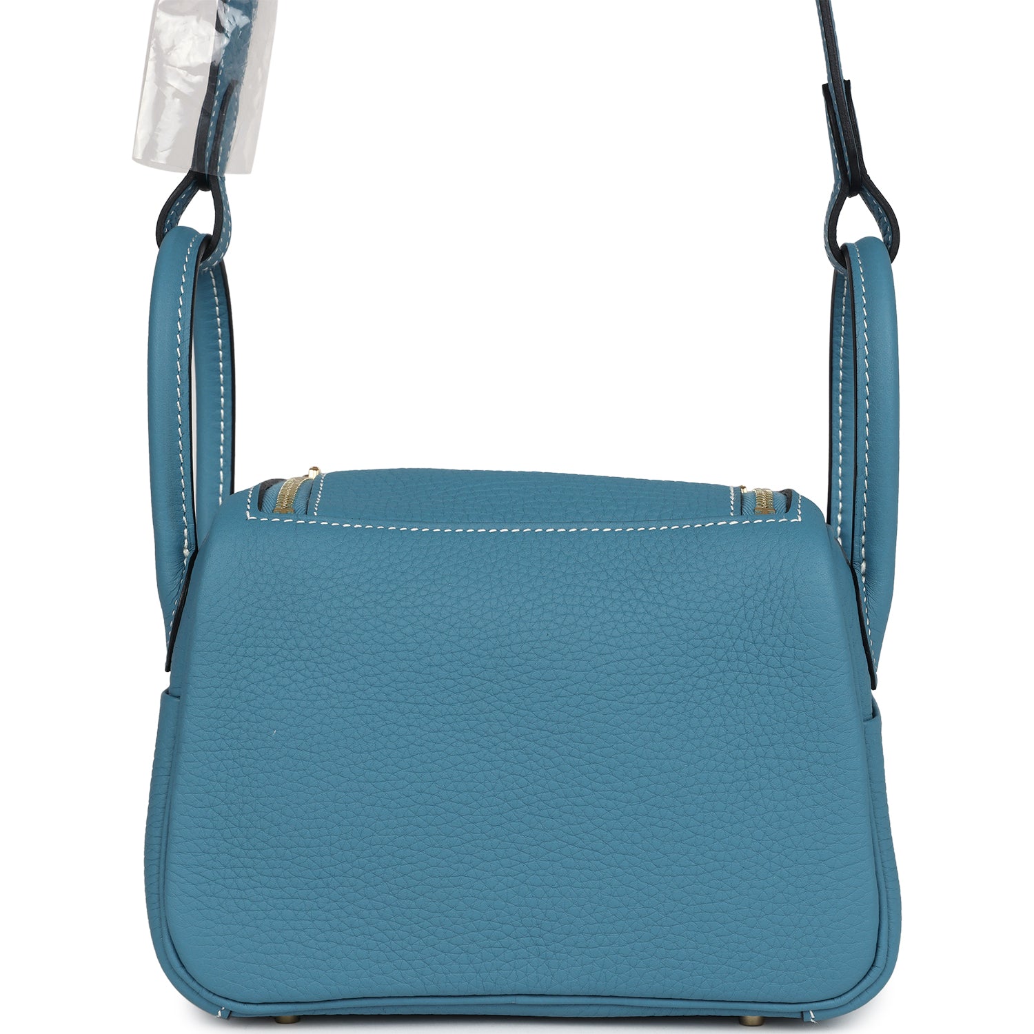This Mini Lindy is in Blue Jean clemence leather with gold hardware and has contrast stitching, double zipper pulls, front Hermès twist lock, single pocket on each side, two rolled top handles linked by a flat shoulder strap.