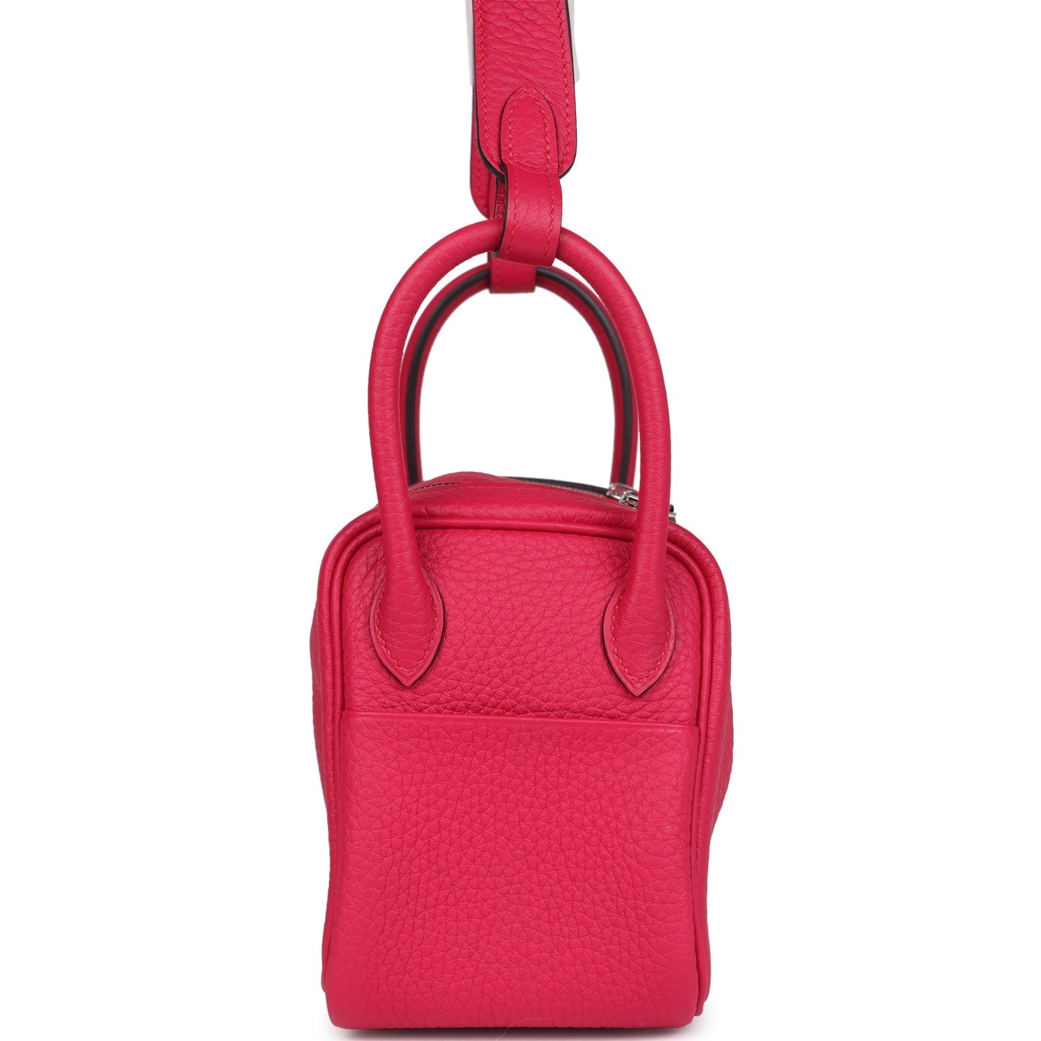 This Mini Lindy is in Framboise clemence leather with palladium hardware and has tonal stitching, double zipper pulls, front Hermès twist lock, single pocket on each side, two rolled top handles linked by a flat shoulder strap.