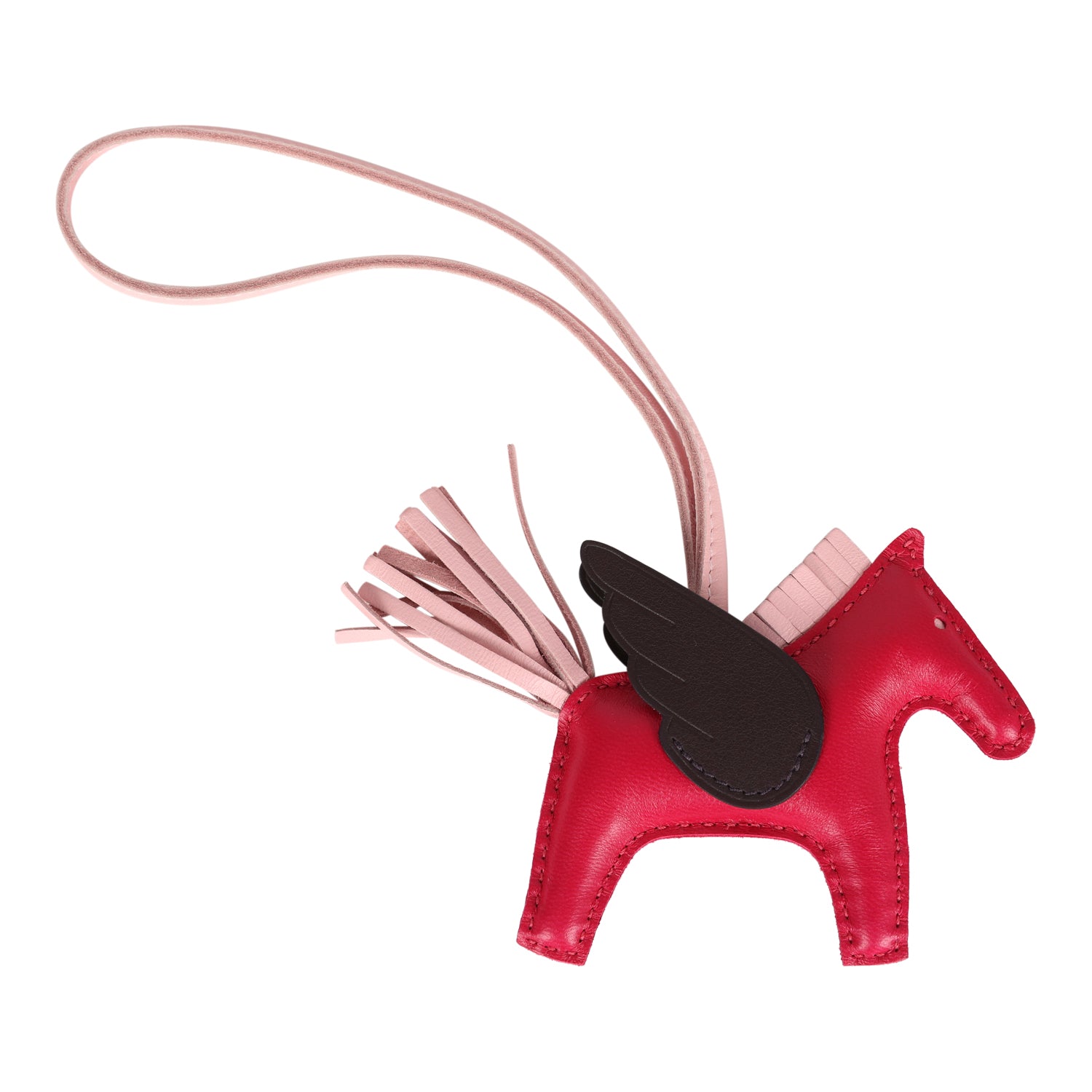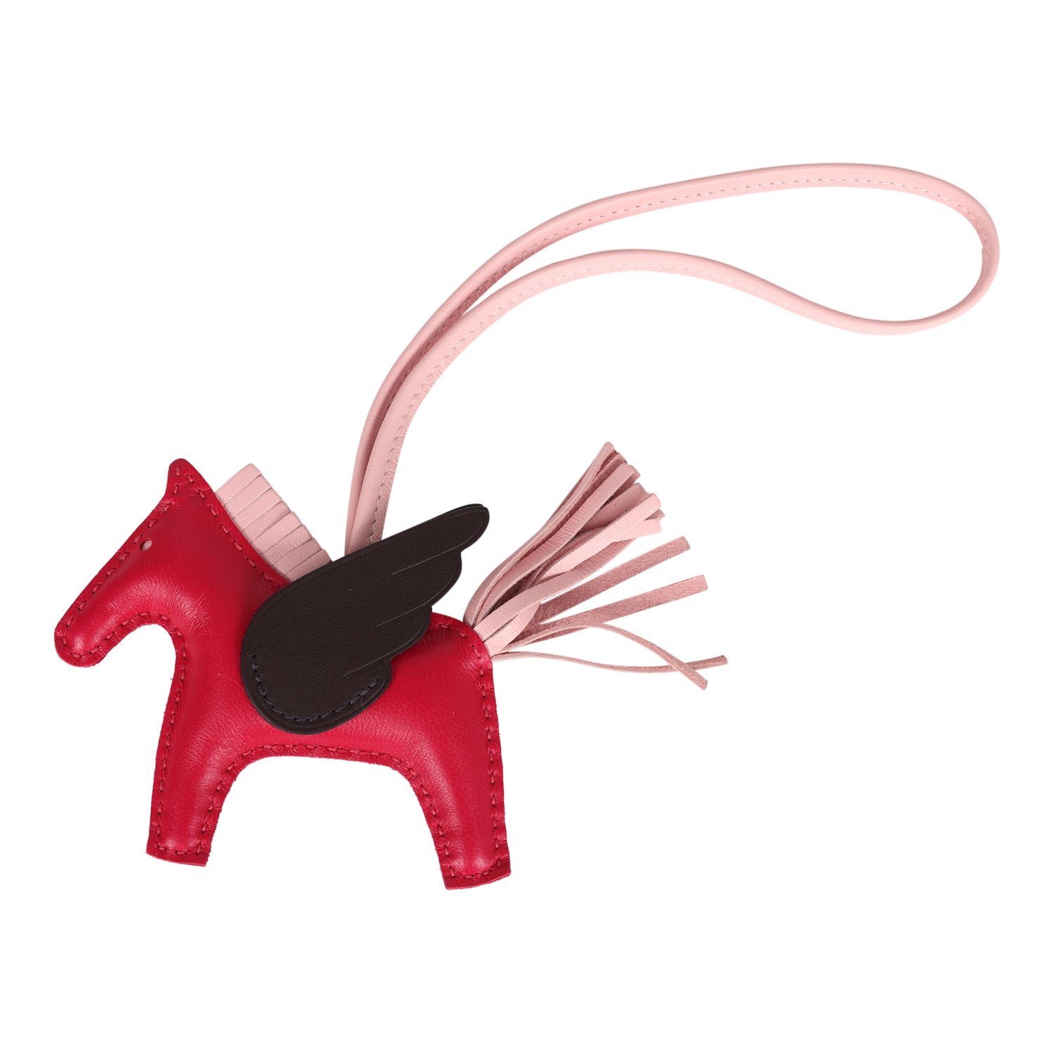 This Hermes Pegase Rodeo bag charm PM is in Framboise, Rose Sakura and Rouge Sellier swift and Milo lambskin leather and is accented with Rose Sakura mane, tail, eyes, loop and Rouge Sellier wings.