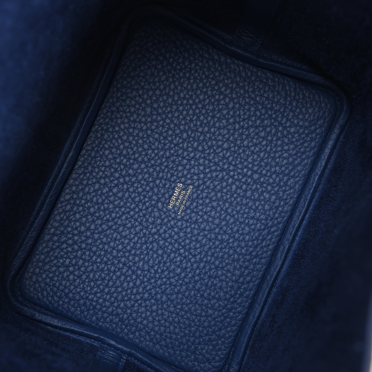 The interior is lined with Bleu Tie natural leather, no interior pockets and has a pull through closure secured by padlock.