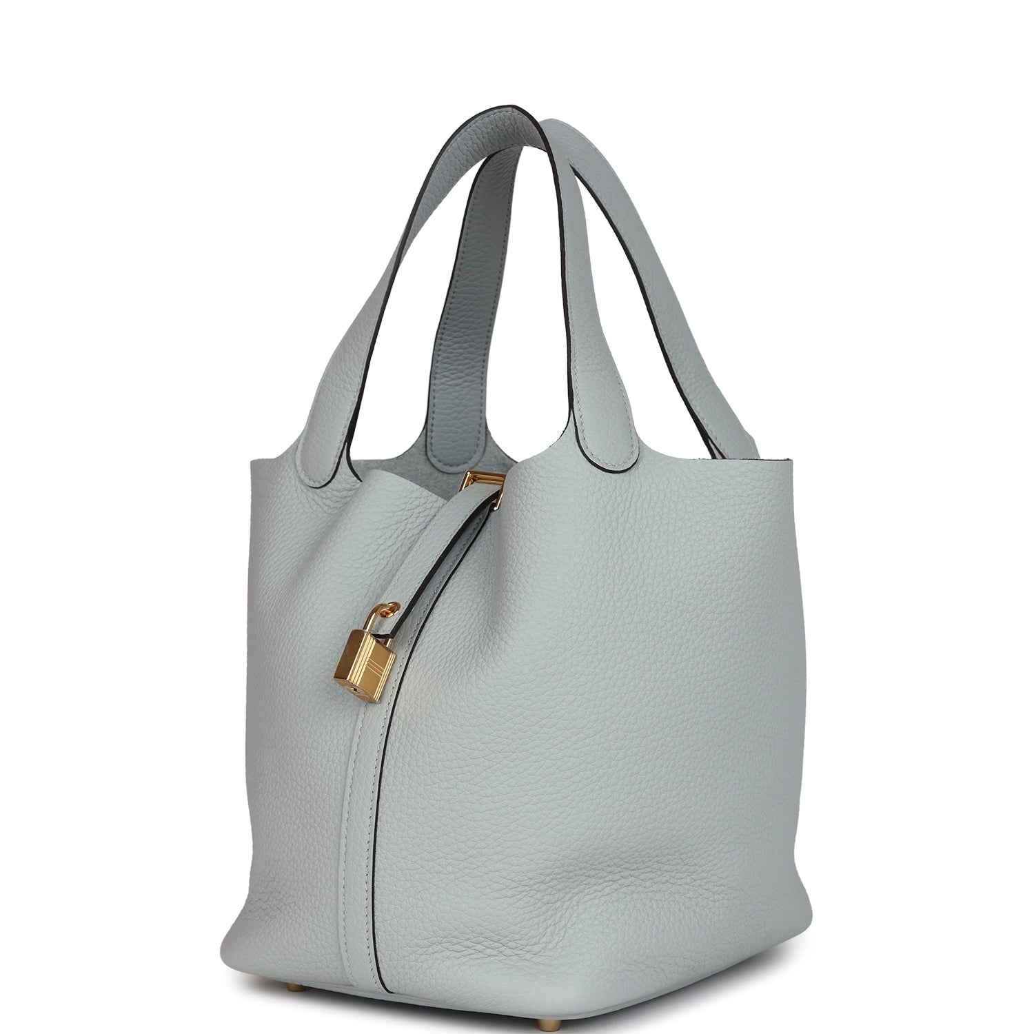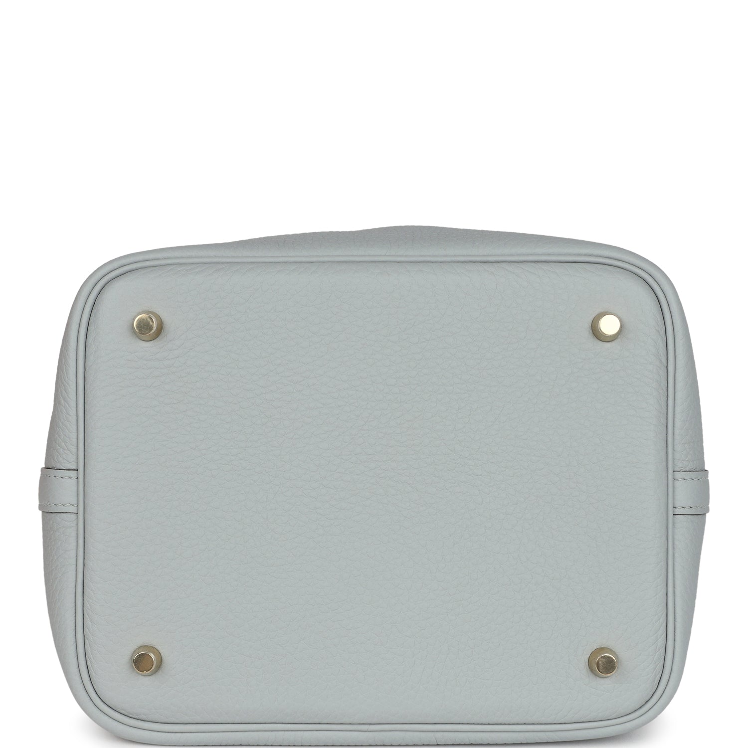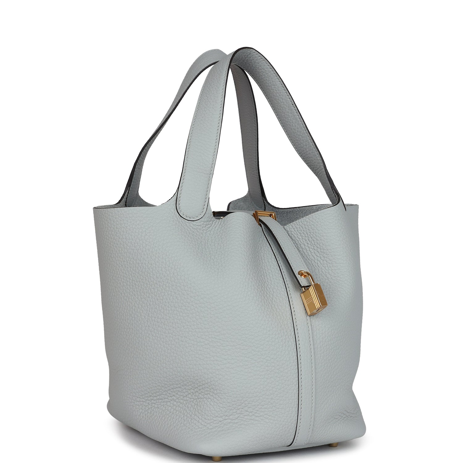 This Picotin is in Bleu Glacier clemence leather with gold hardware and has tonal stitching with two top handles.