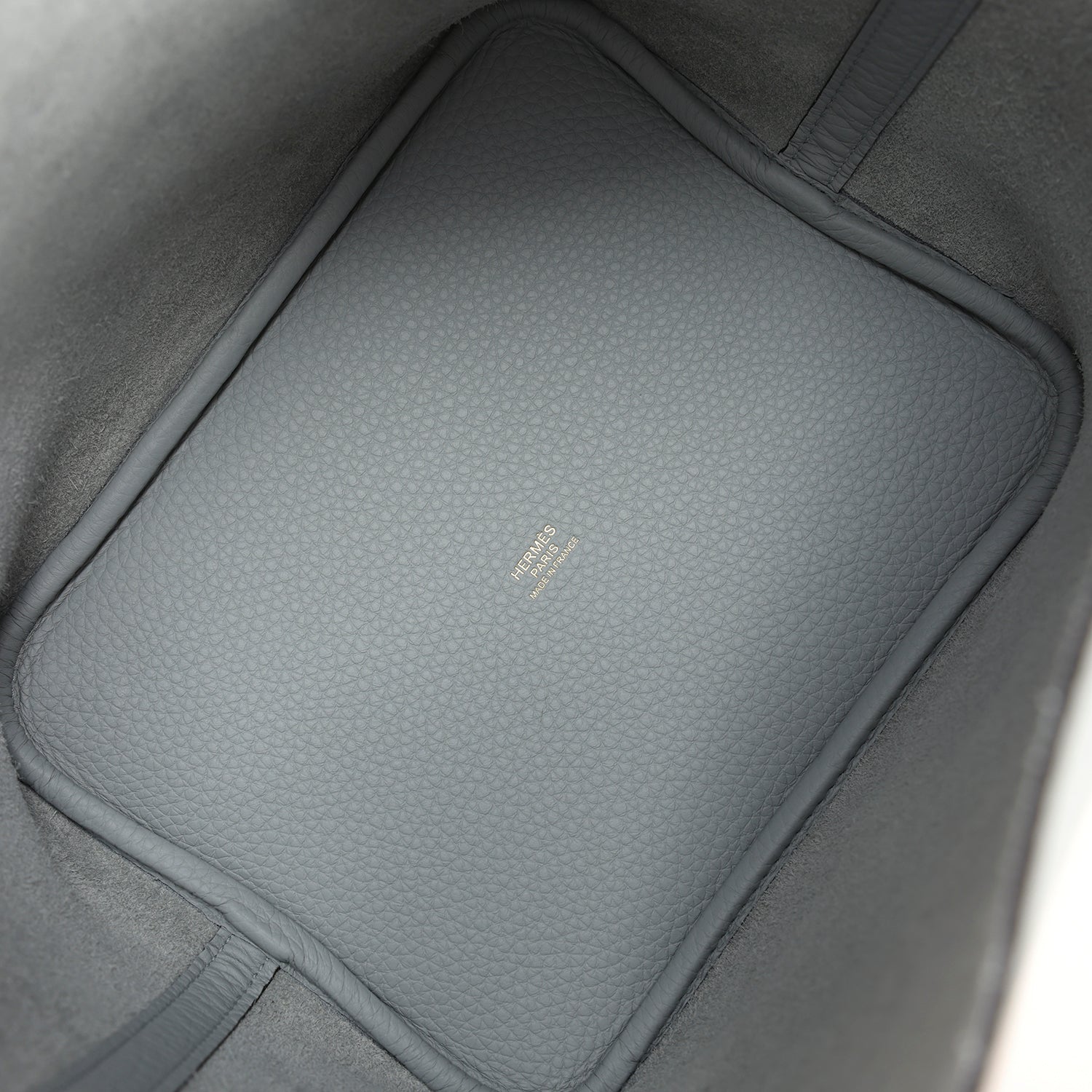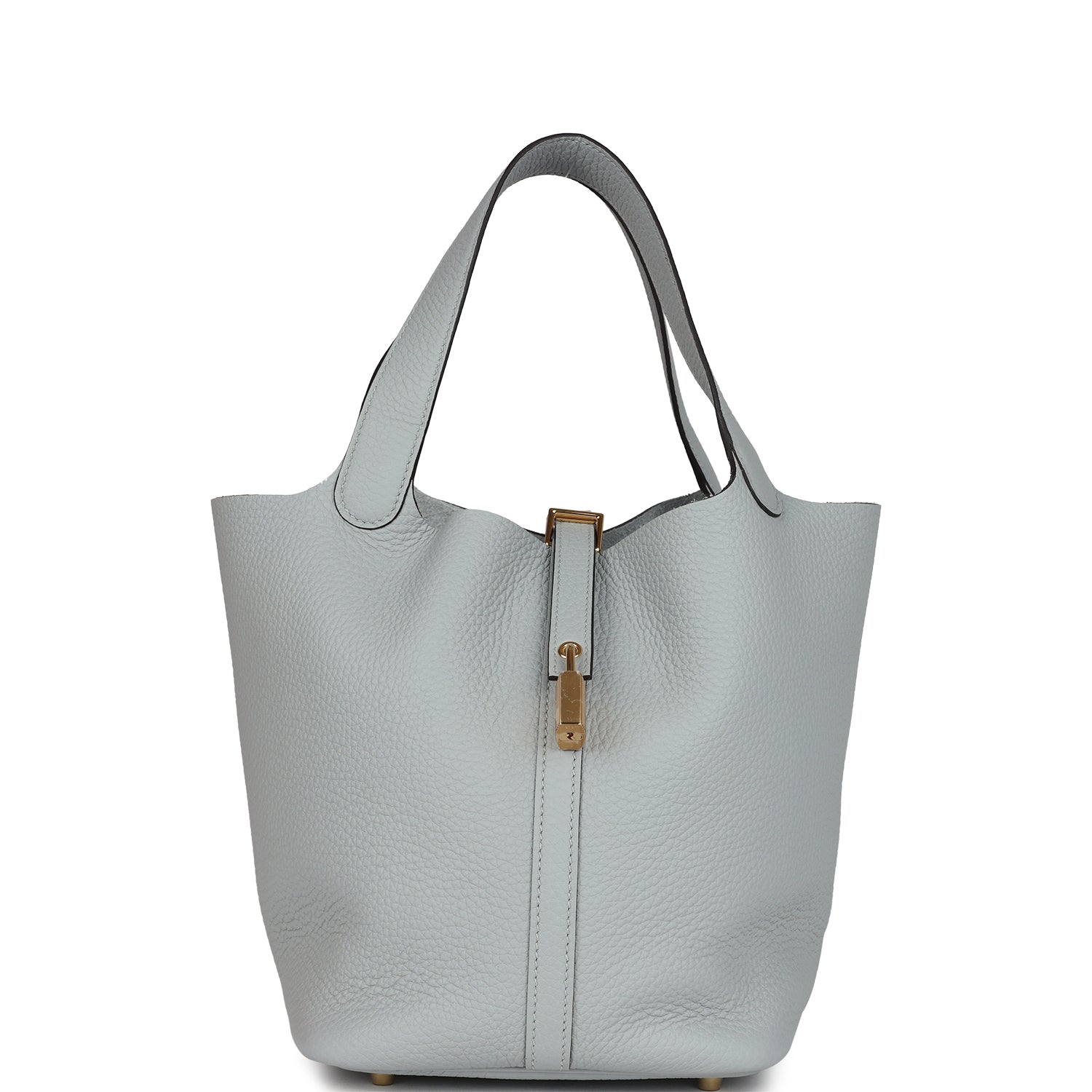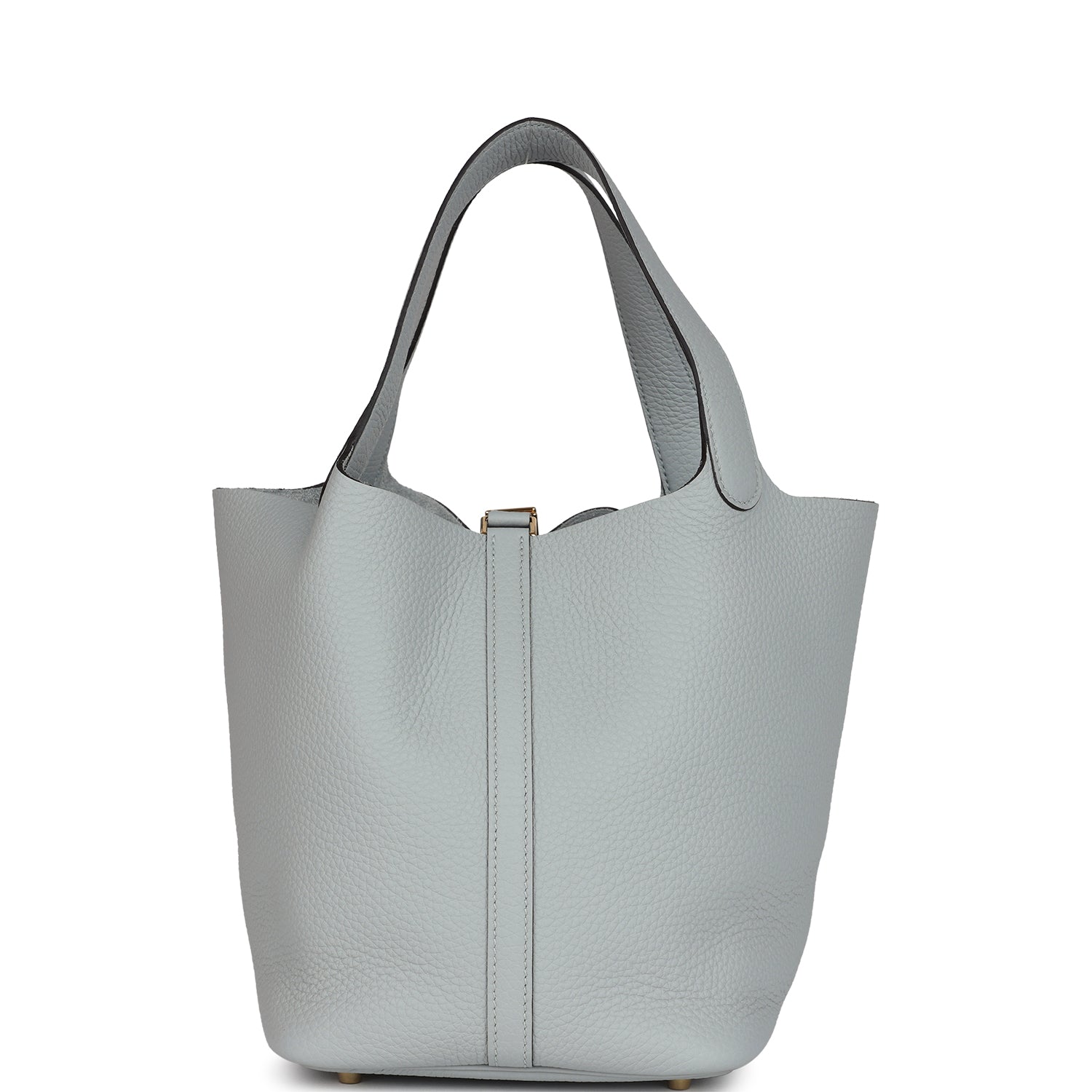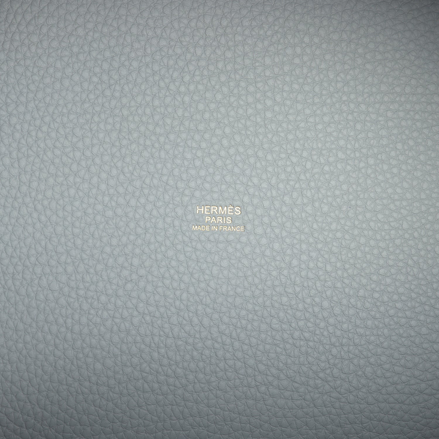 This Picotin is in Bleu Glacier clemence leather with gold hardware and has tonal stitching with two top handles.