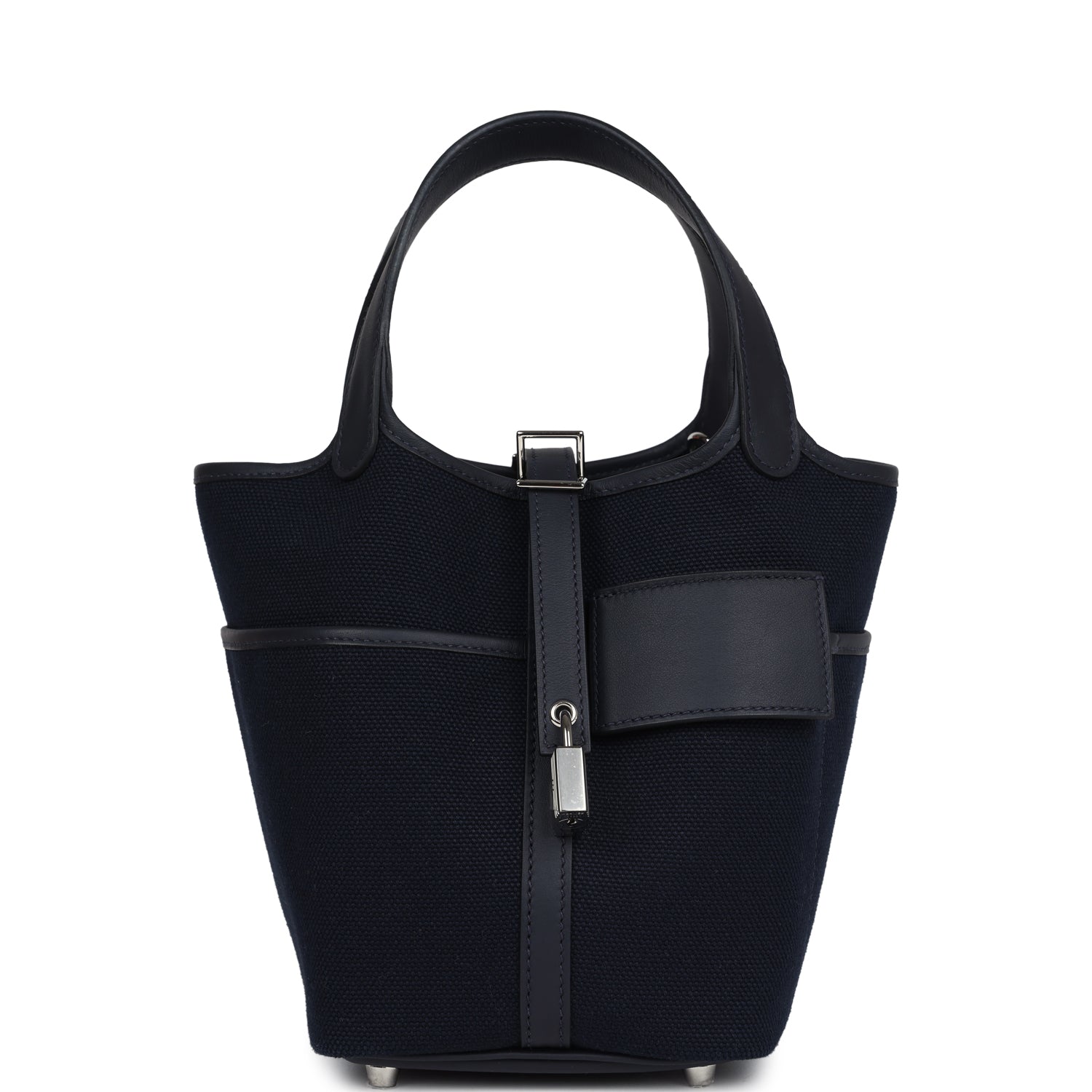 This Cargo Picotin Lock is in Bleu Marine swift leather and Caban toile with palladium hardware and has tonal stitching, four exterior pockets with two top handles.