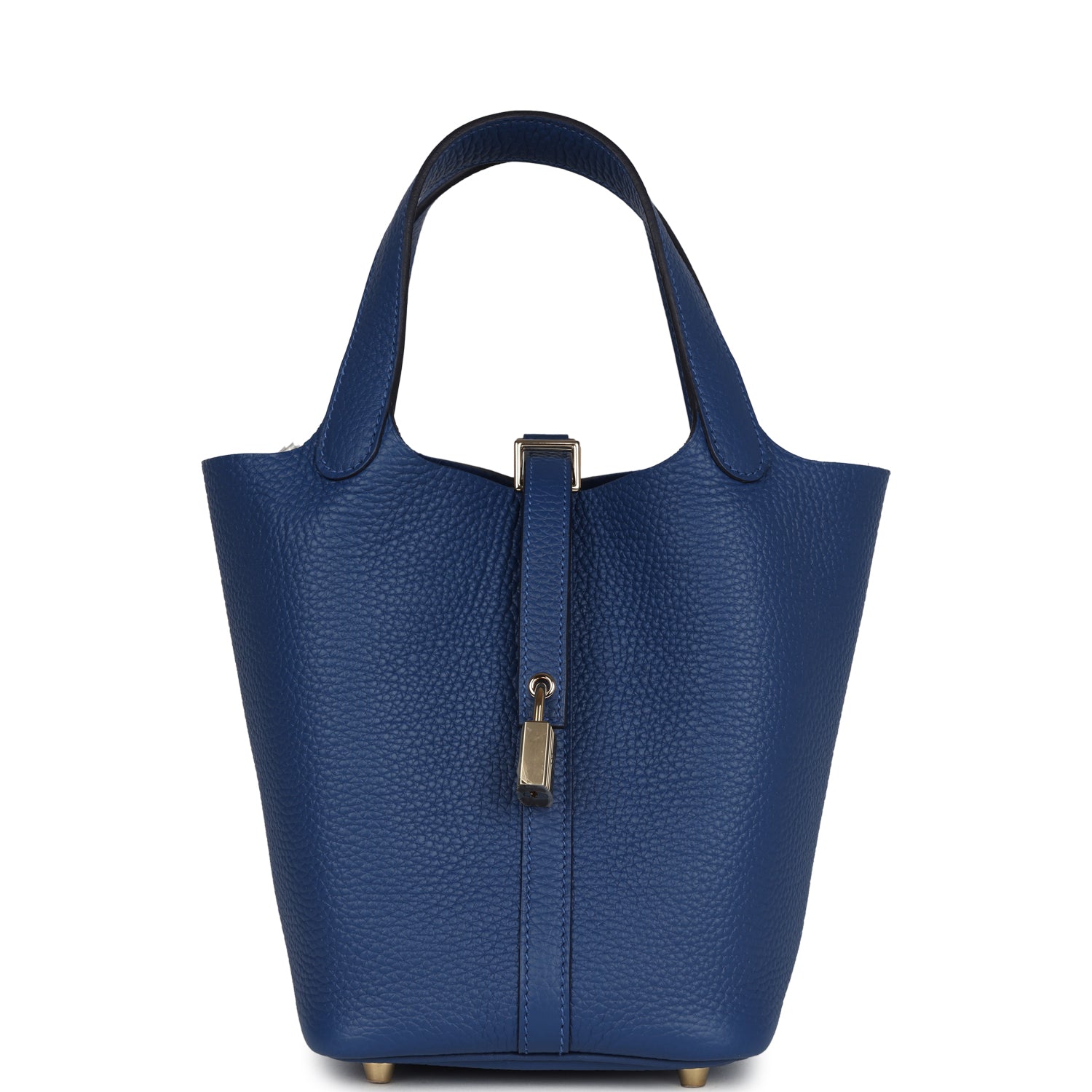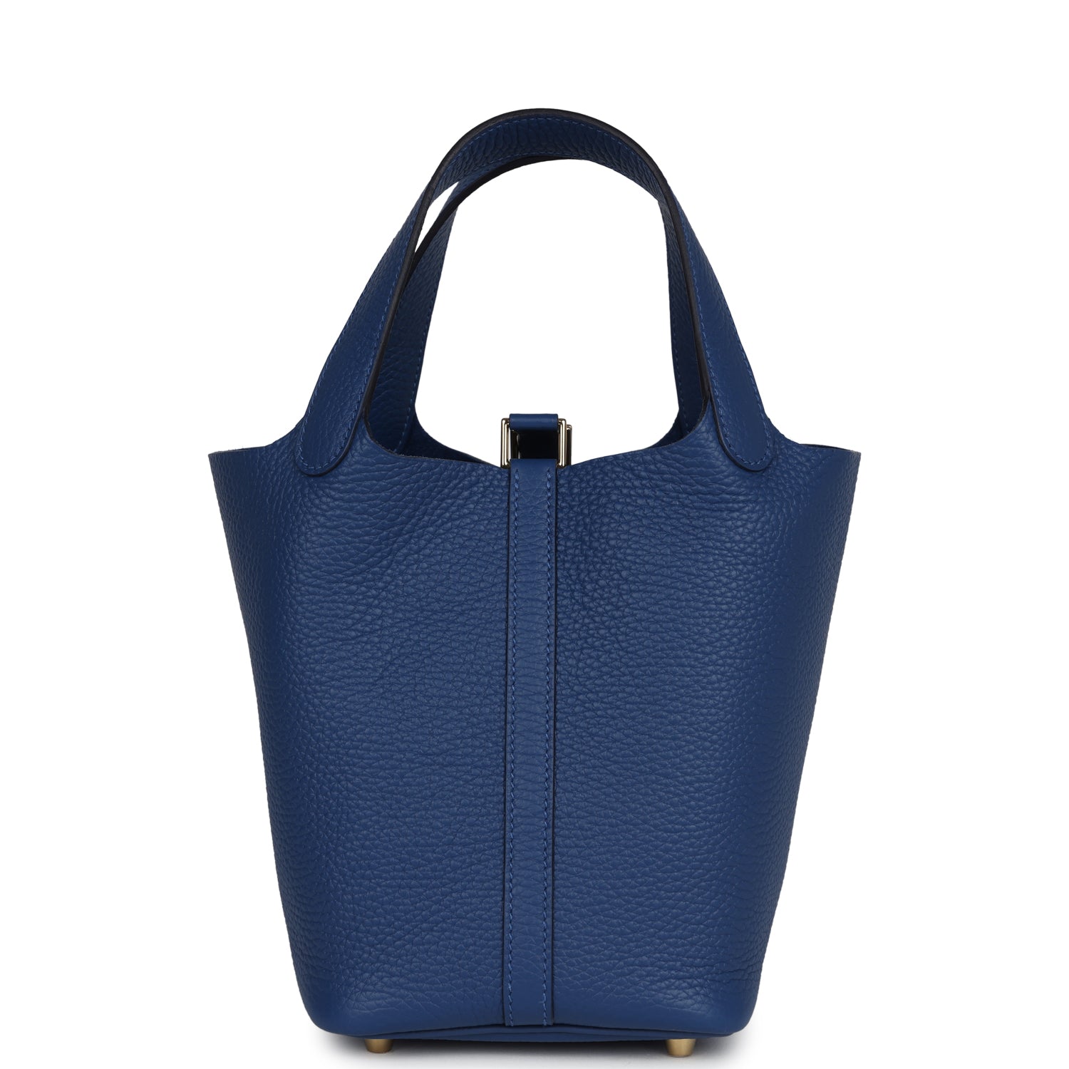 This Picotin Lock is in Bleu Tie clemence leather with permabrass hardware and has tonal stitching with two top handles.
