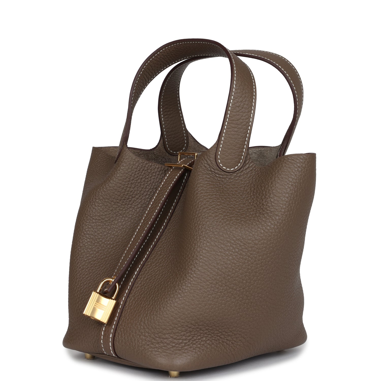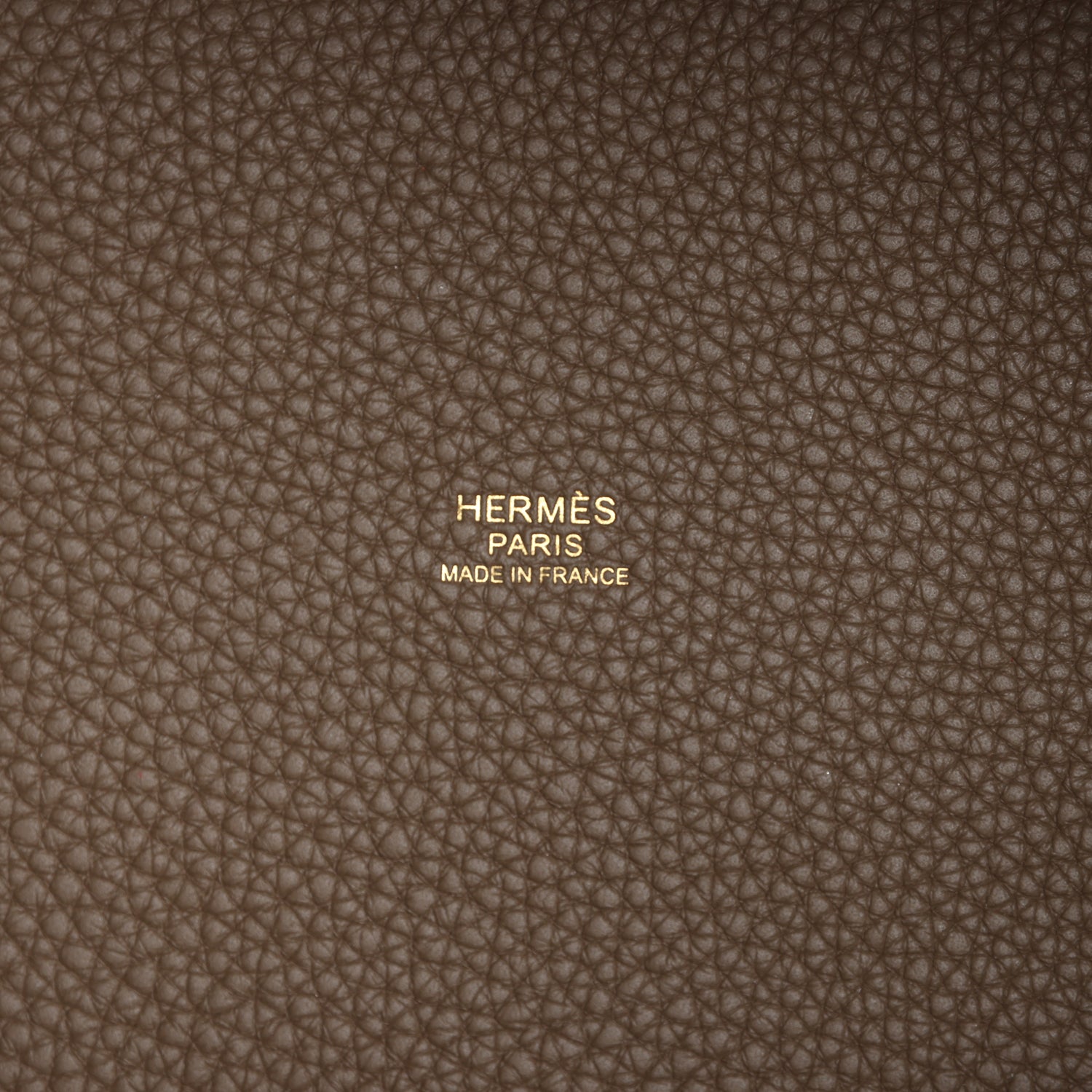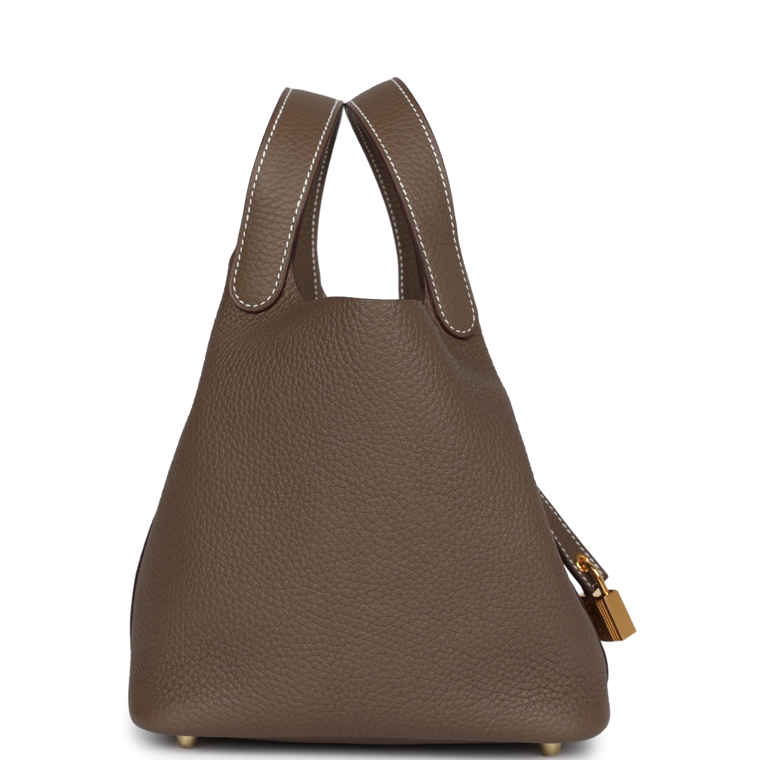 This Picotin is in Etoupe clemence leather with gold hardware and has contrast stitching with two top handles.