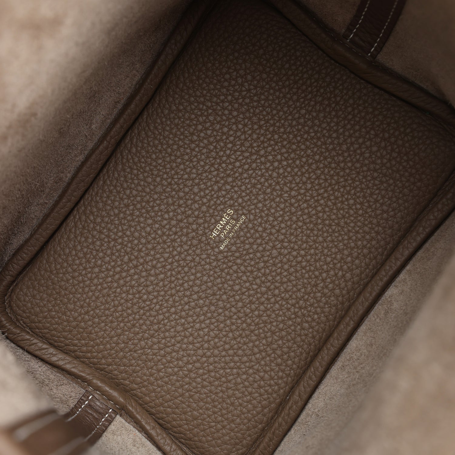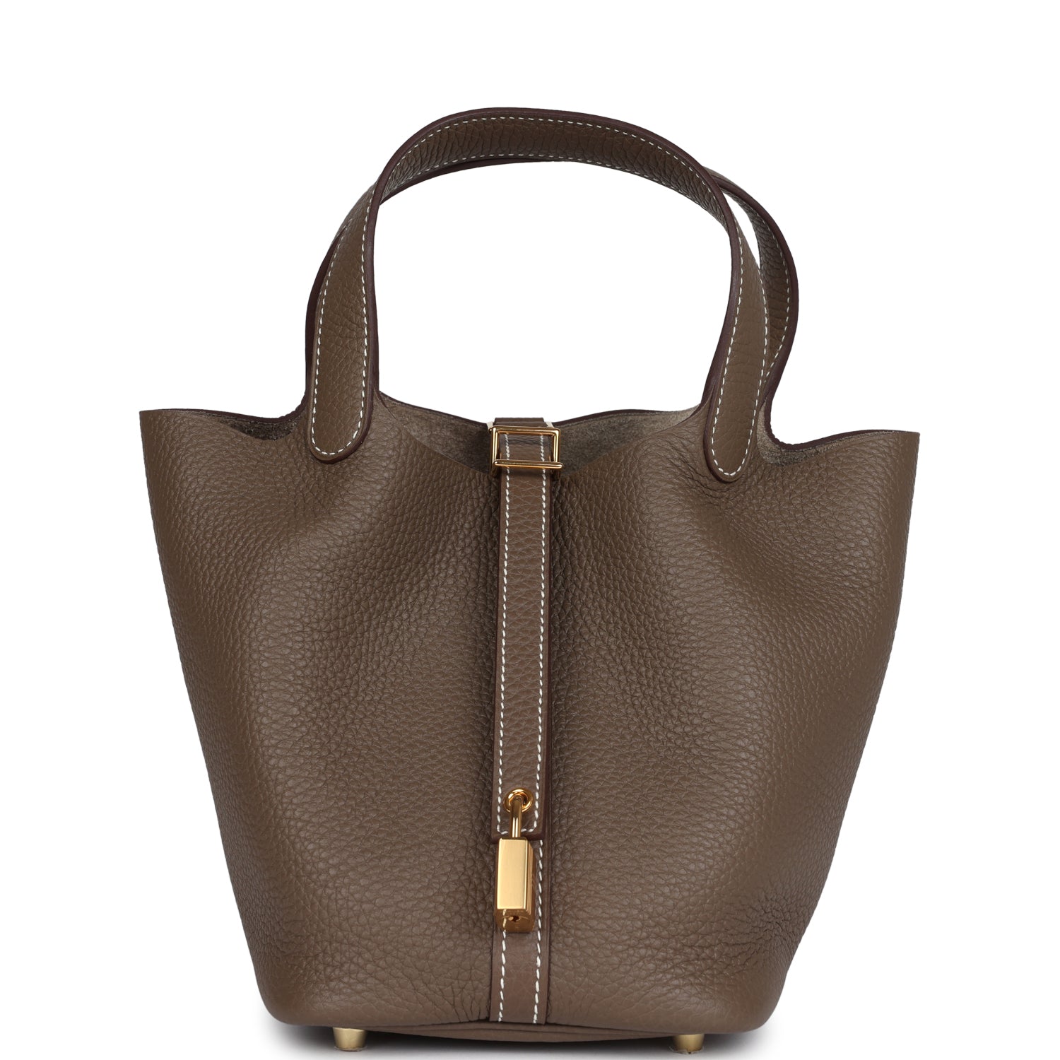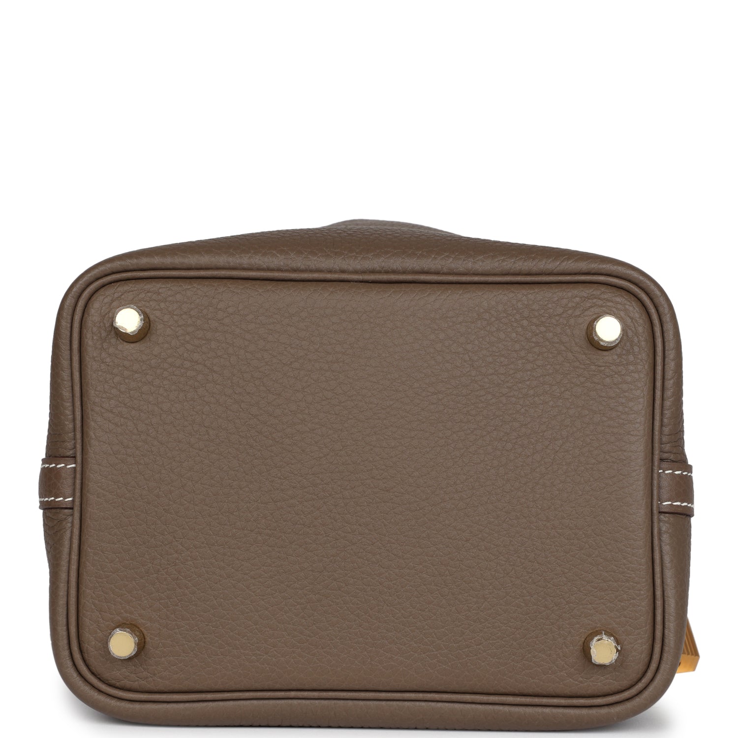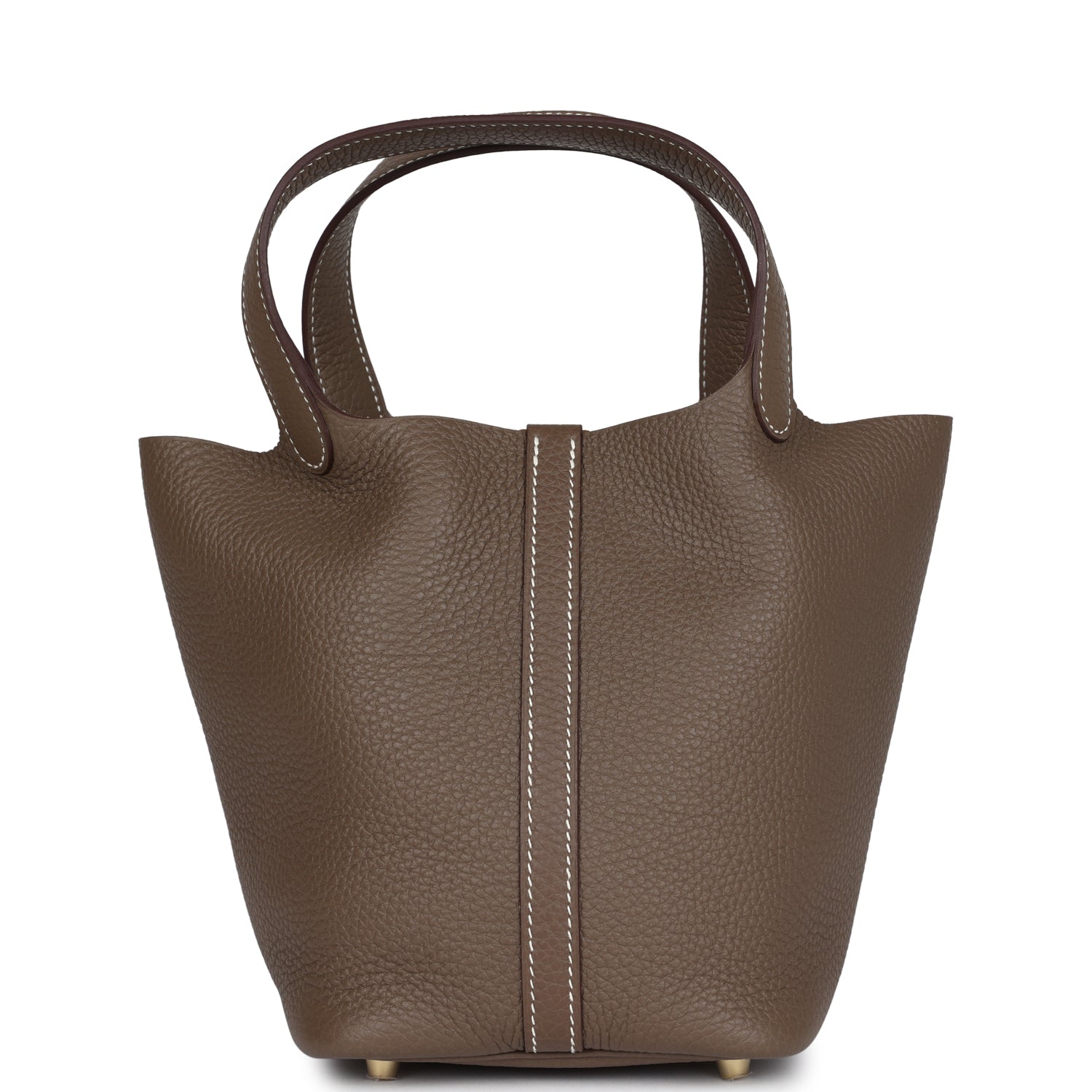 This Picotin is in Etoupe clemence leather with gold hardware and has contrast stitching with two top handles.
