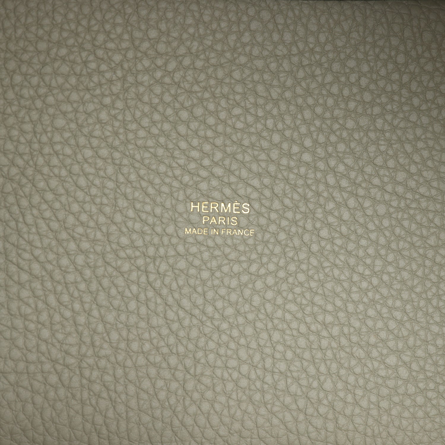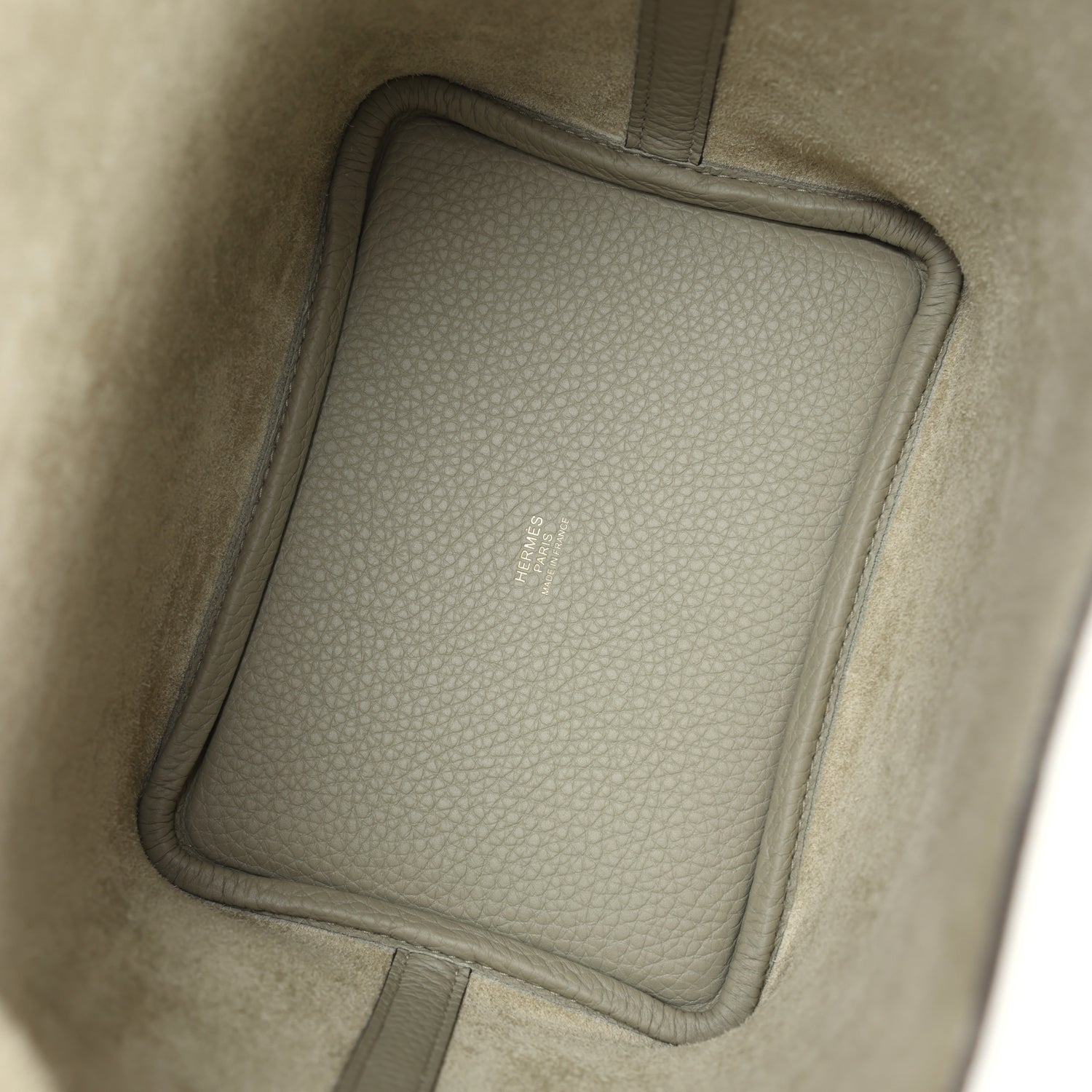 This Picotin Lock 18 is in Sauge clemence leather with gold hardware and has tonal stitching with two top handles.