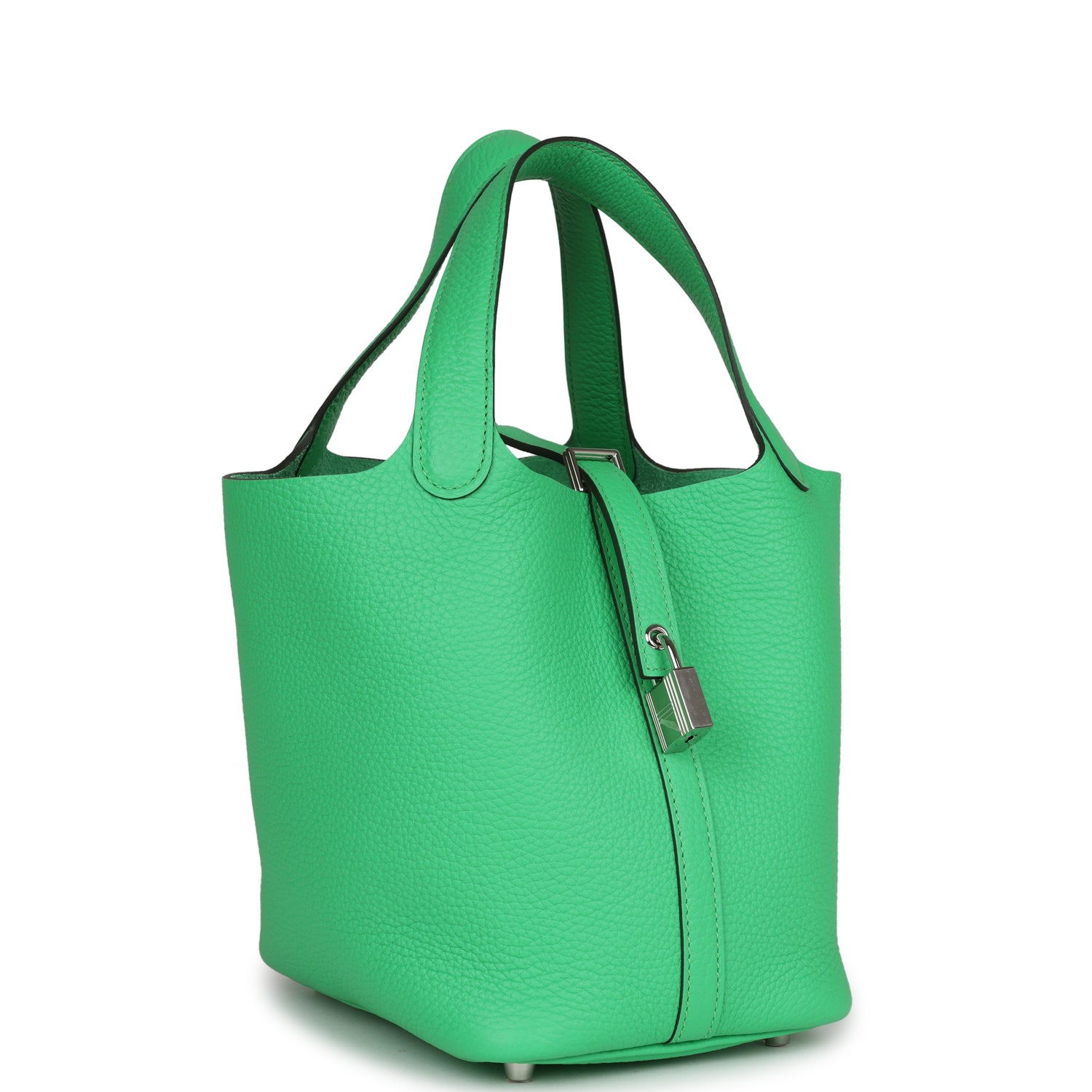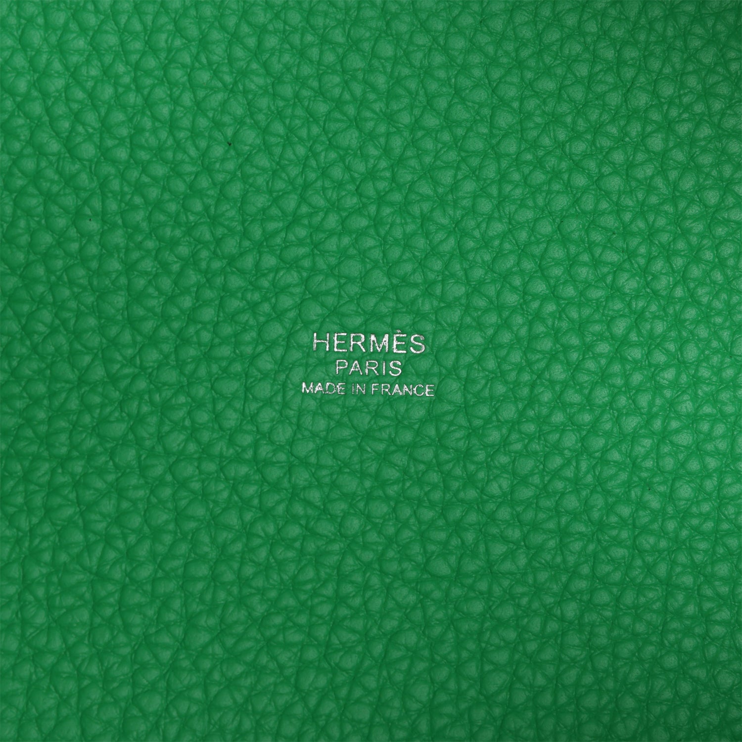 This Picotin Lock is in Vert Comics clemence leather with palladium hardware and has tonal stitching with two top handles.