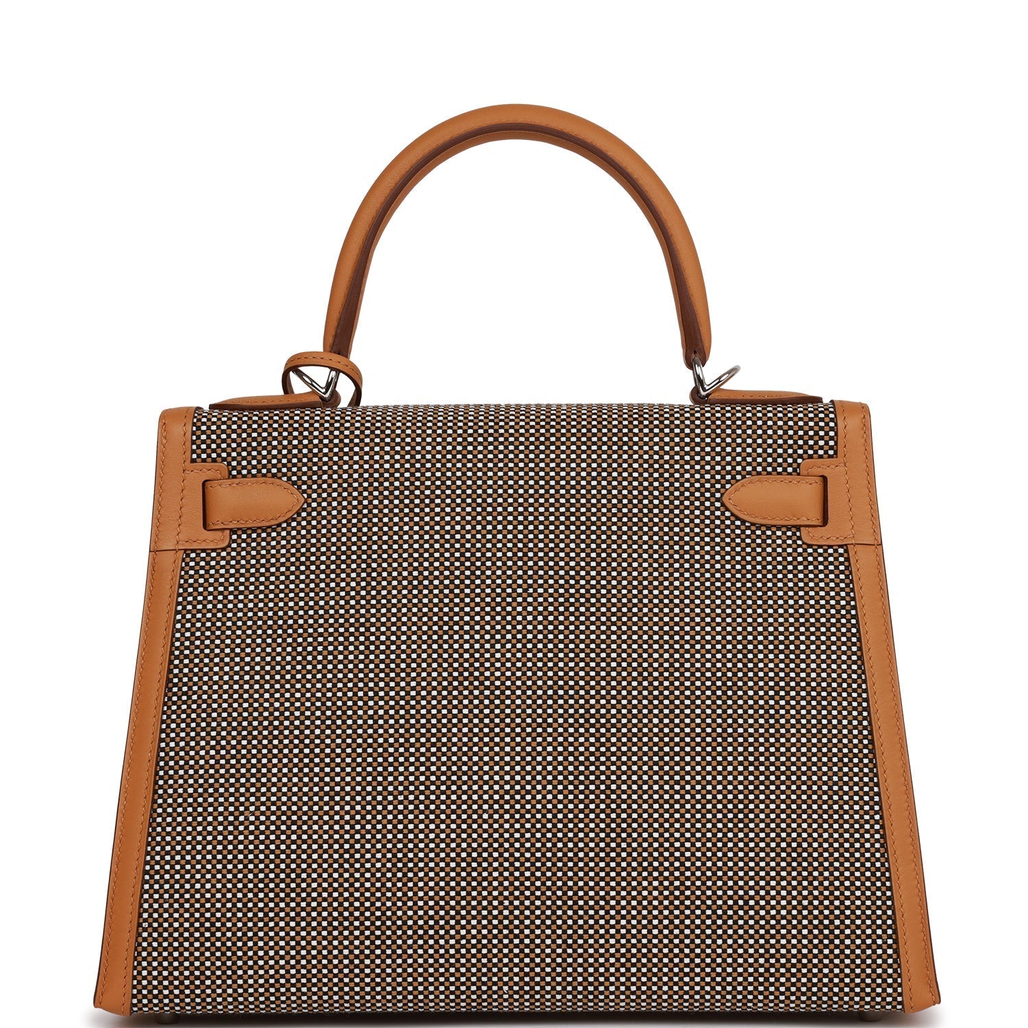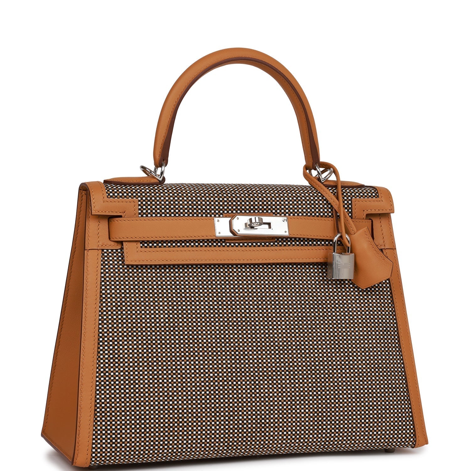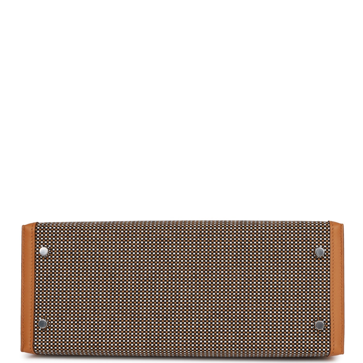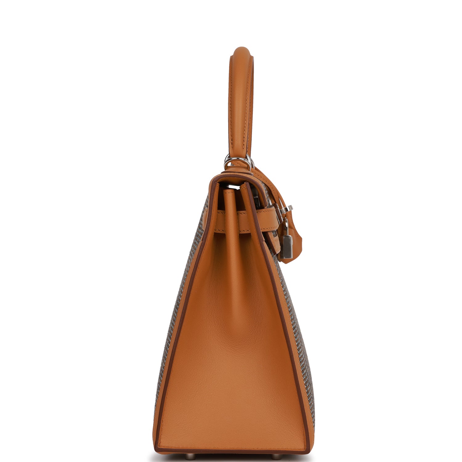 Sellier Kelly is of Black, White and Desert toile and Sesame swift leather with palladium hardware and features tonal stitching, front flap, two straps with center toggle closure, clochette with lock and two keys, single rolled handle and removable leather shoulder strap.