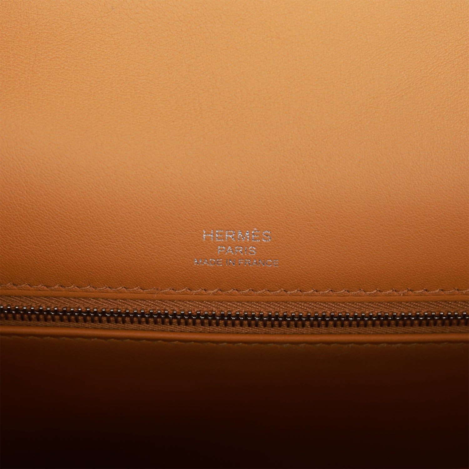 The interior is lined with Sesame swift and has one zip pocket with an Hermes engraved pull and two open pockets on the opposite side.