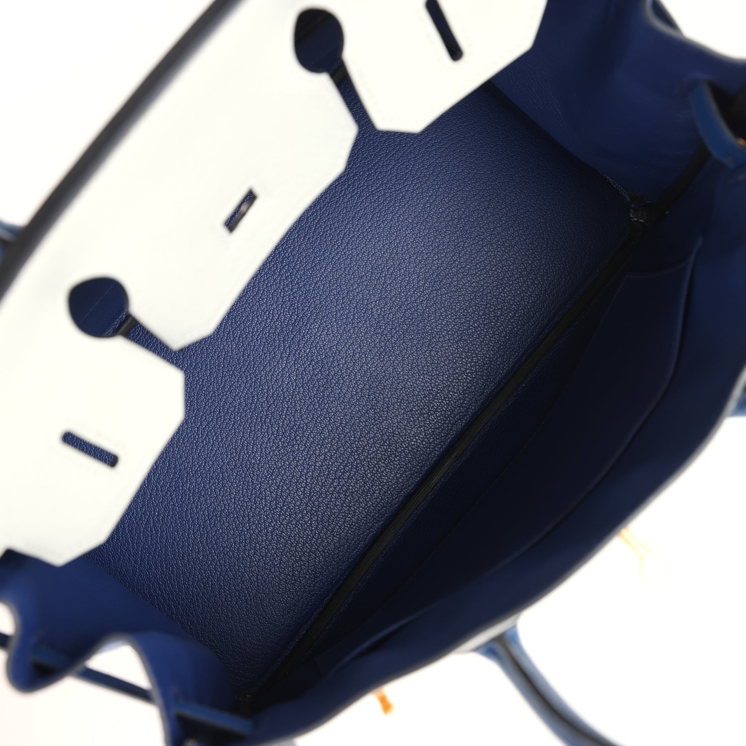 The interior is lined with Bleu Saphir chevre leather and has one zip pocket with an Hermes engraved zipper pull and an open pocket on the opposite side.