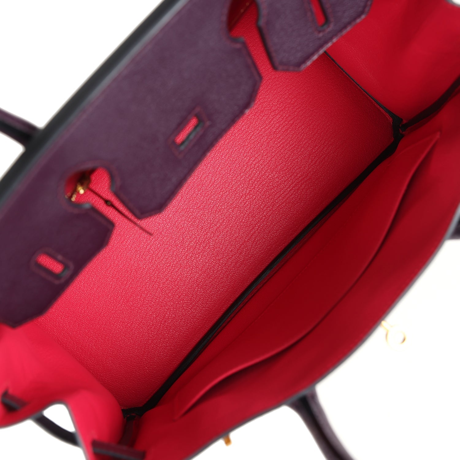 The interior is lined with Rose Extreme chevre leather and has one zip pocket with an Hermes engraved zipper pull and an open pocket on the opposite side.
