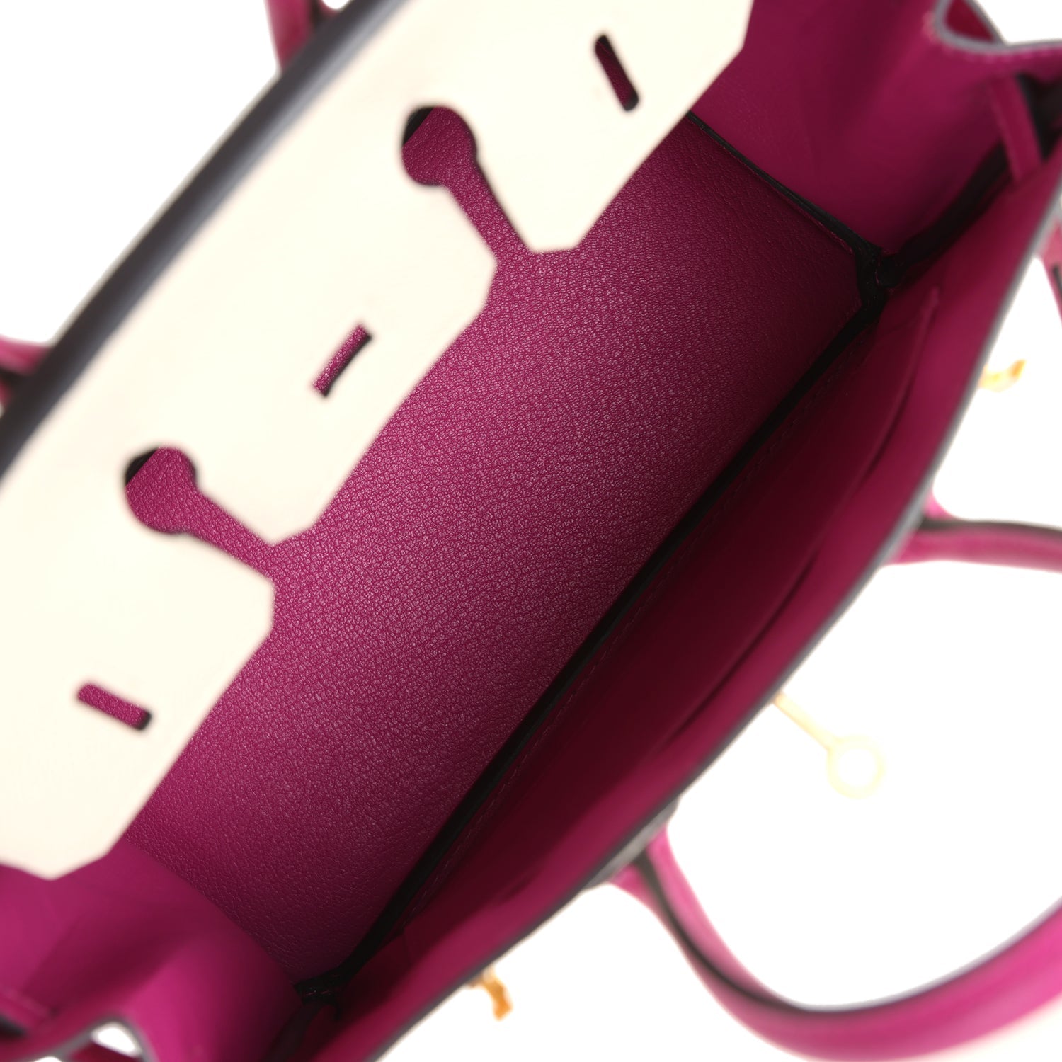 The interior is lined with Rose Pourpre chevre and has one zip pocket with an Hermes engraved zipper pull and an open pocket on the opposite side.