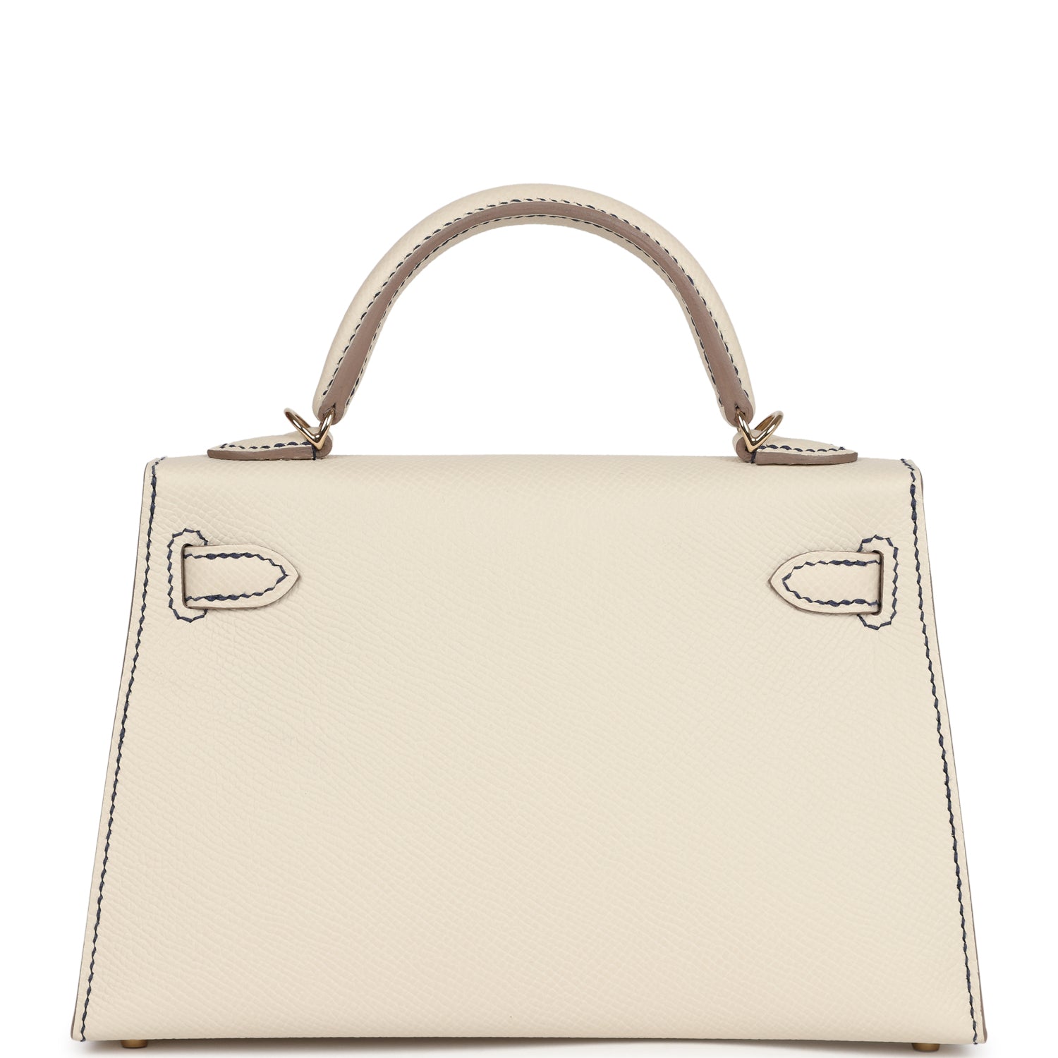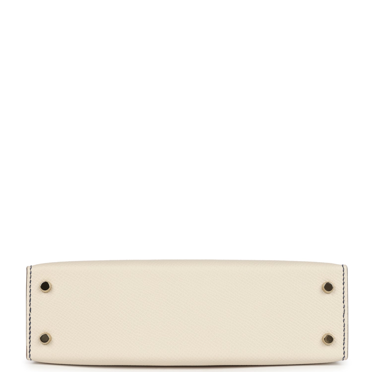 This Special Order Kelly, in the Sellier style, is in Craie and Bleu Saphir epsom leather with permabrass hardware, has contrast Bleu Saphir stitching, two front straps with front toggle closure, single rolled handle and removable shoulder strap.