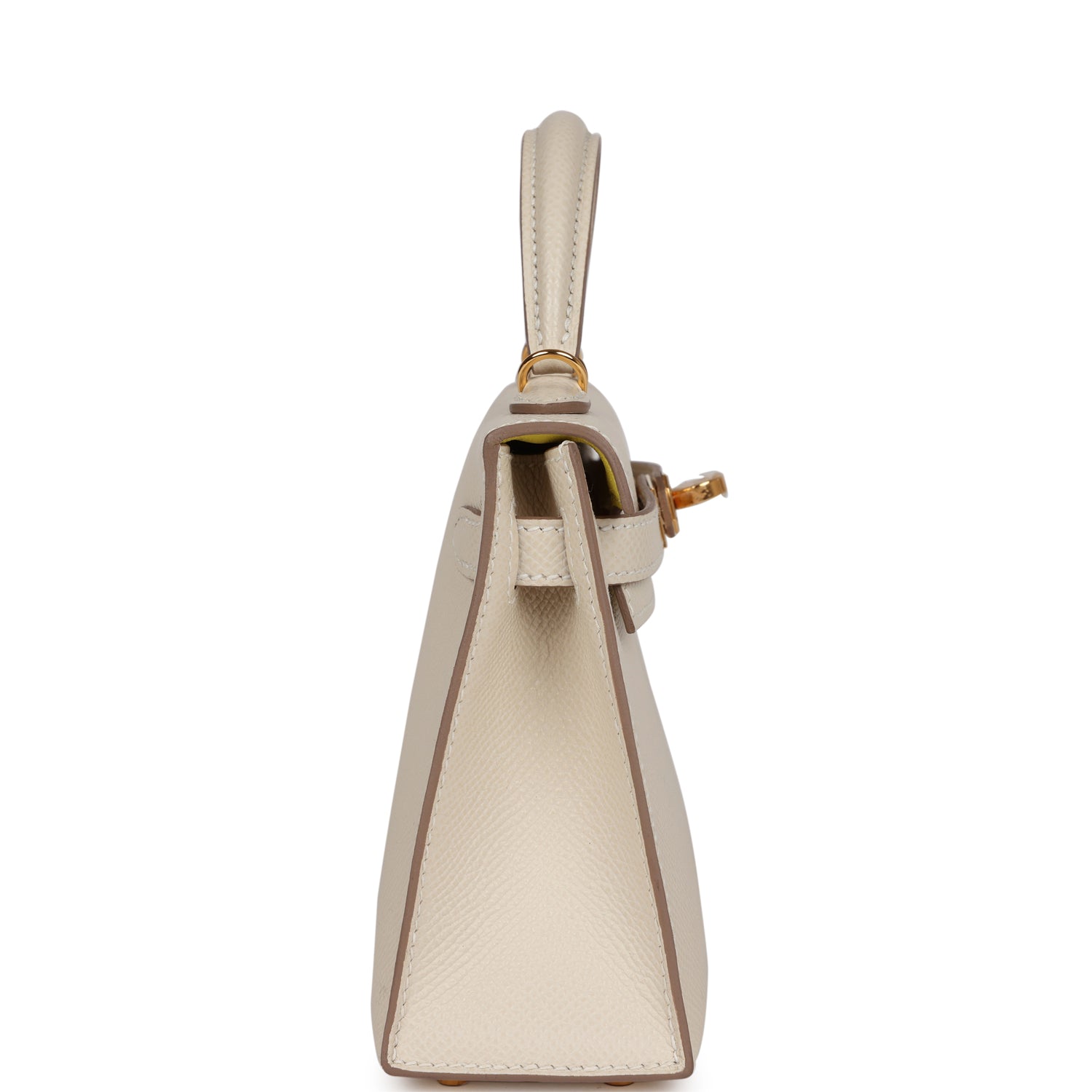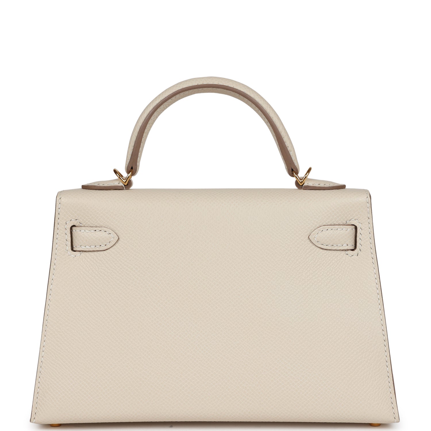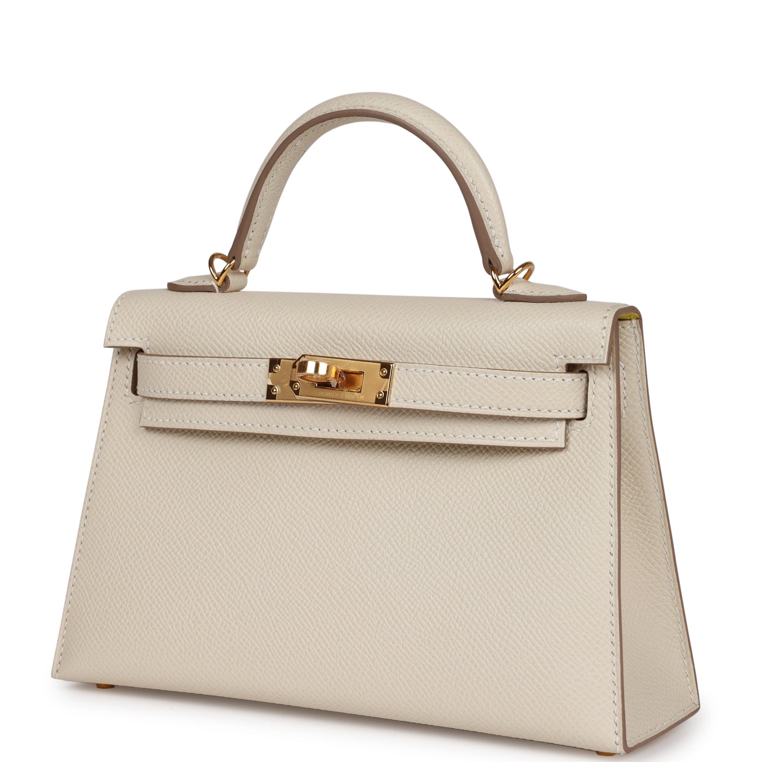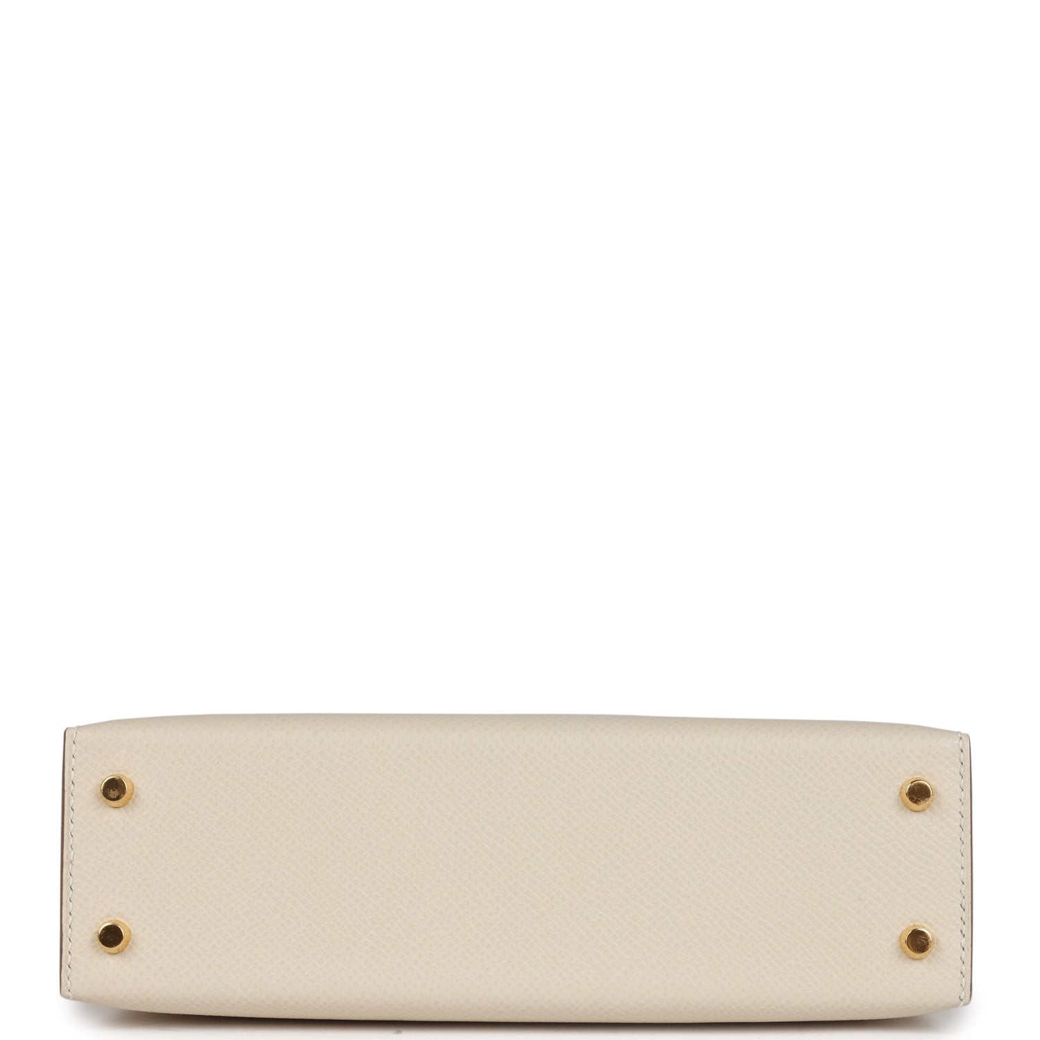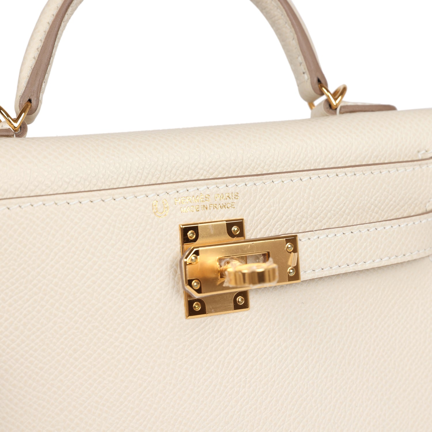 This Kelly, in the Sellier style, is a verso in Craie epsom leather with gold hardware, has tonal stitching, two straps with front toggle closure, single rolled handle and removable shoulder strap.