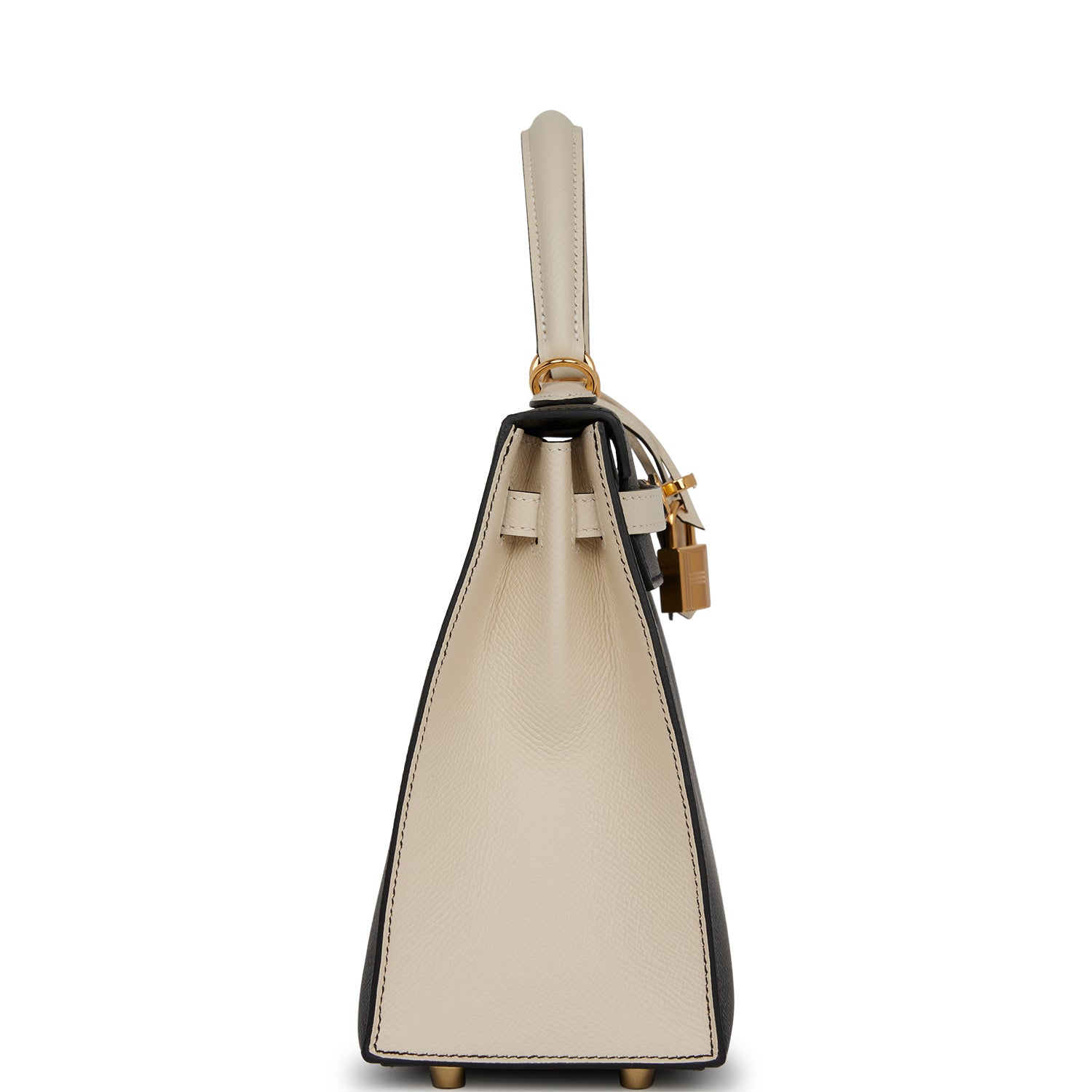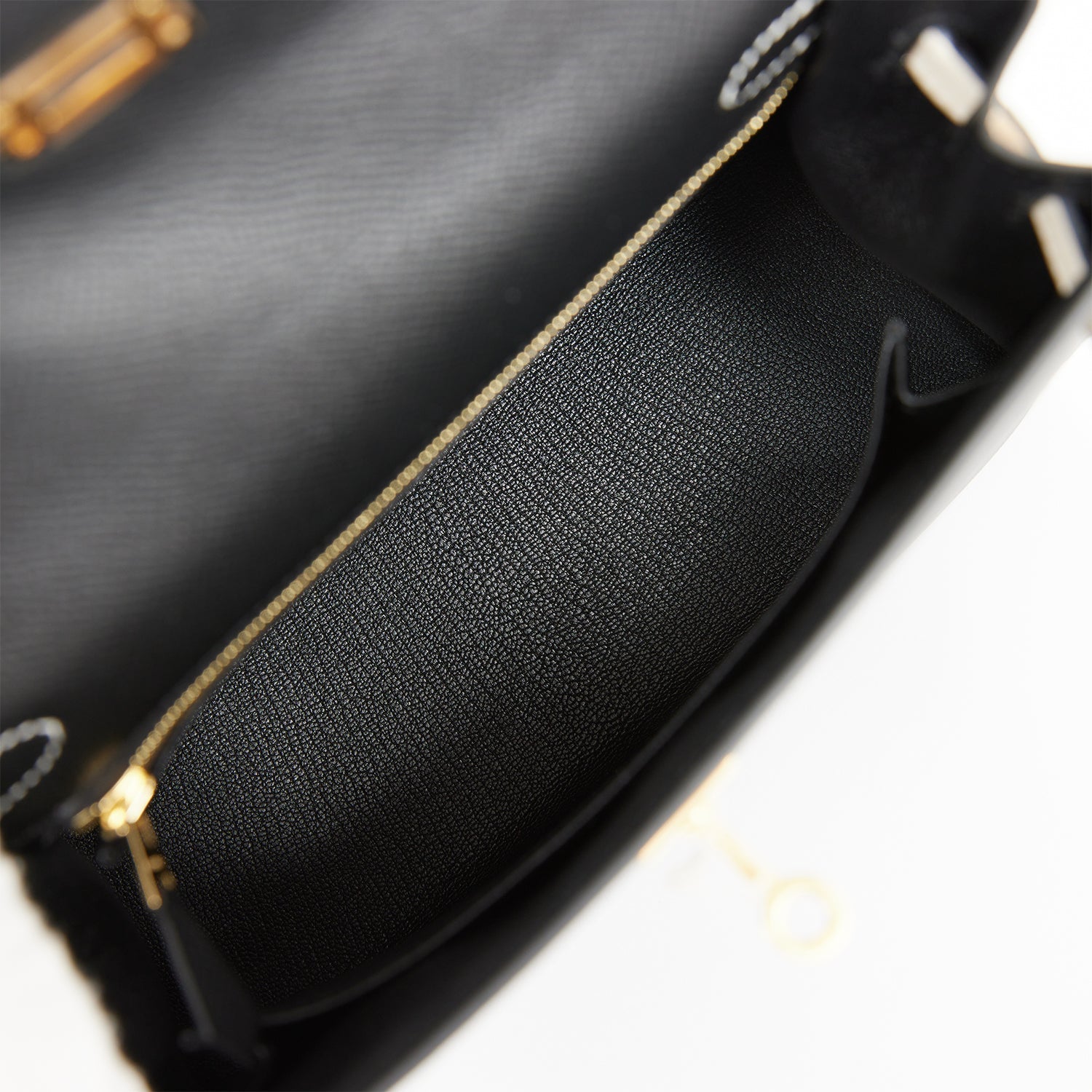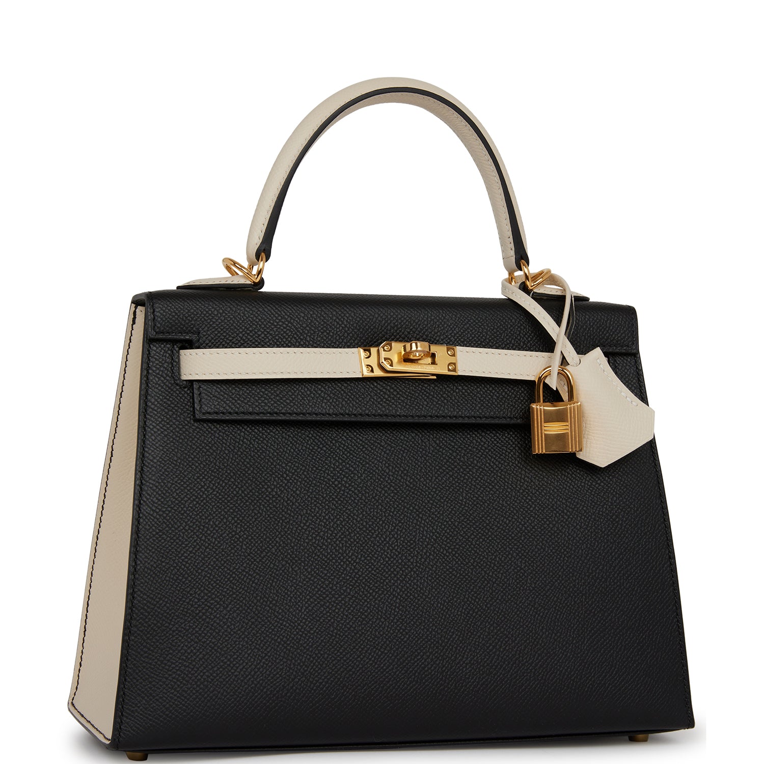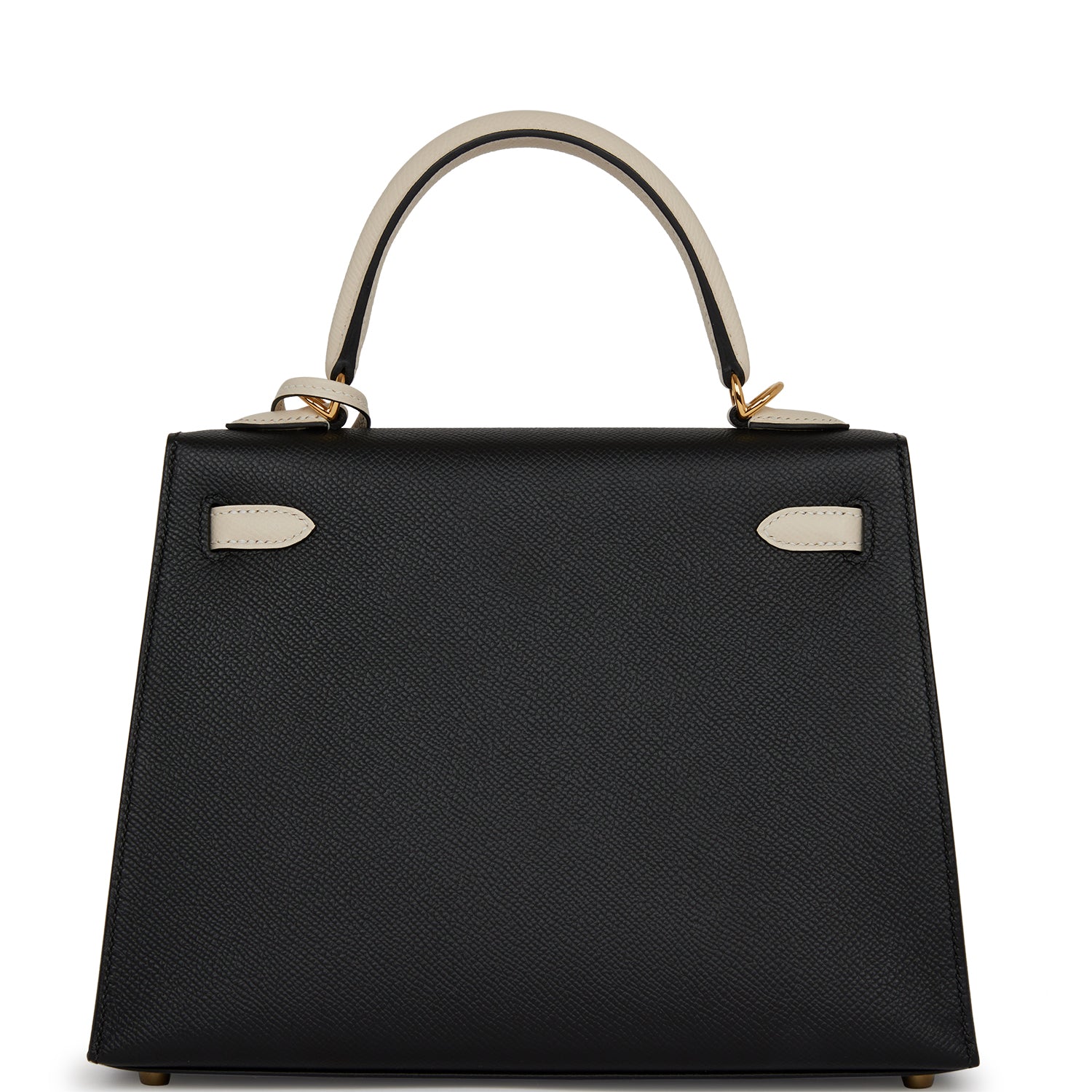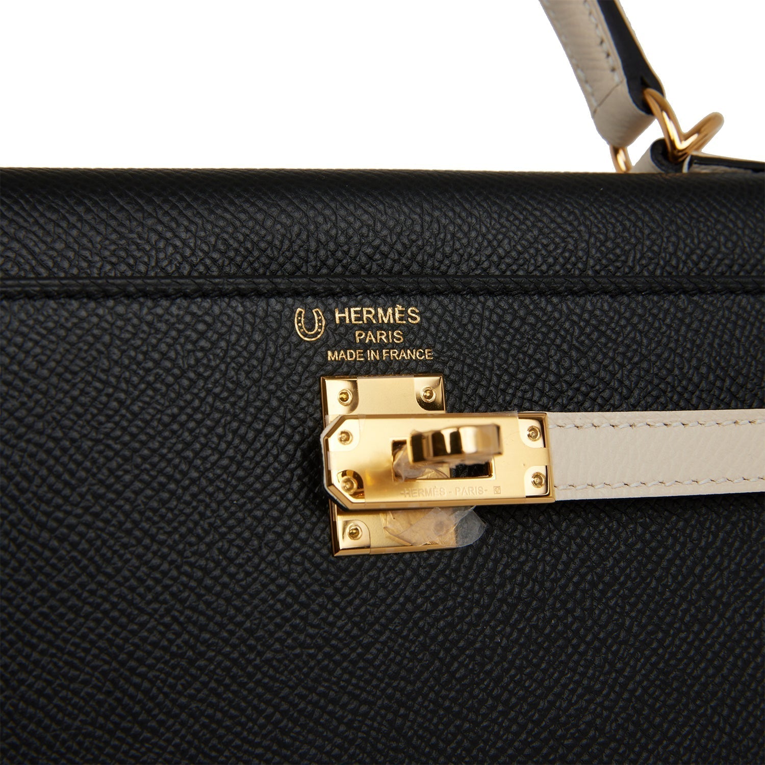 Special Order Kelly, in the Sellier style, is in Black and Nata epsom leather with permabrass hardware and has tonal stitching, two front straps with toggle closure, clochette with lock and two keys, single rolled handle and removable shoulder strap.