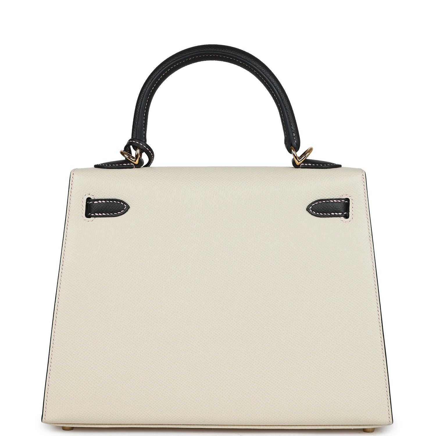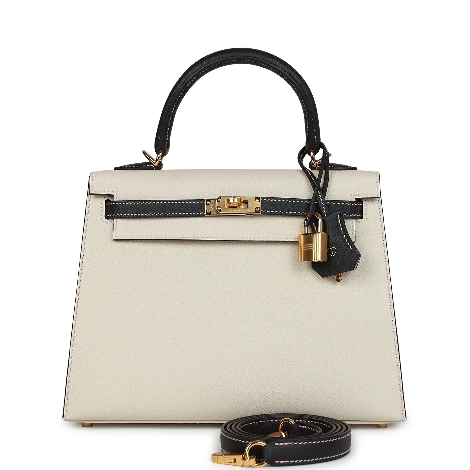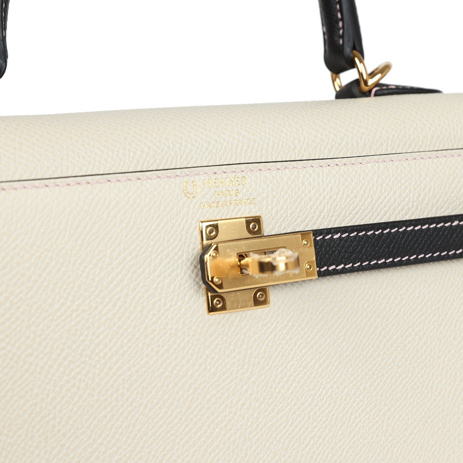 Special Order Kelly, in the Sellier style, is in Black and Craie epsom leather with gold hardware and has pink contrast stitching, two straps with front toggle closure, clochette, with heart heatstamp, with lock and two keys, single rolled handle and removable shoulder strap.