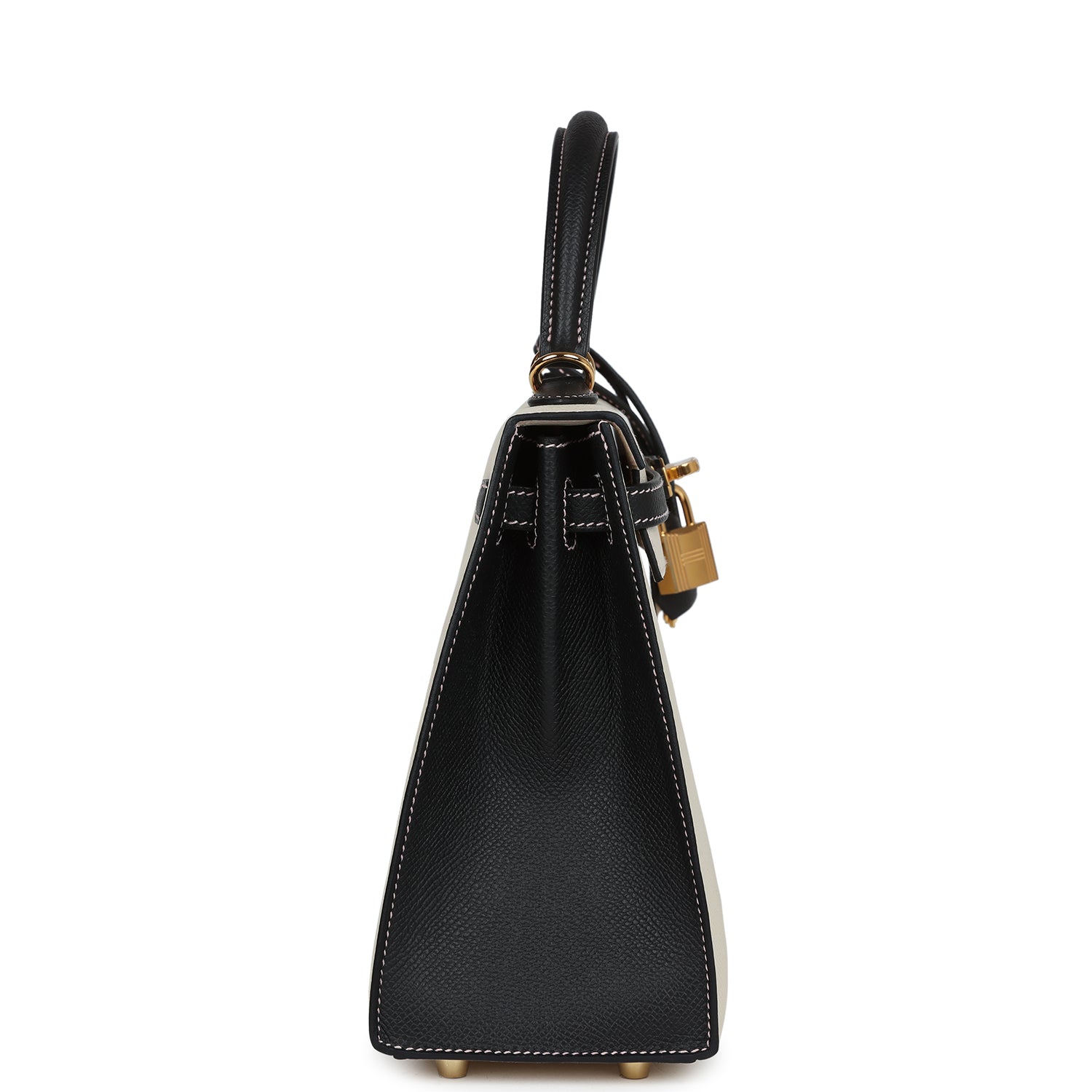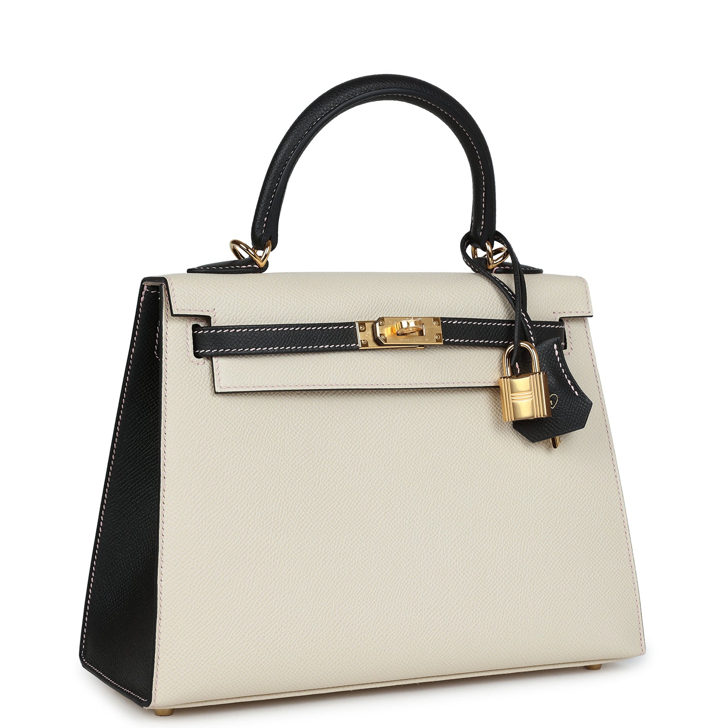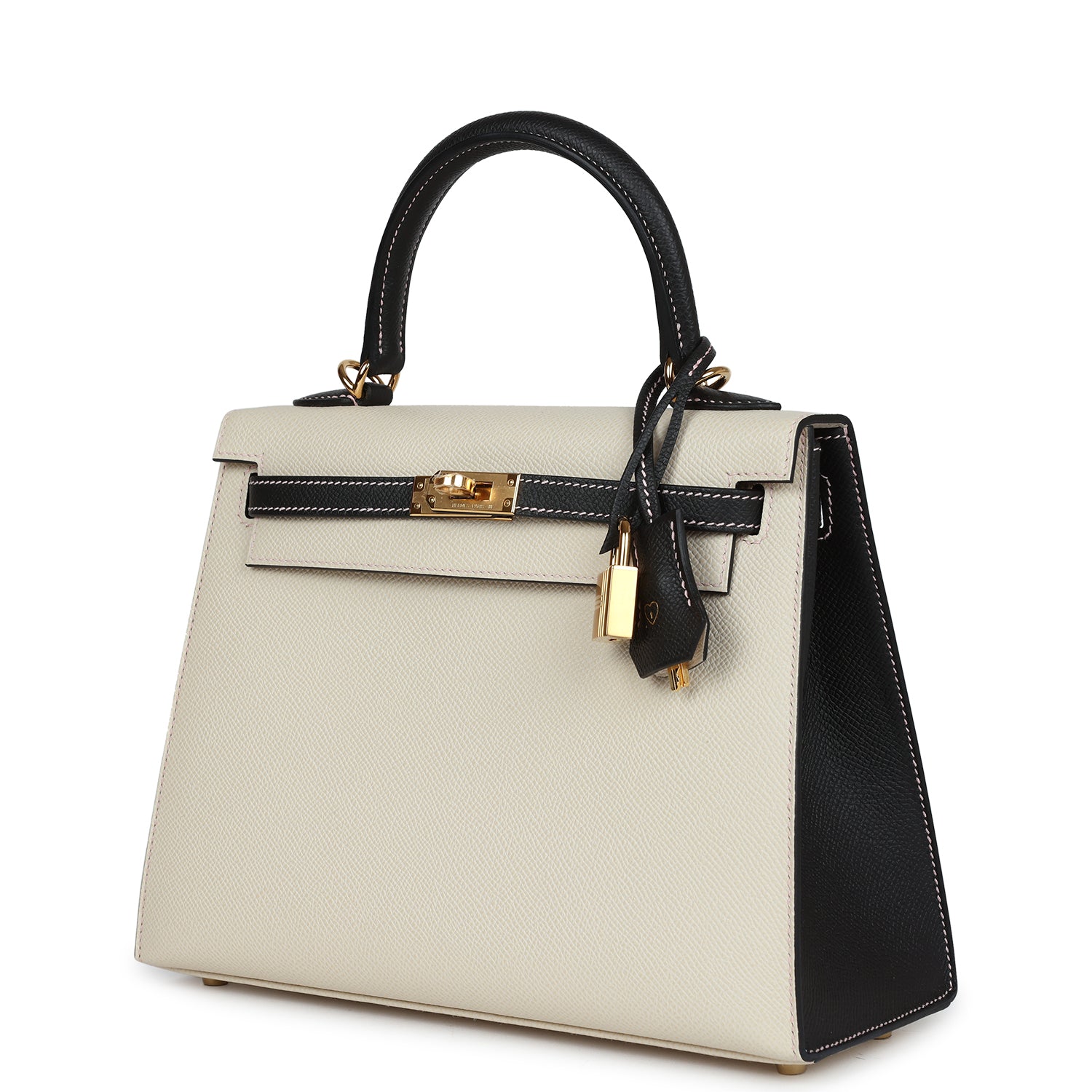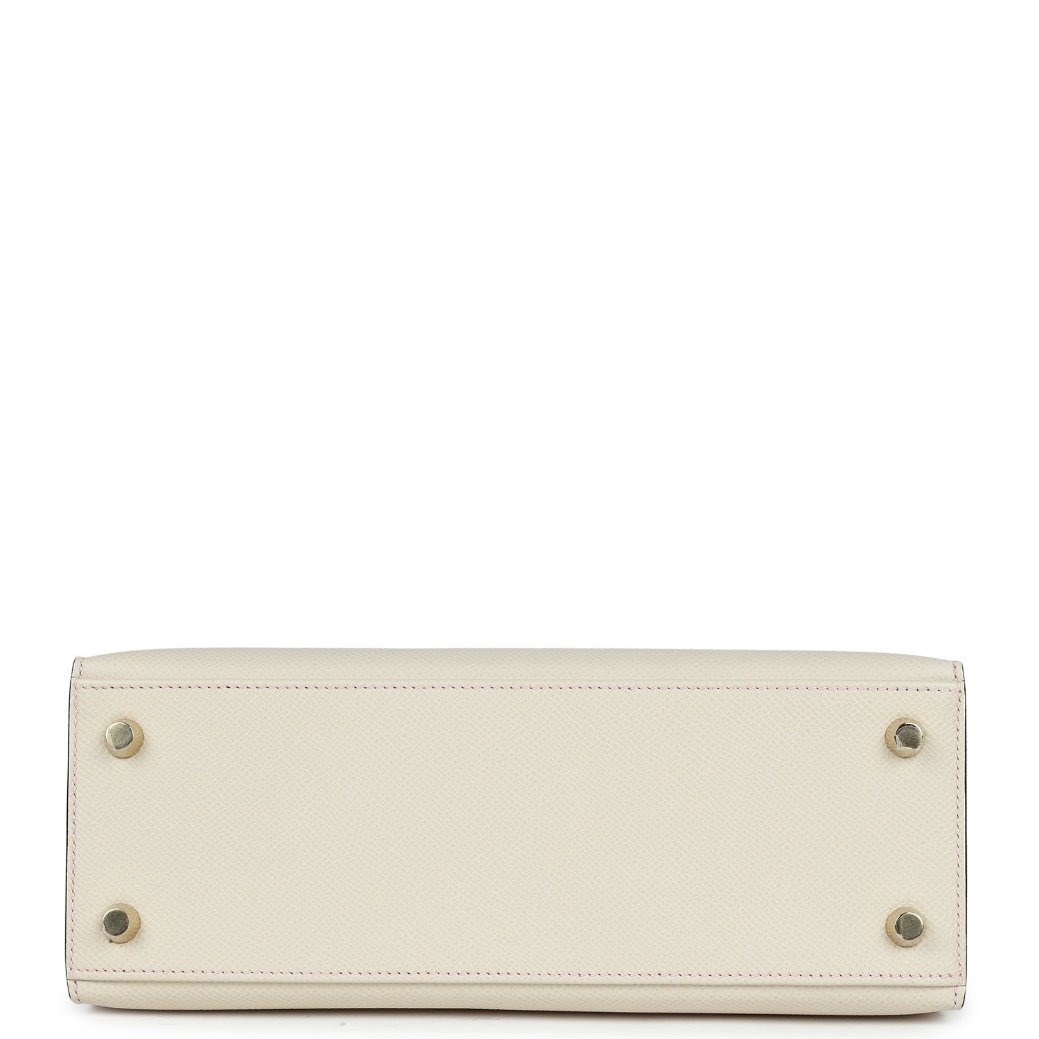 Special Order Kelly, in the Sellier style, is in Black and Craie epsom leather with gold hardware and has pink contrast stitching, two straps with front toggle closure, clochette, with heart heatstamp, with lock and two keys, single rolled handle and removable shoulder strap.