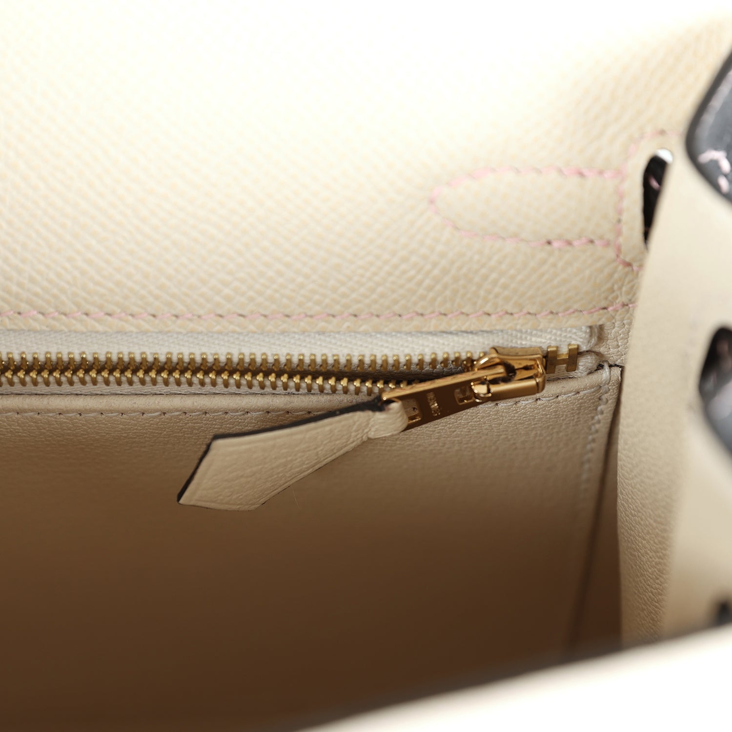 The interior is lined with Craie chevre leather and has one zip pocket with an Hermes engraved pull and one open pocket on the opposite side.