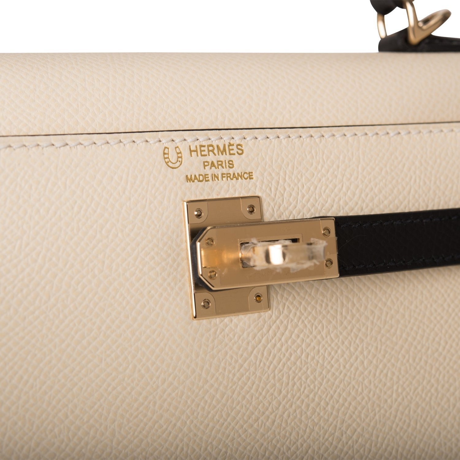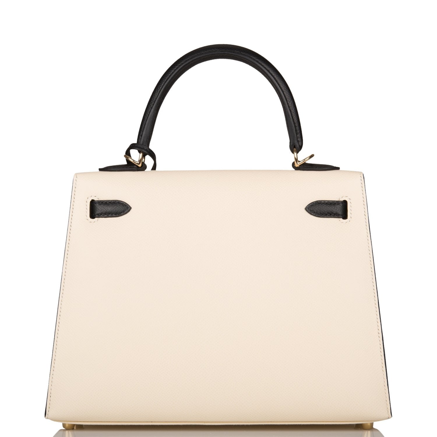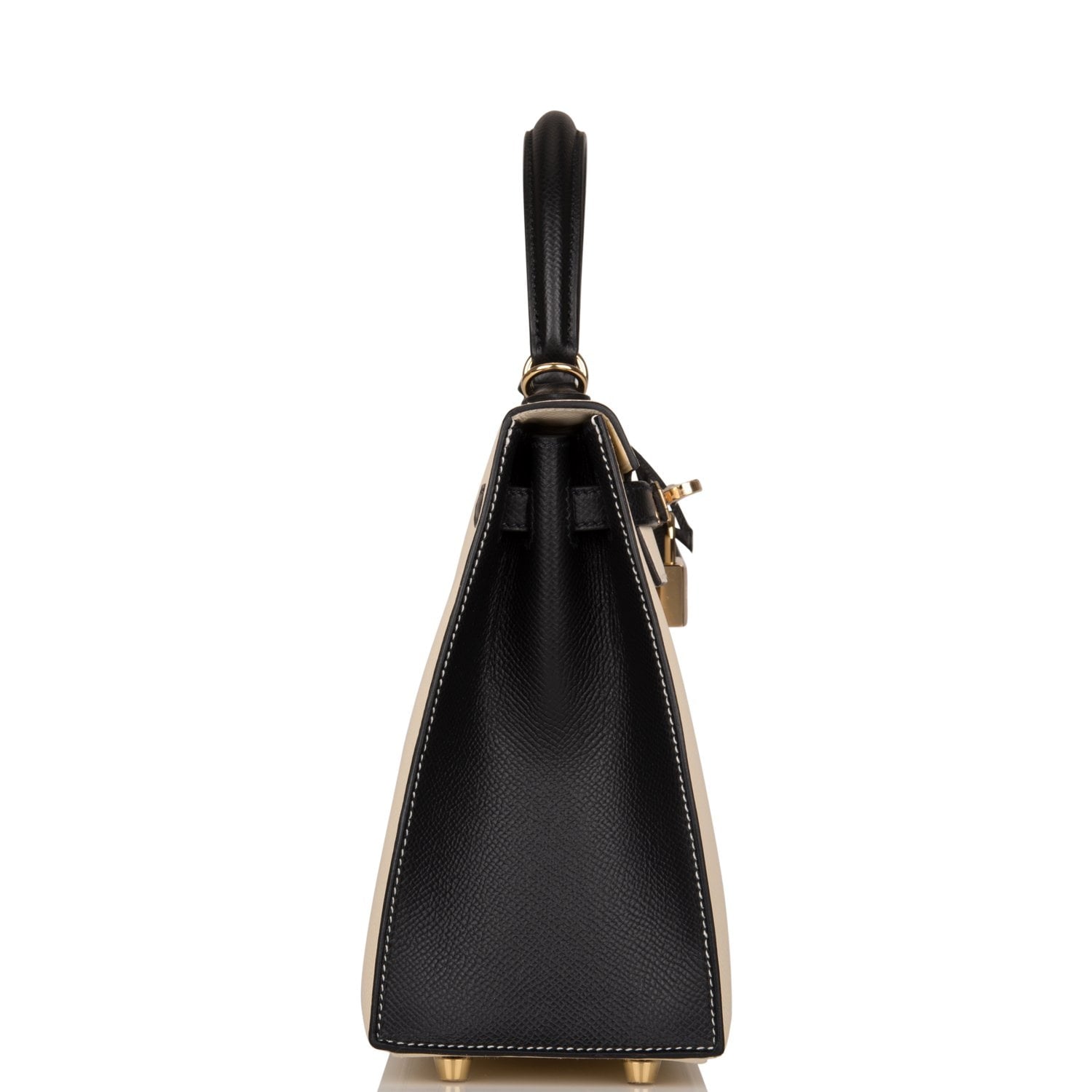 Special Order Kelly, in the Sellier style, is in Nata and Black epsom leather with permabrass hardware and has tonal stitching, two front straps with toggle closure, clochette with lock and two keys, single rolled handle and removable shoulder strap.