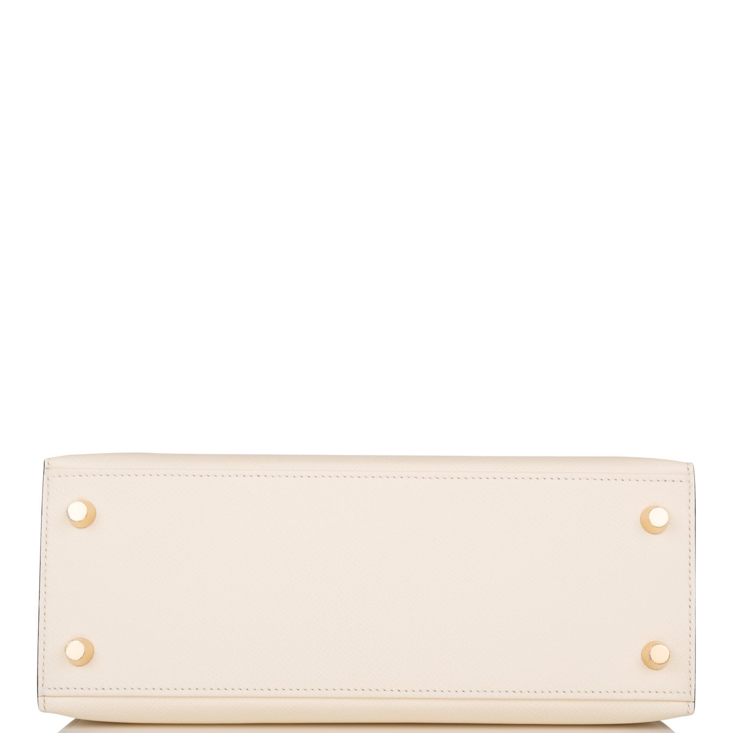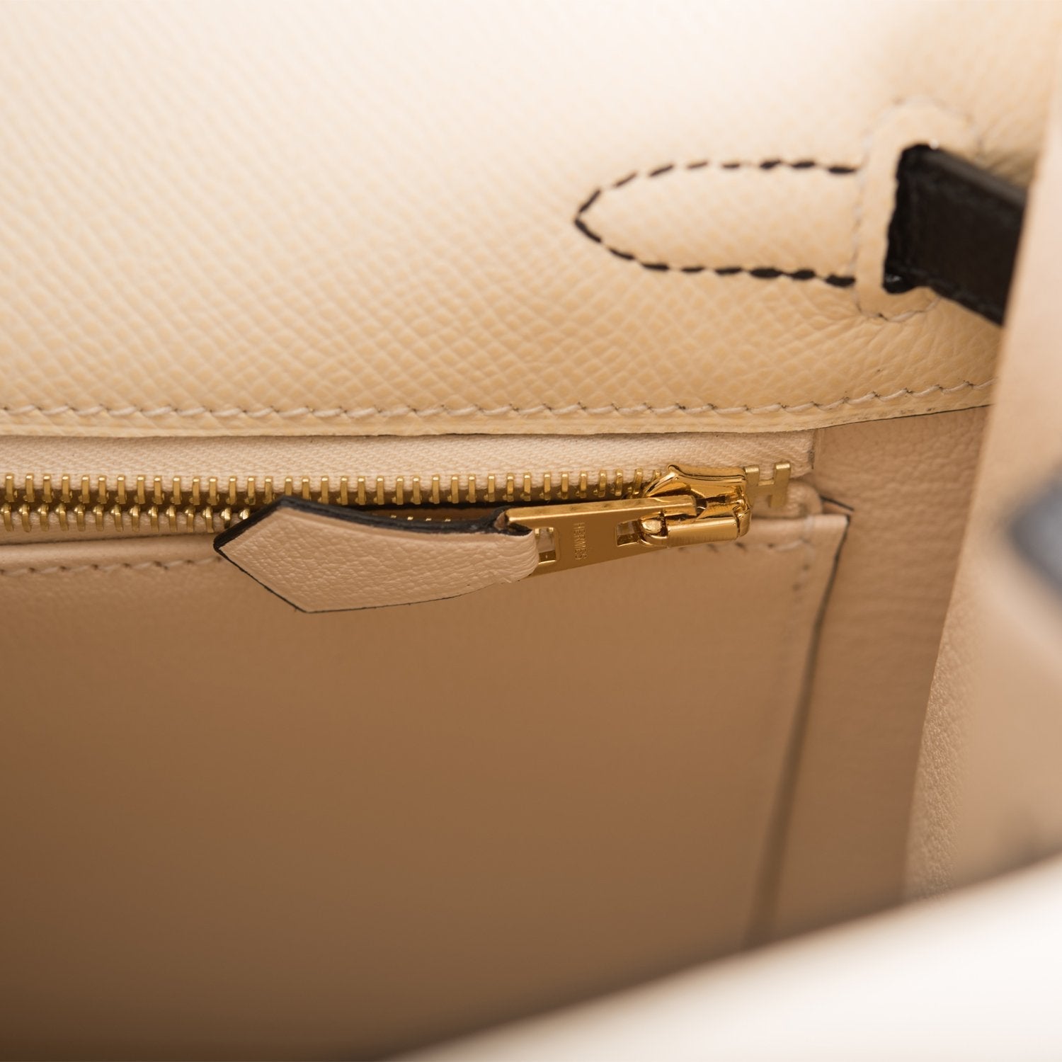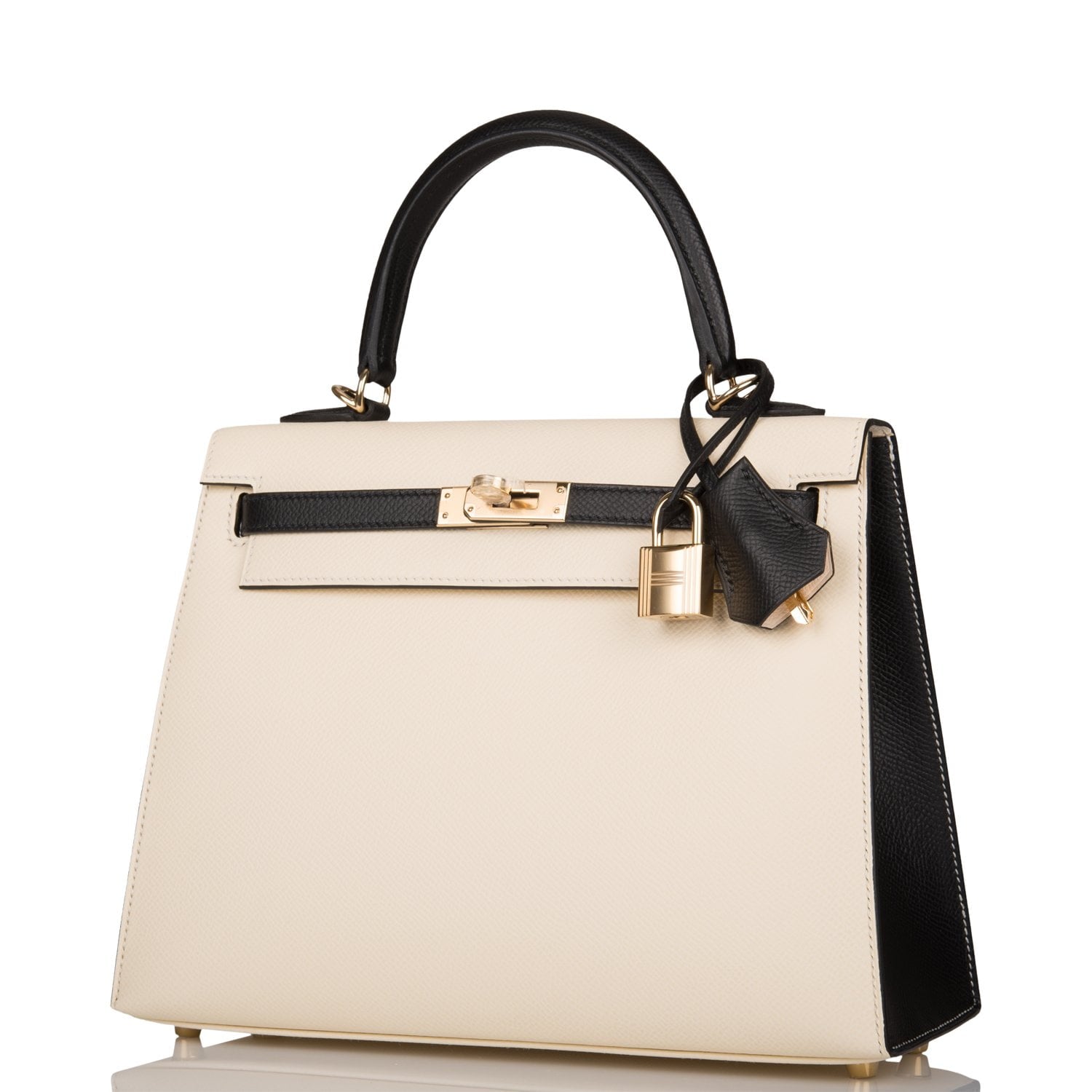 Special Order Kelly, in the Sellier style, is in Nata and Black epsom leather with permabrass hardware and has tonal stitching, two front straps with toggle closure, clochette with lock and two keys, single rolled handle and removable shoulder strap.