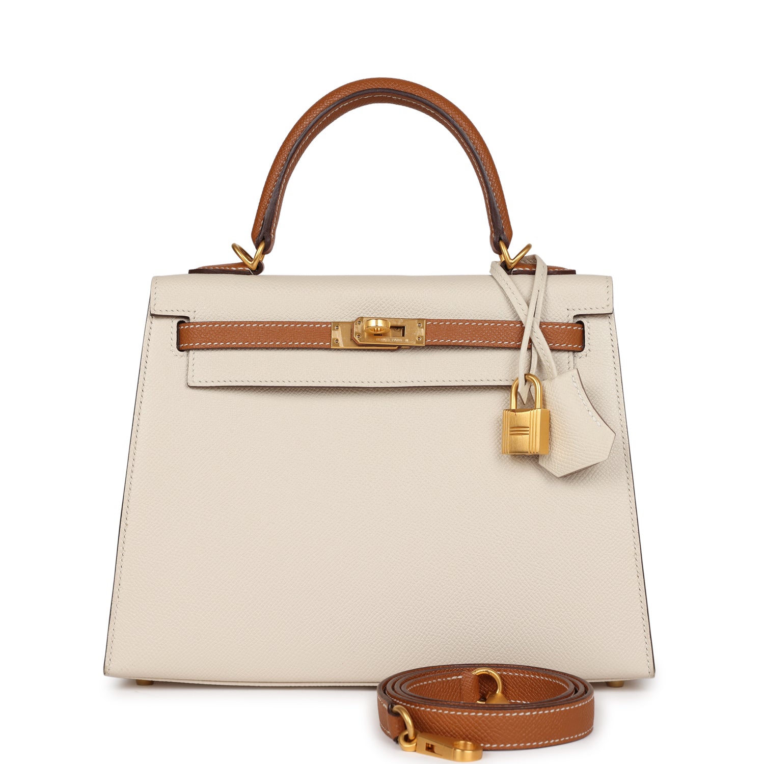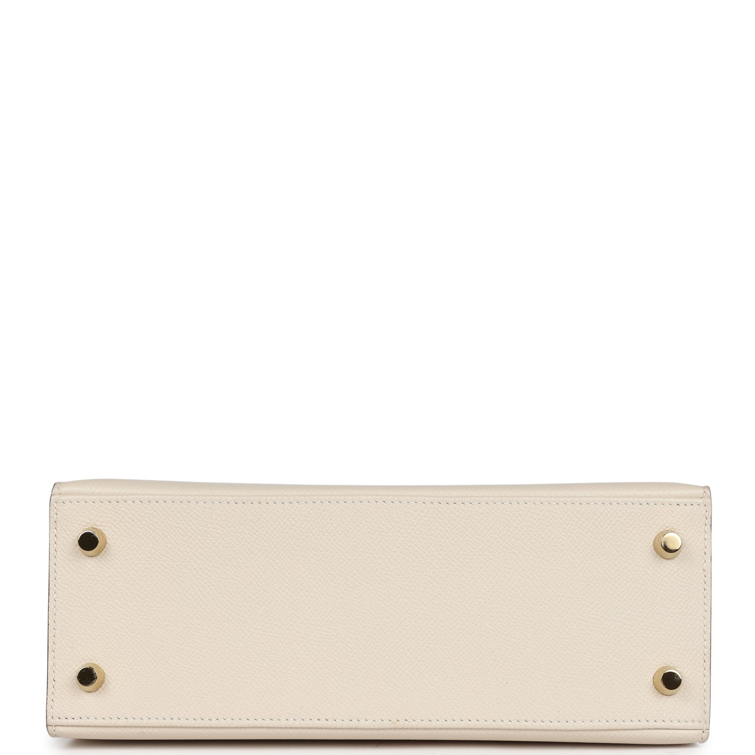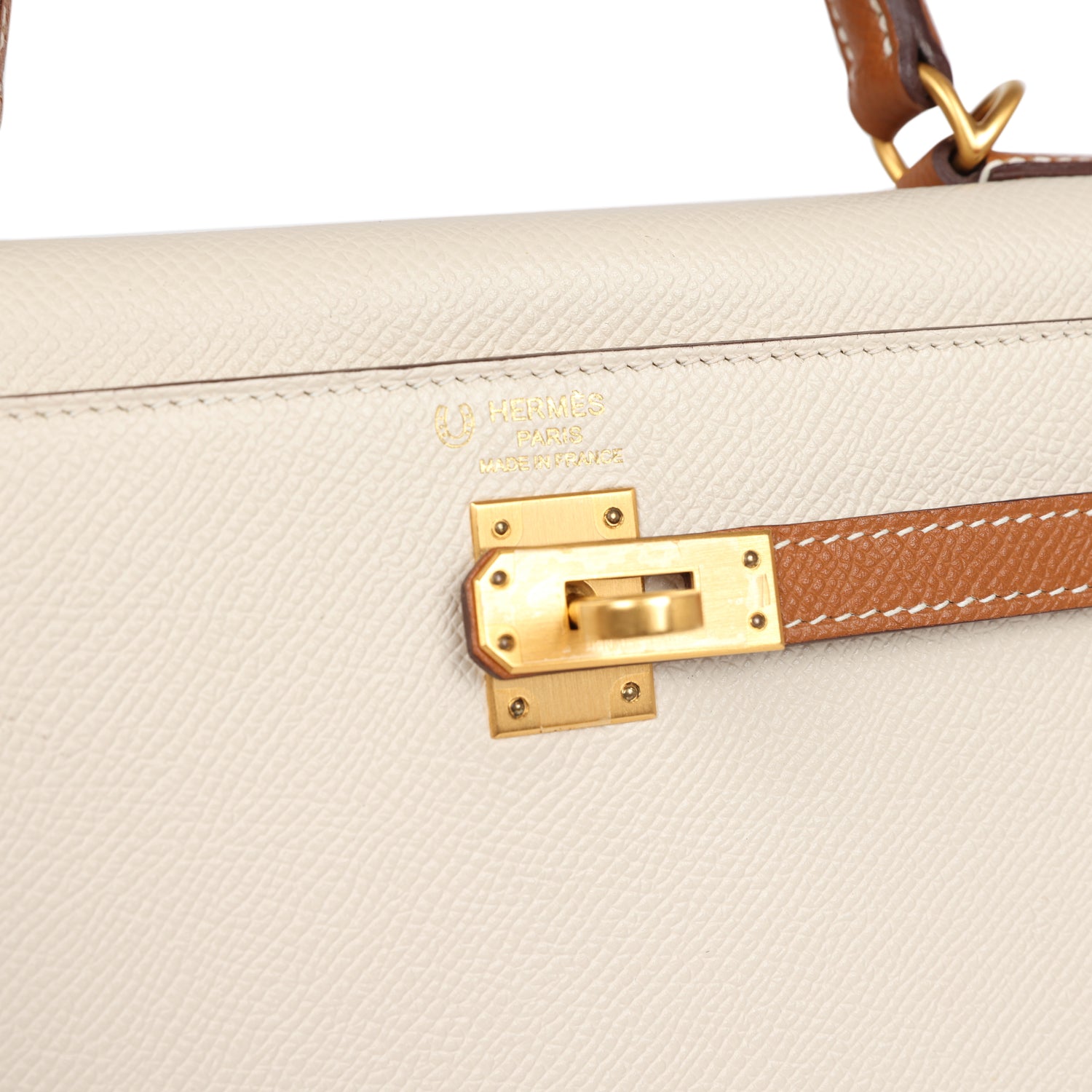 Special Order Kelly, in the Sellier style, is in Craie and Gold epsom leather with brushed gold hardware and has tonal and contrast stitching, two front straps with toggle closure, clochette with lock and two keys, single rolled handle and removable shoulder strap.