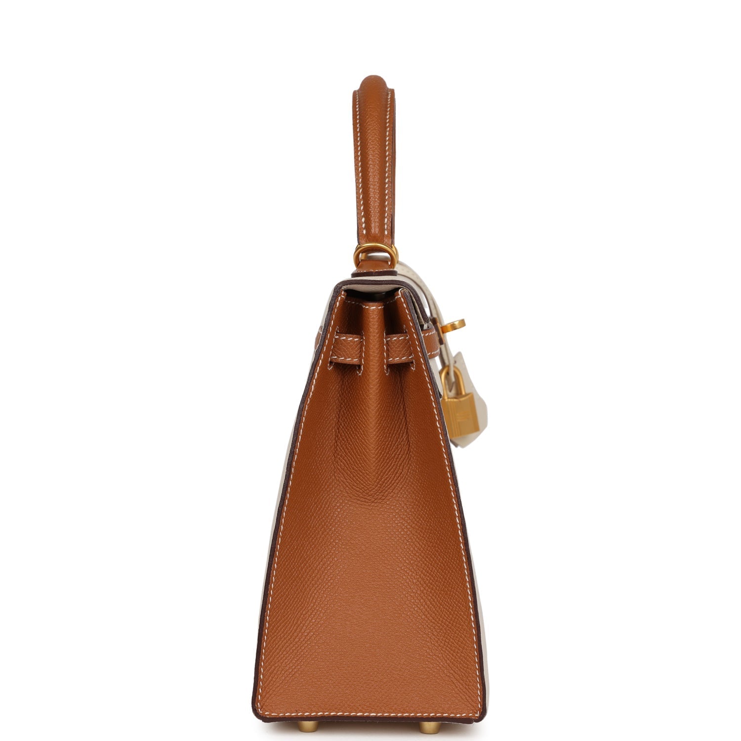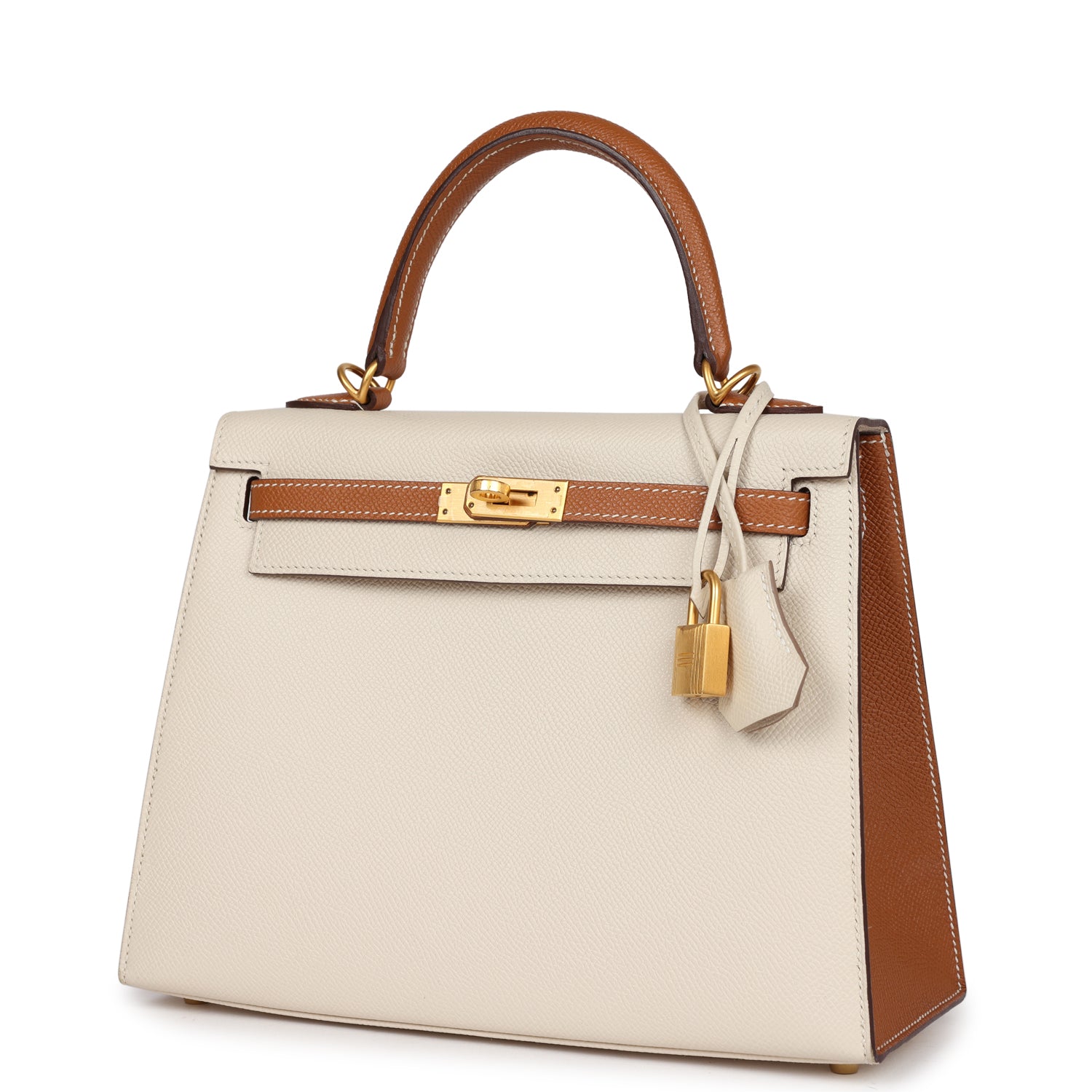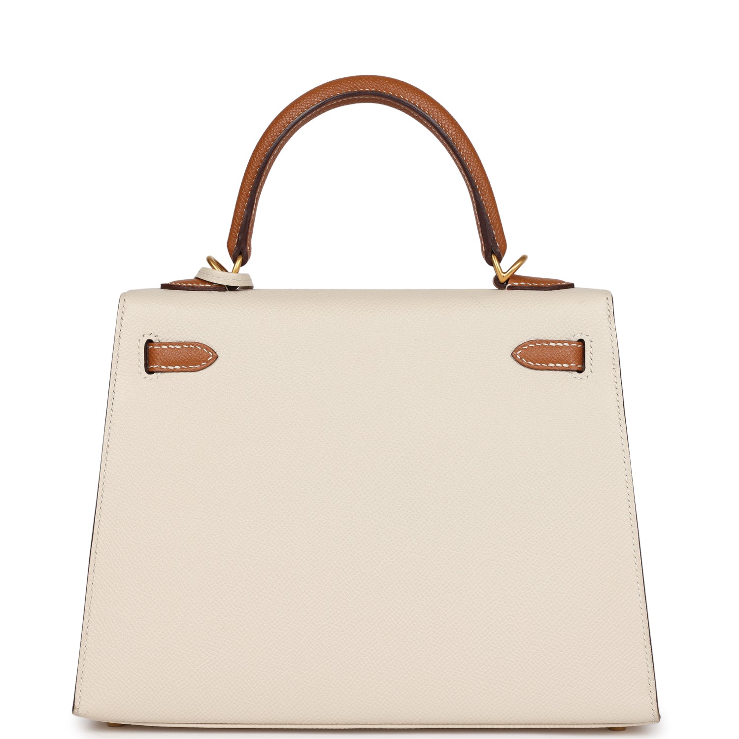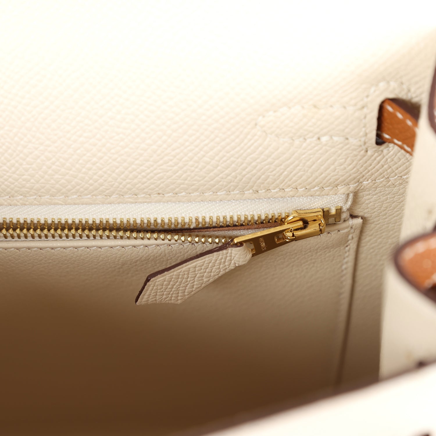 Special Order Kelly, in the Sellier style, is in Craie and Gold epsom leather with brushed gold hardware and has tonal and contrast stitching, two front straps with toggle closure, clochette with lock and two keys, single rolled handle and removable shoulder strap.