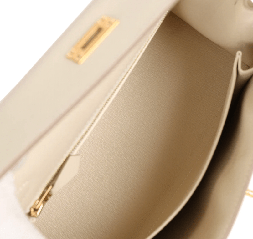 The interior is lined with Craie chevre leather and has one zip pocket with an Hermes engraved pull and one open pocket on the opposite side.