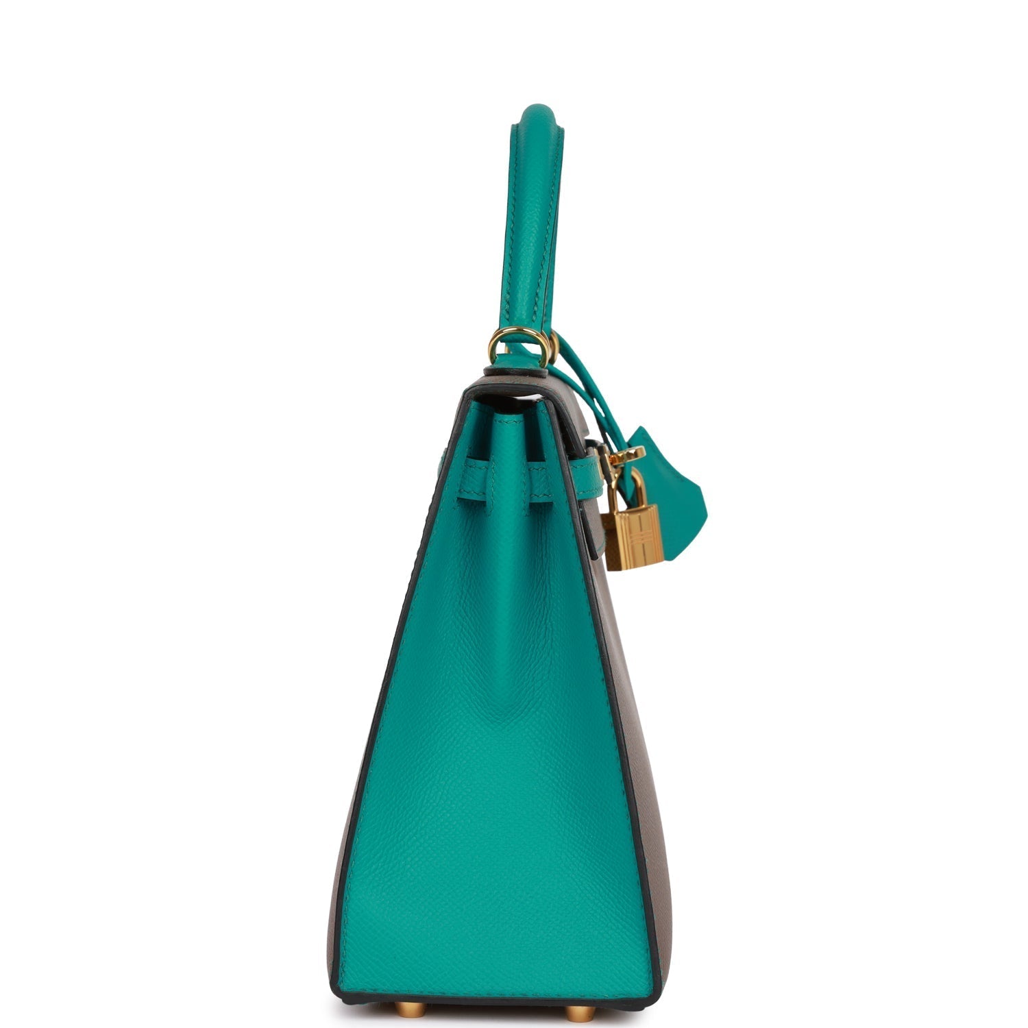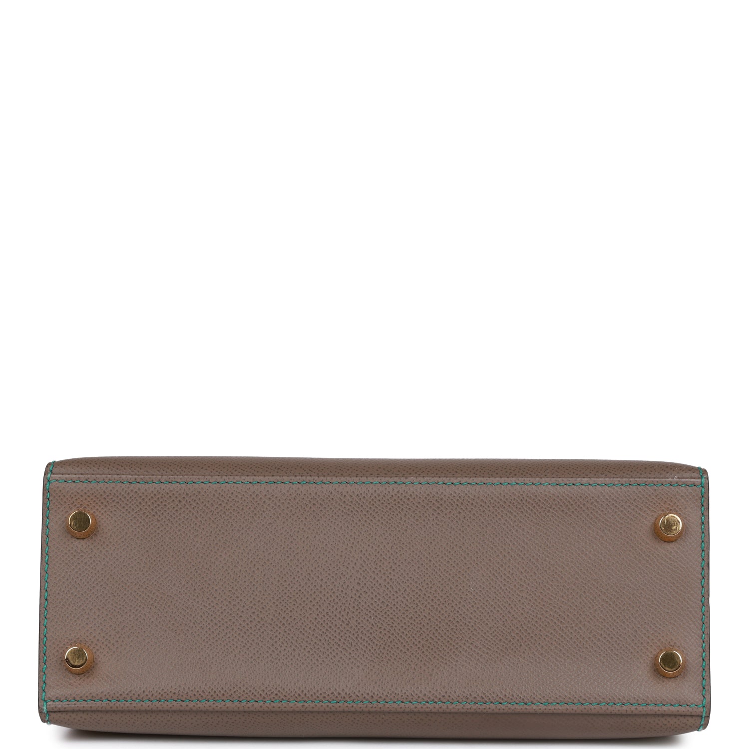 Special Order Kelly, in the Sellier style, is in Etain and Bleu Paon epsom leather with gold hardware and has tonal and contrast stitching, two front straps with toggle closure, clochette with lock and two keys, single rolled handle and removable shoulder strap.