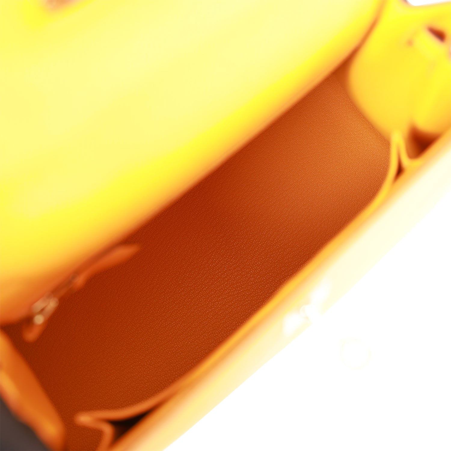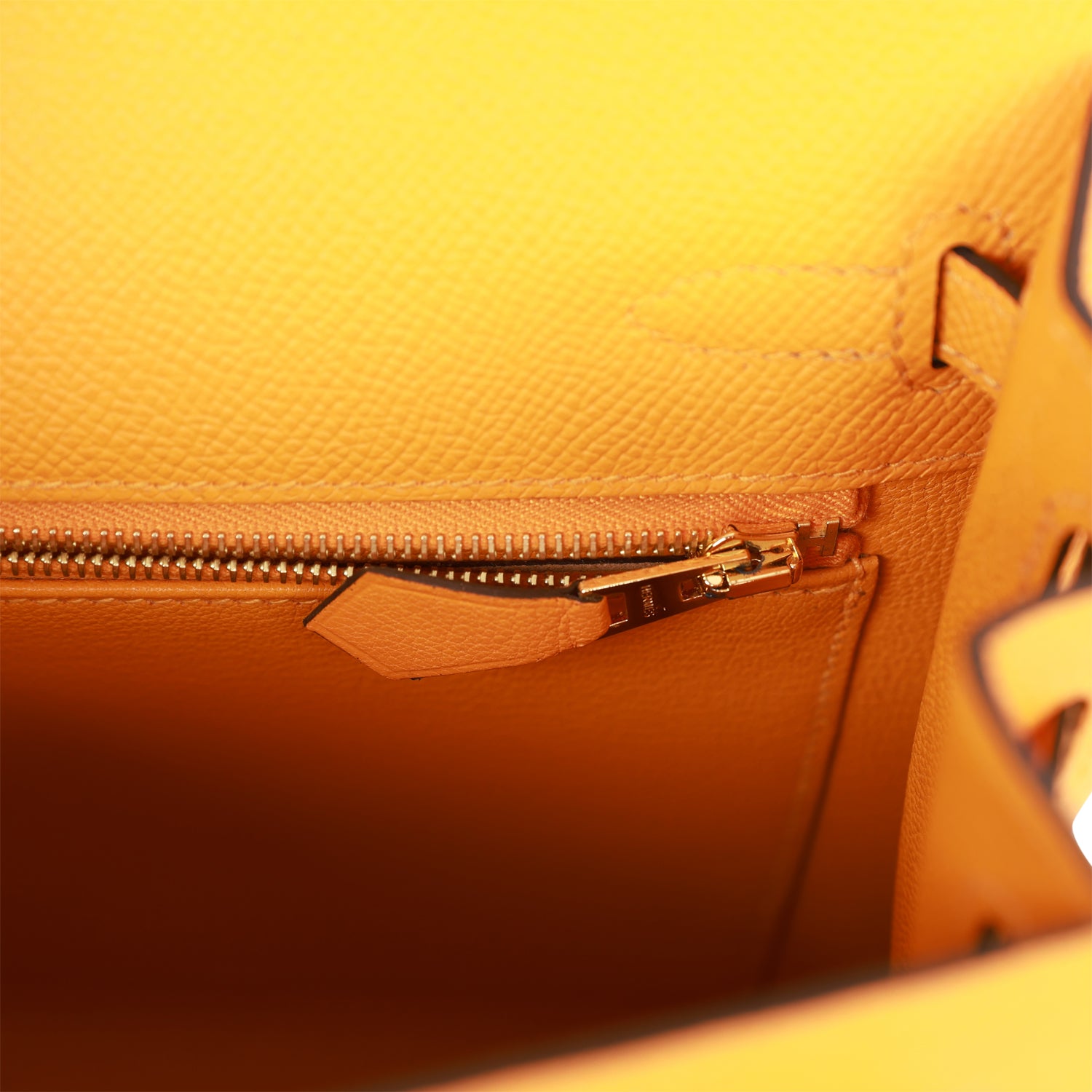 The interior is lined with Jaune D'Or chevre leather and has one zip pocket with an Hermes engraved pull and one open pocket on the opposite side.