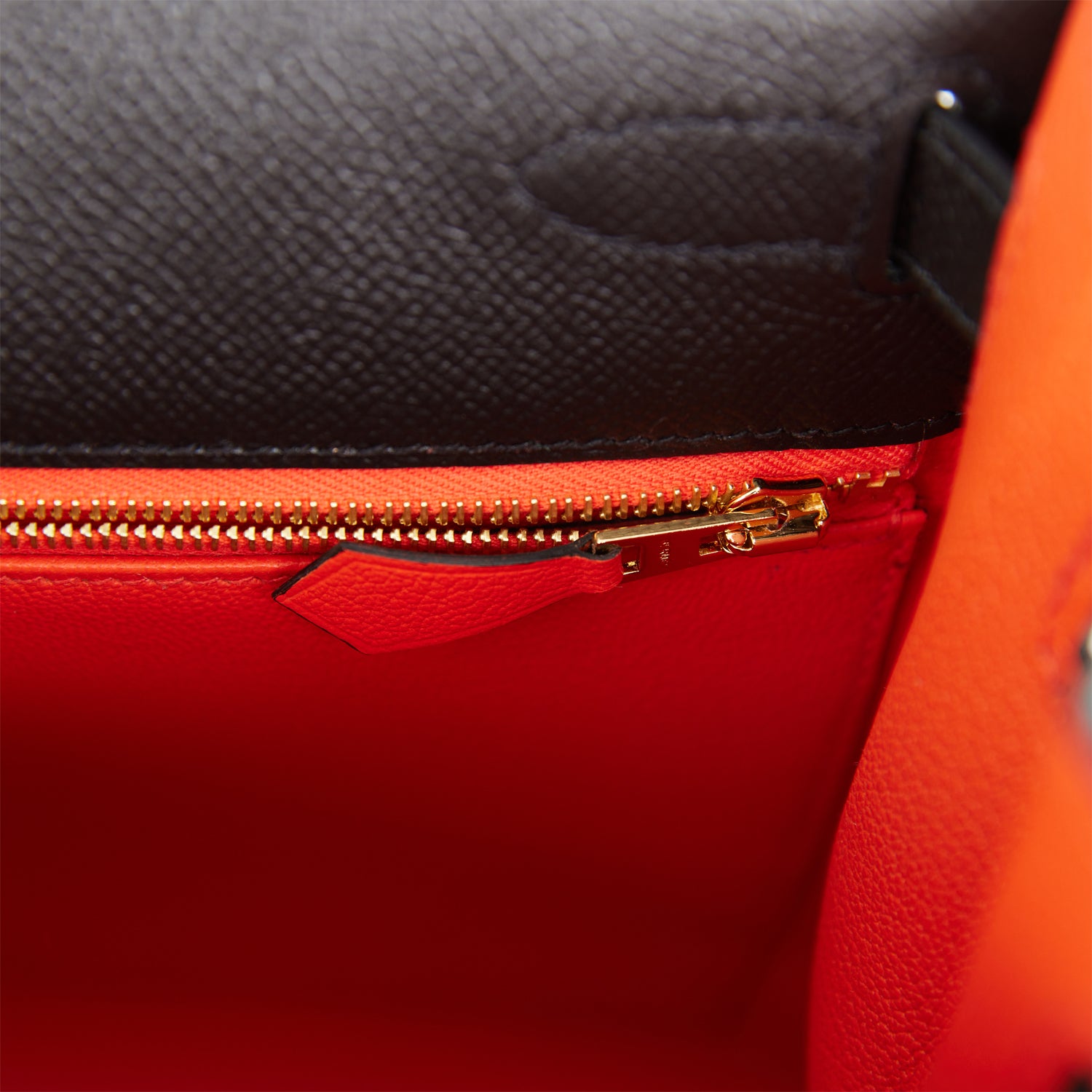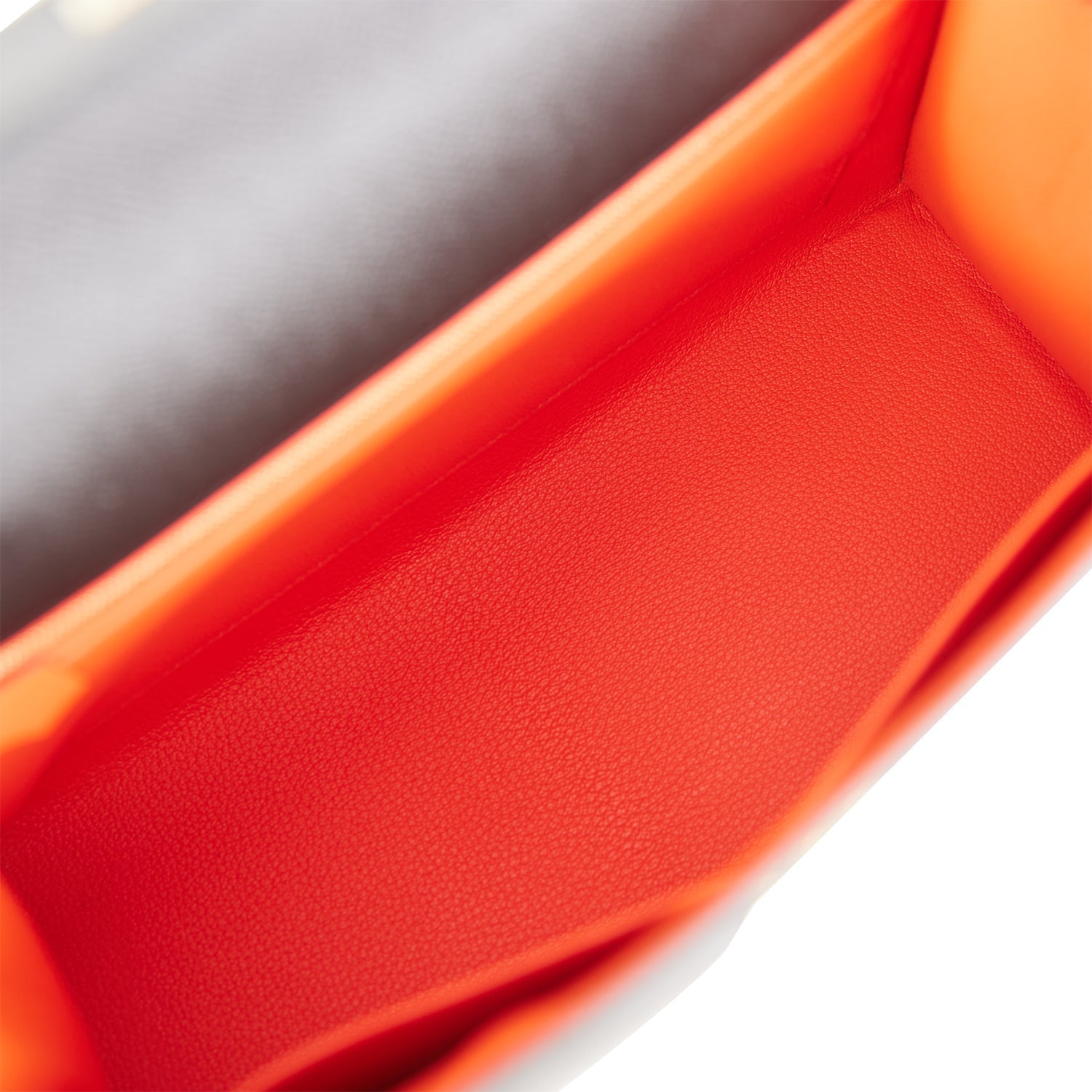 The interior is lined with Orange Poppy chevre leather and has one zip pocket with an Hermes engraved pull and two open pockets on the opposite side.