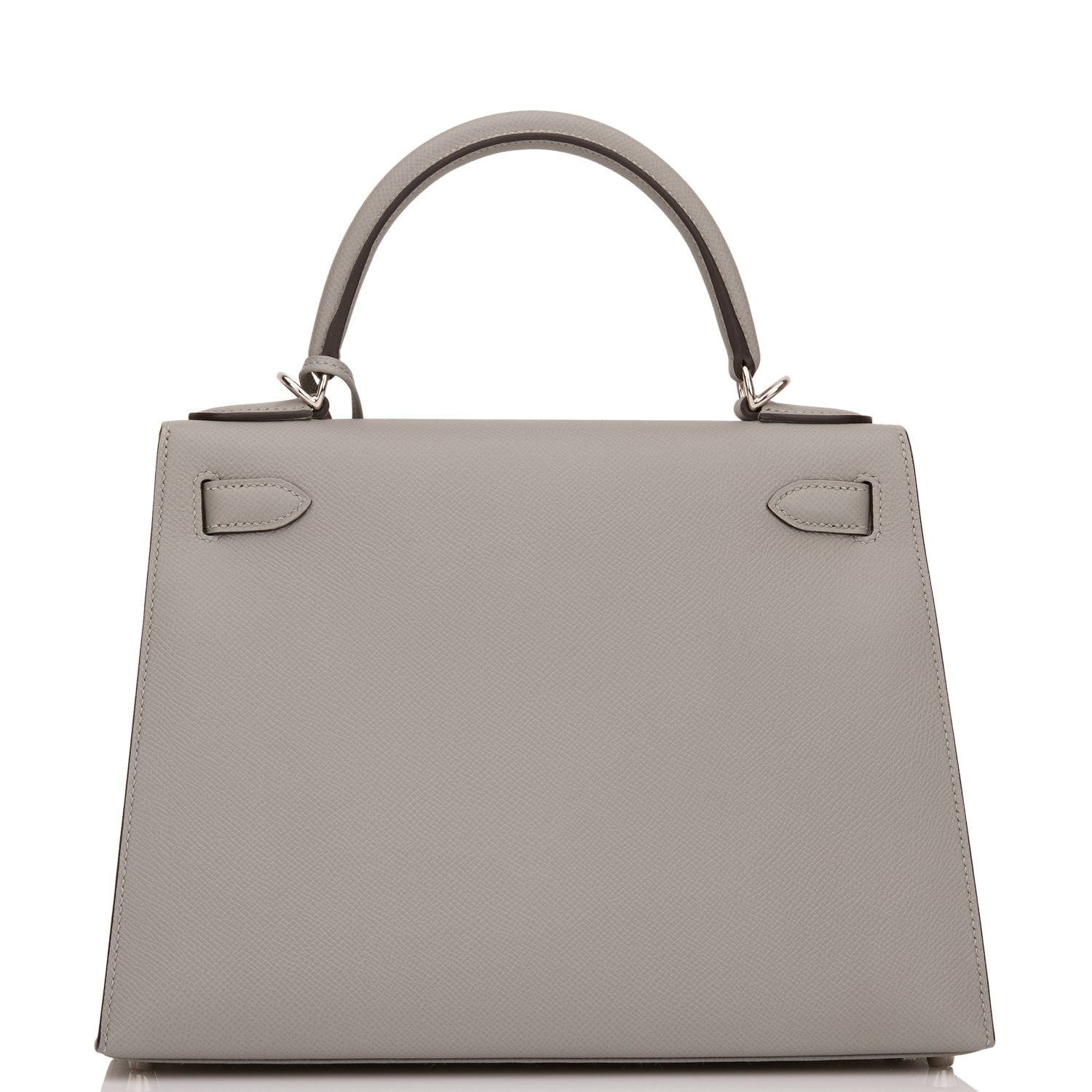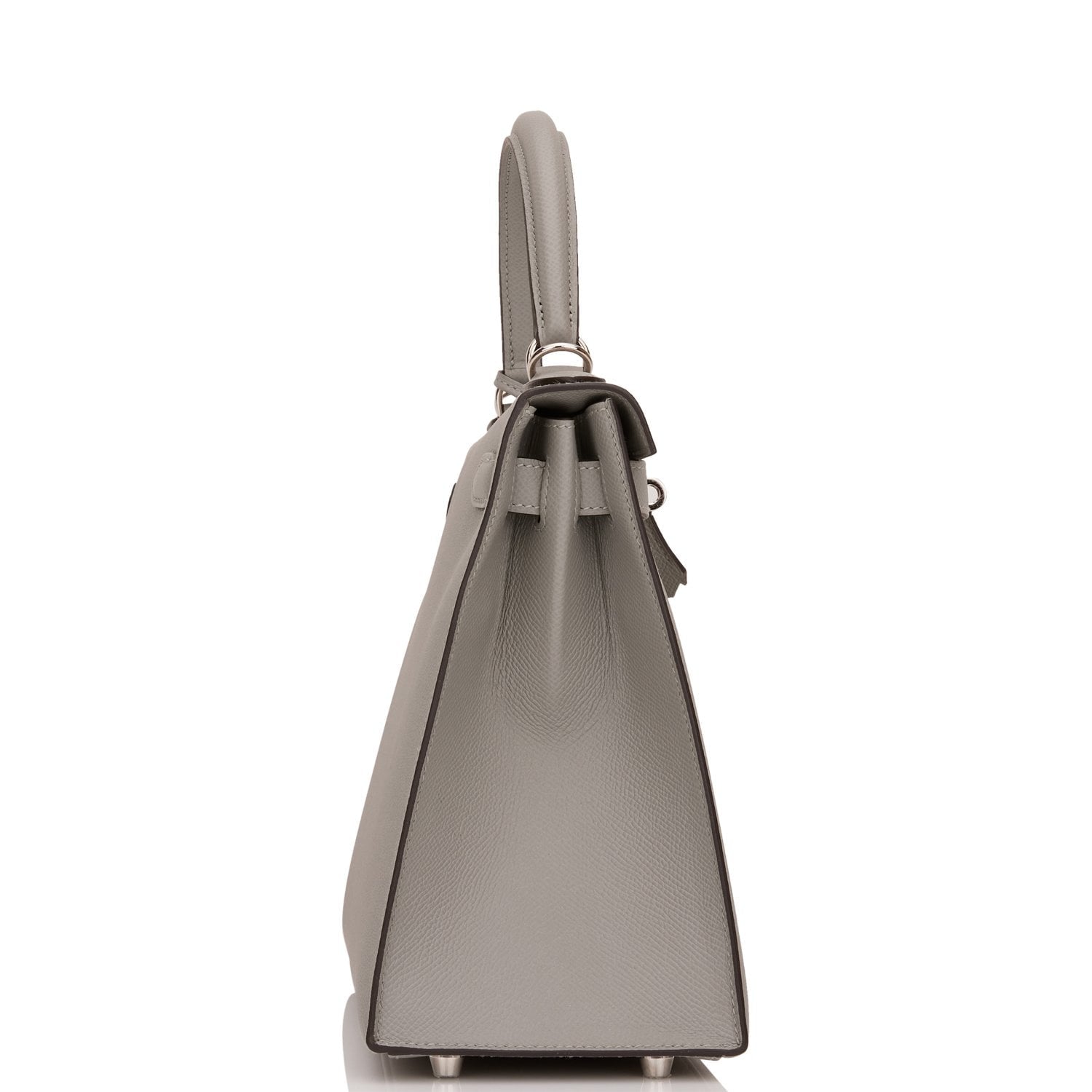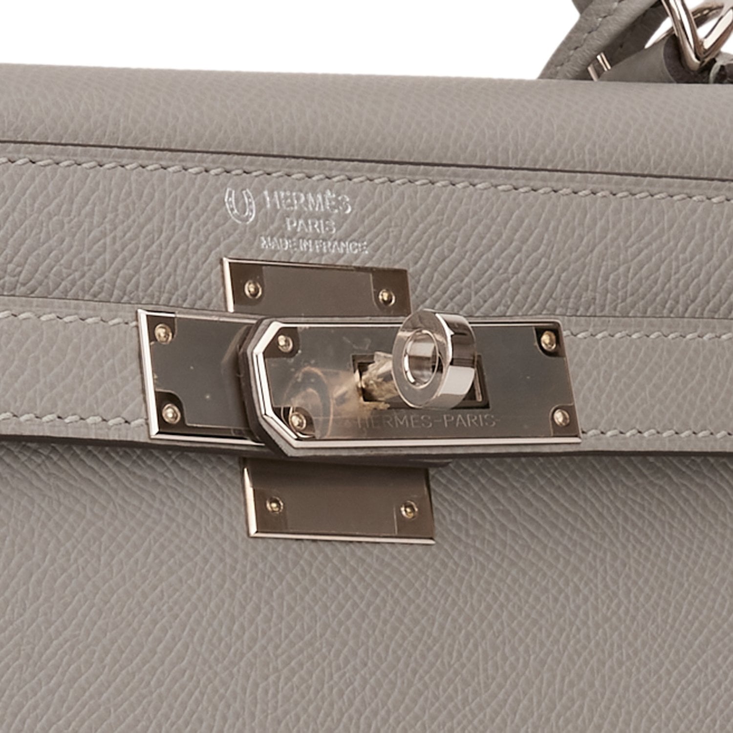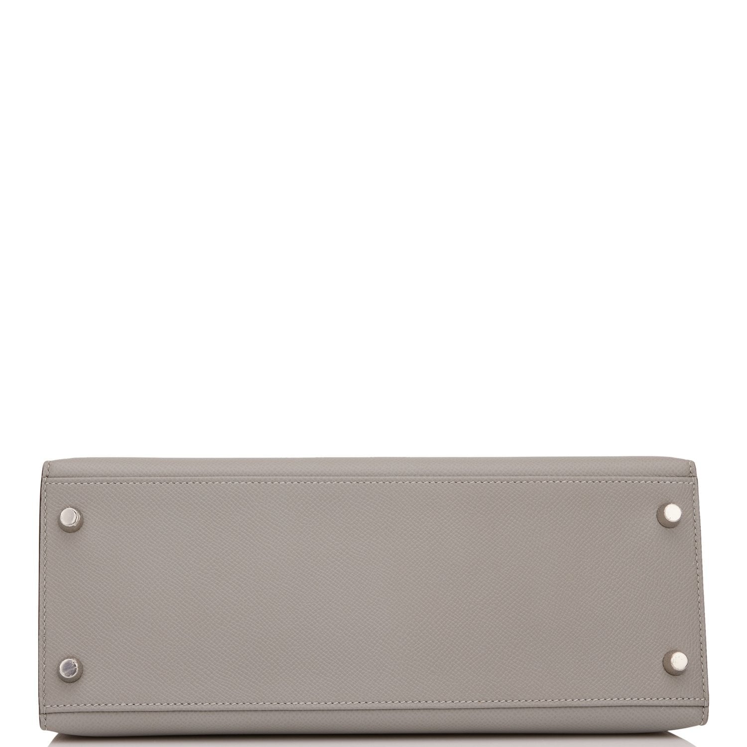 This single color Special Order Kelly, in the Sellier style, is in Gris Mouette epsom leather with palladium hardware and has tonal stitching, two straps with front toggle closure, clochette with lock and two keys, single rolled handle and removable shoulder strap.