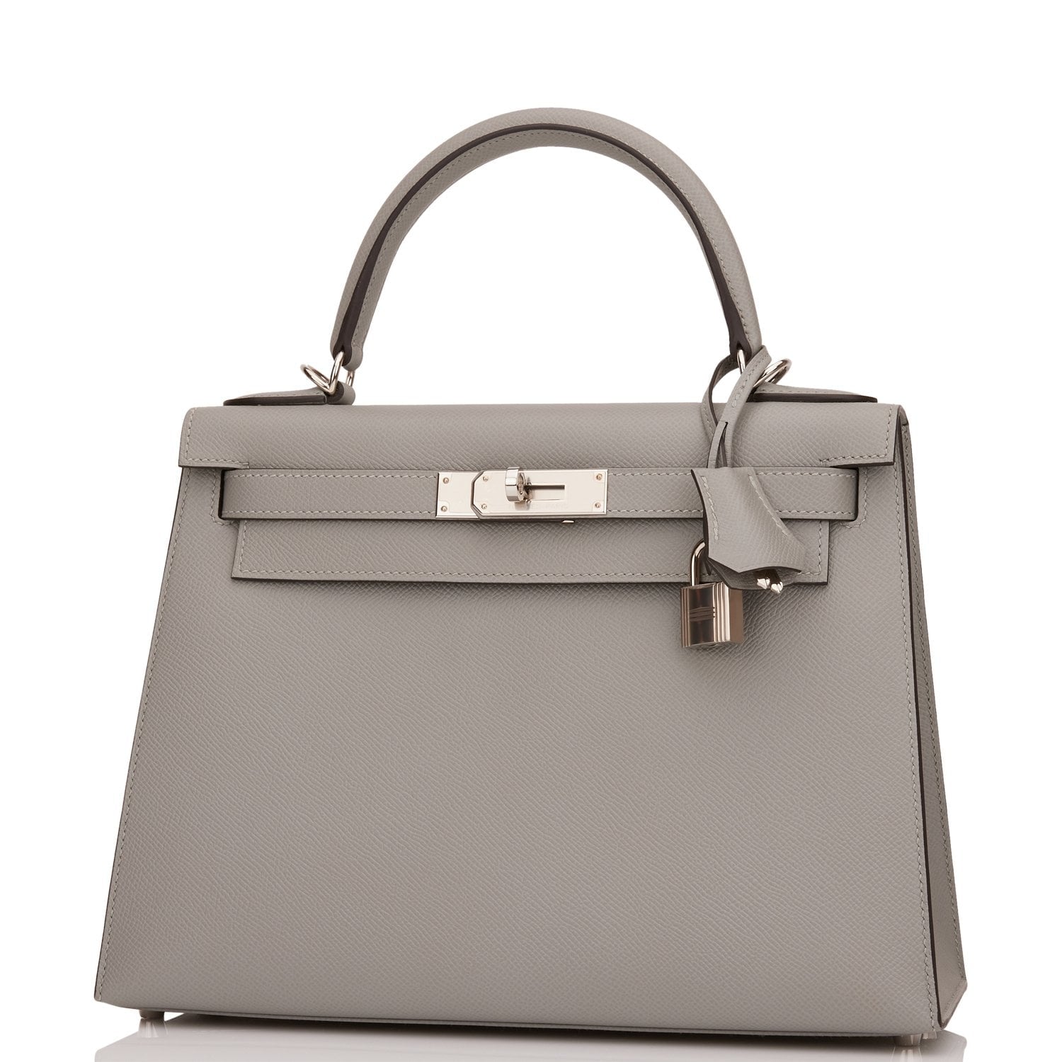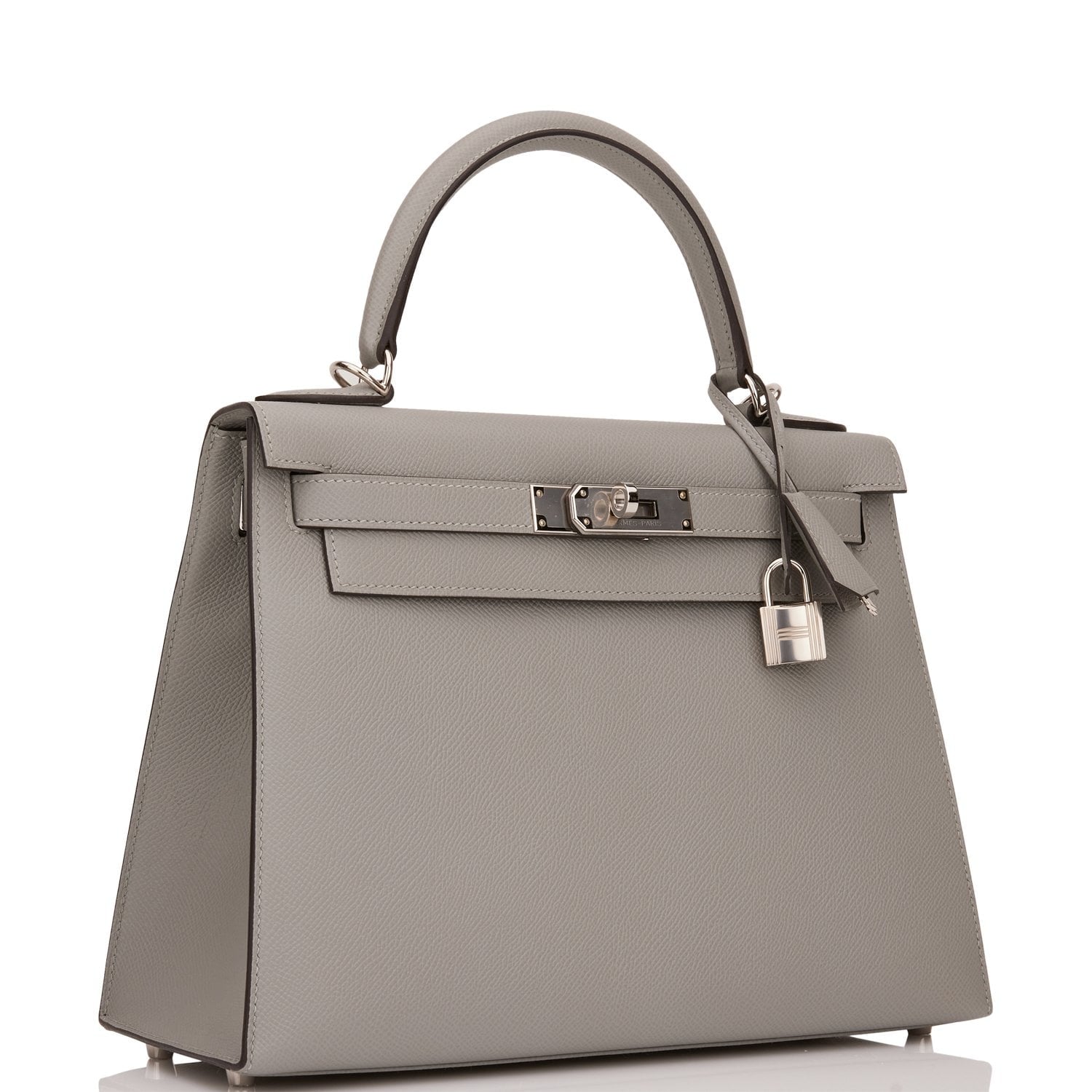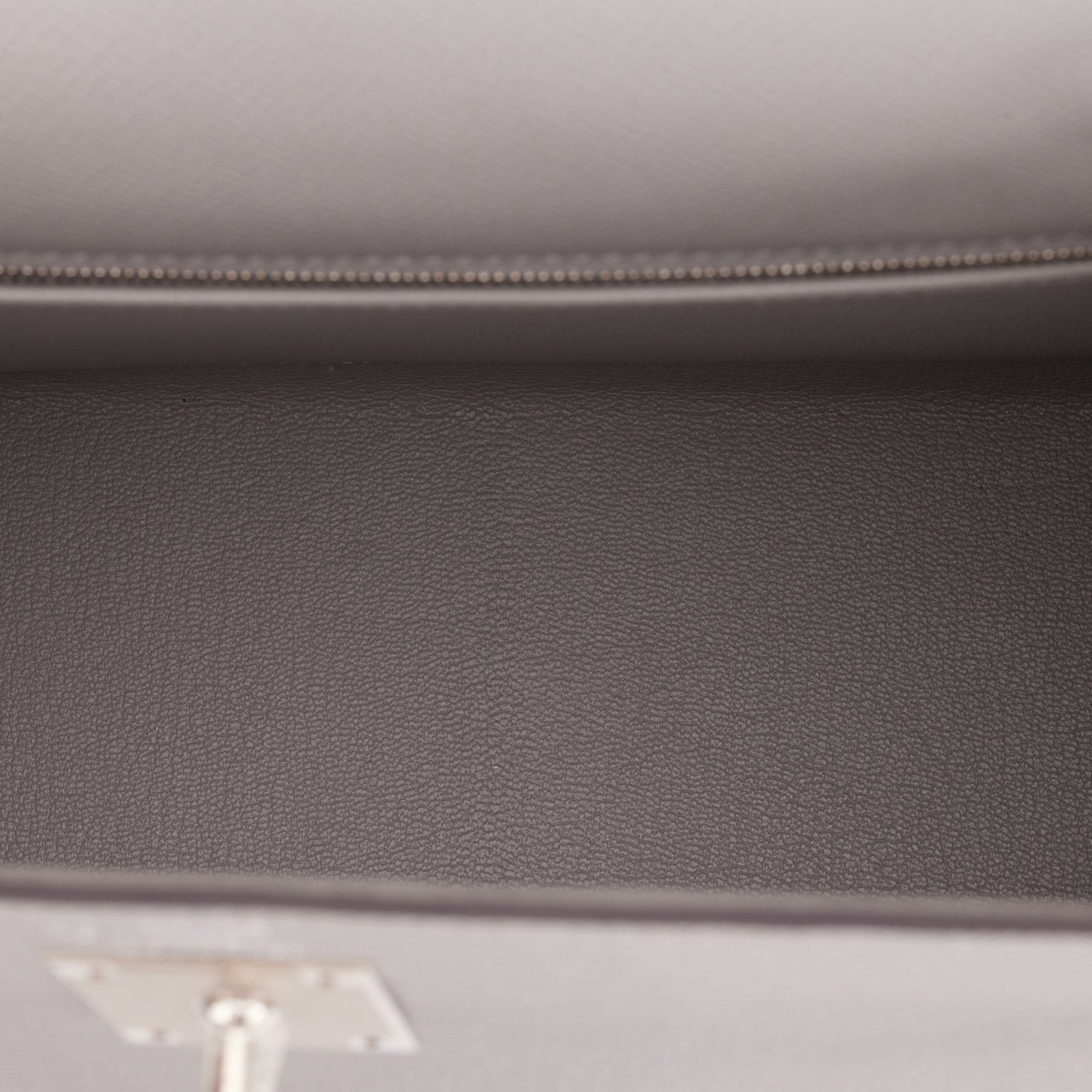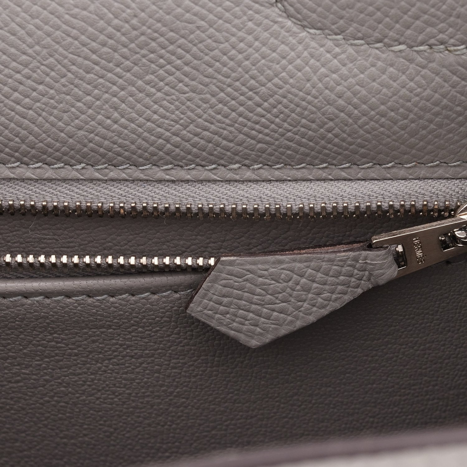 This single color Special Order Kelly, in the Sellier style, is in Gris Mouette epsom leather with palladium hardware and has tonal stitching, two straps with front toggle closure, clochette with lock and two keys, single rolled handle and removable shoulder strap.