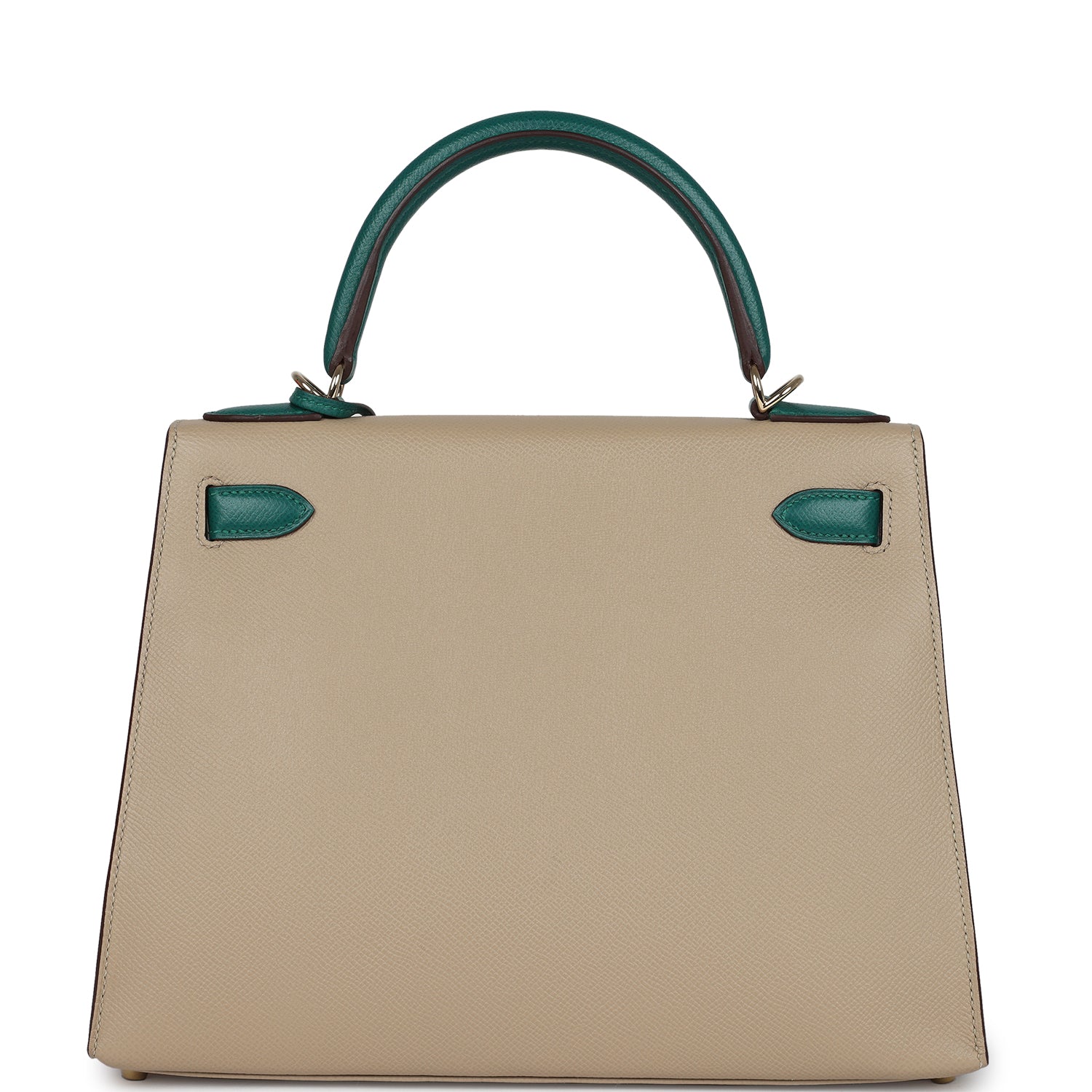 This Special Order Bi-color Kelly, in the Sellier style, is in Malachite and Trench epsom leather with permabrass hardware and has a mixture of contrast and tonal stitching, front flap, two straps with center toggle closure, clochette with lock and two keys, single rolled handle and a removable shoulder strap.