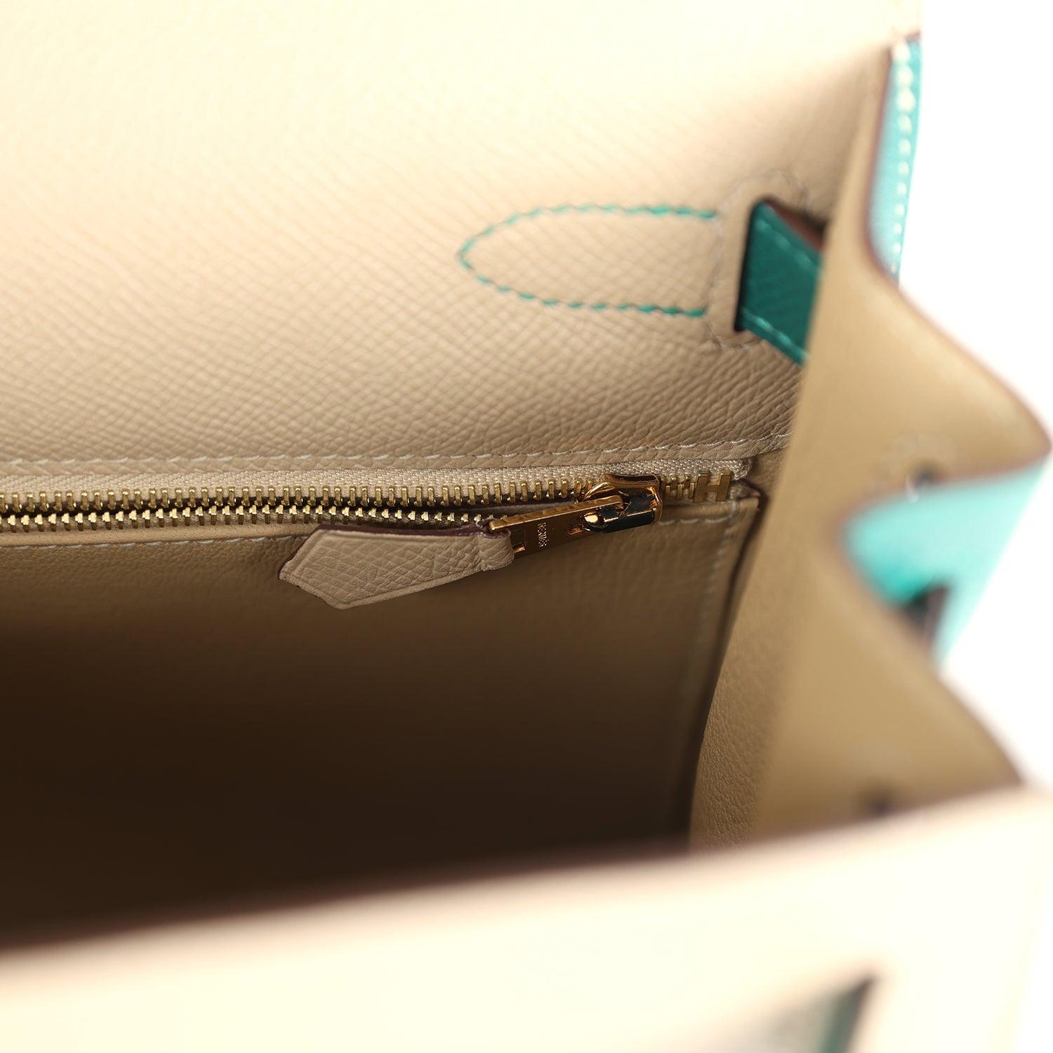 The interior is lined in Trench chevre and has one zip pocket with Hermes engraved pull and two open pockets on the opposite side.