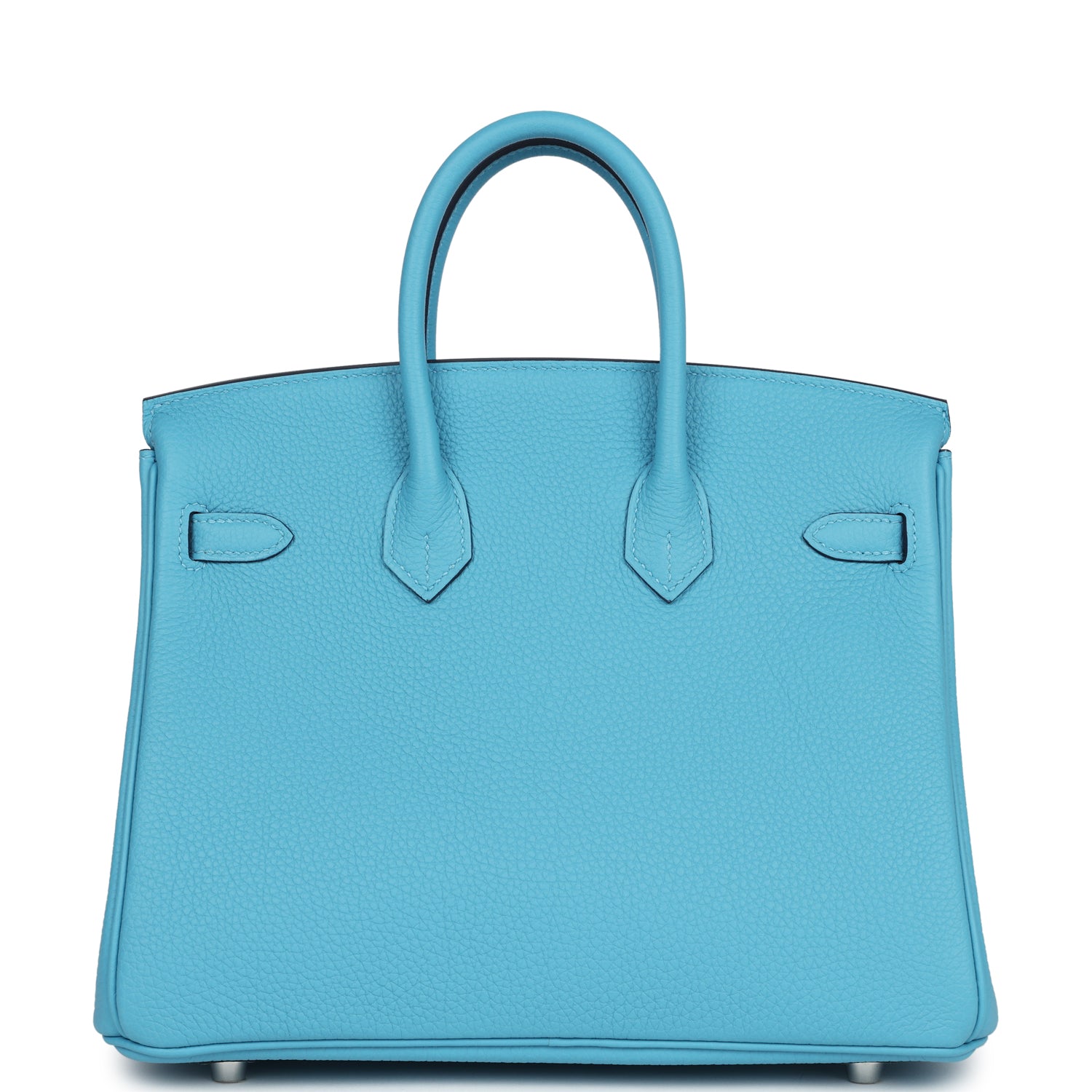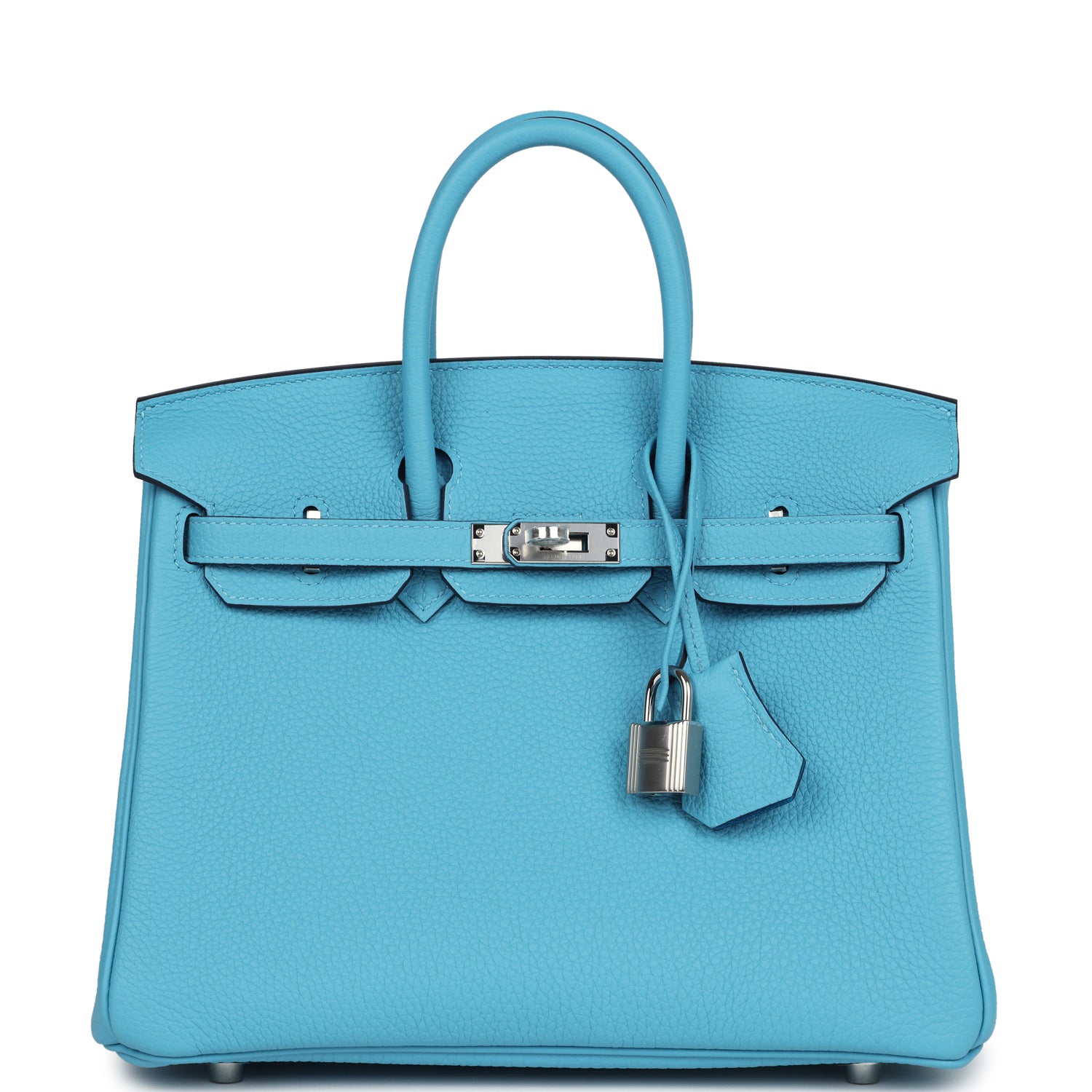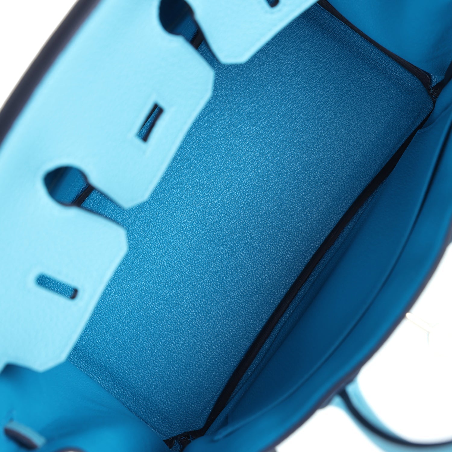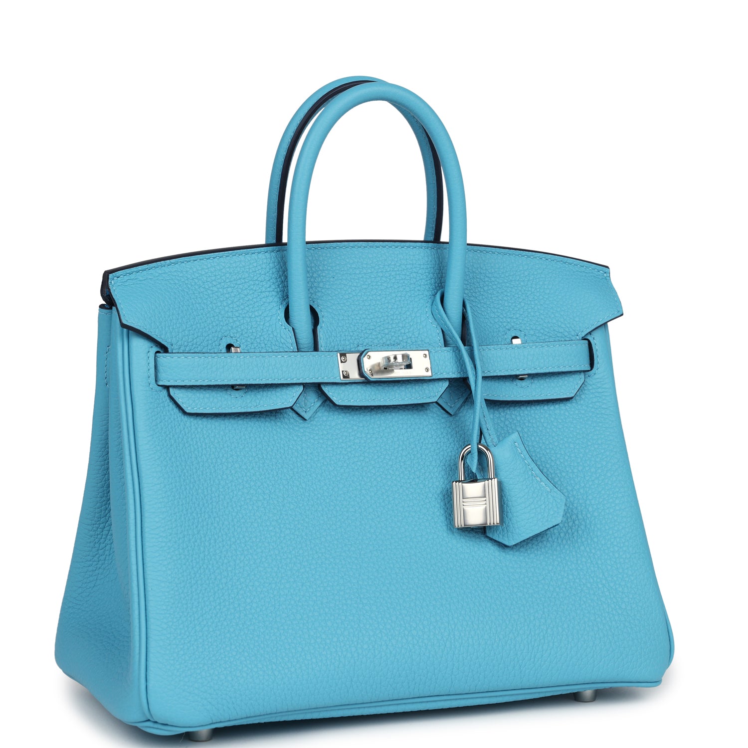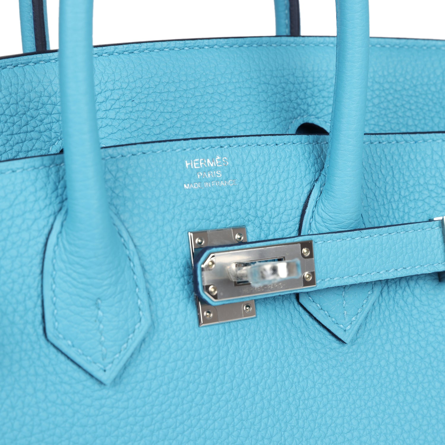This Birkin is in Bleu Du Nord togo leather with palladium hardware and has tonal stitching, front flap with two straps, front toggle closure, clochette with lock and two keys, and double rolled handles