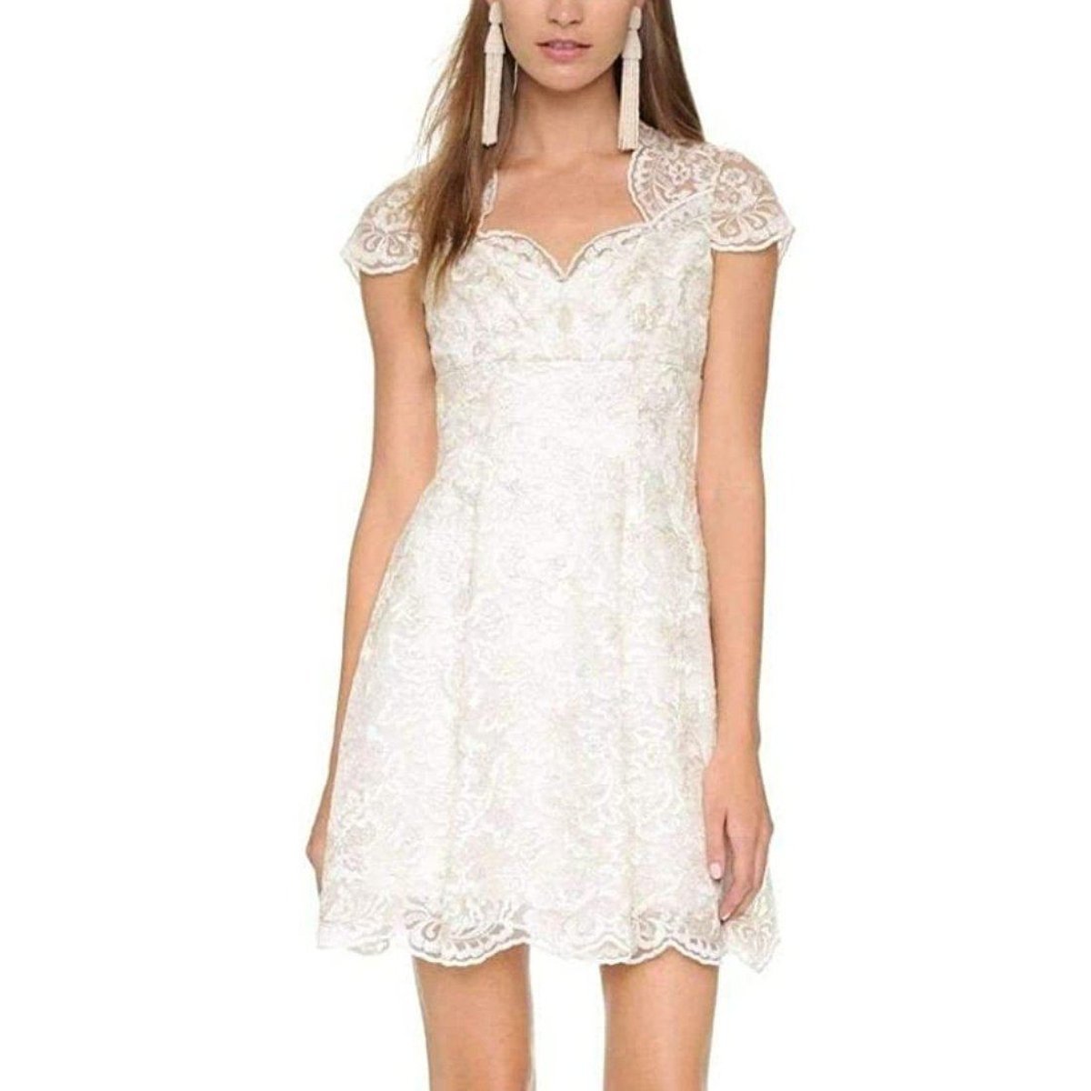 A shimmering lace Marchesa Notte dress with a scalloped neckline and cutout back.