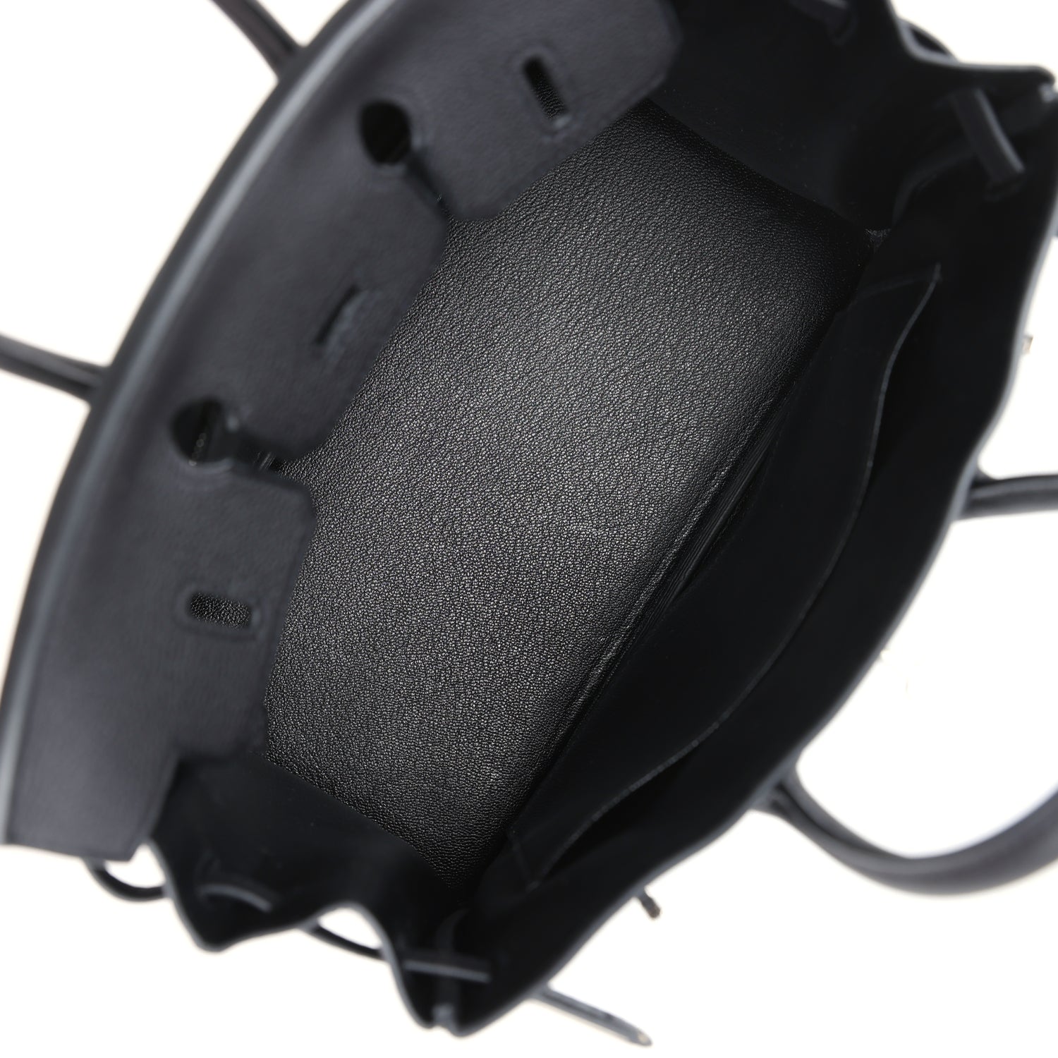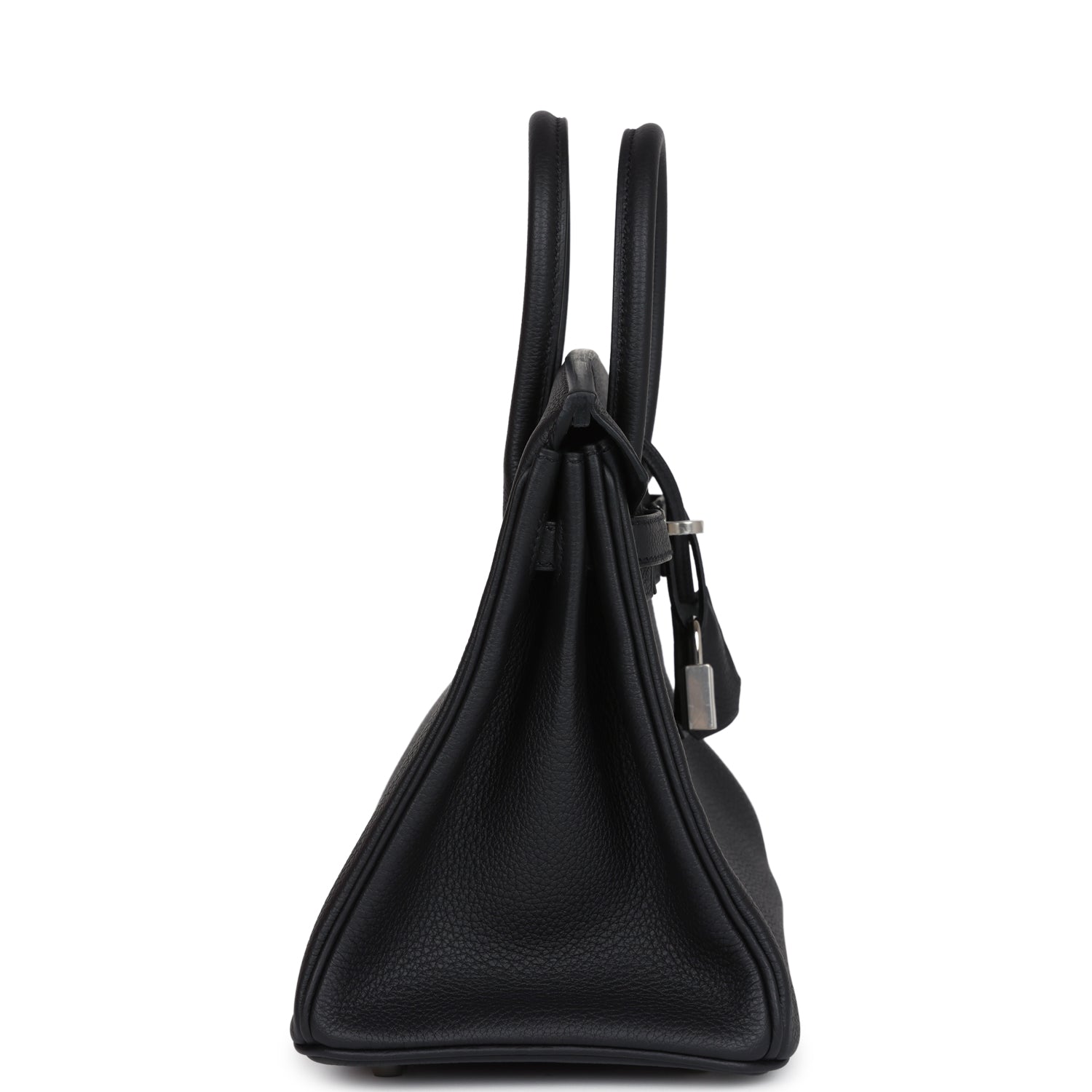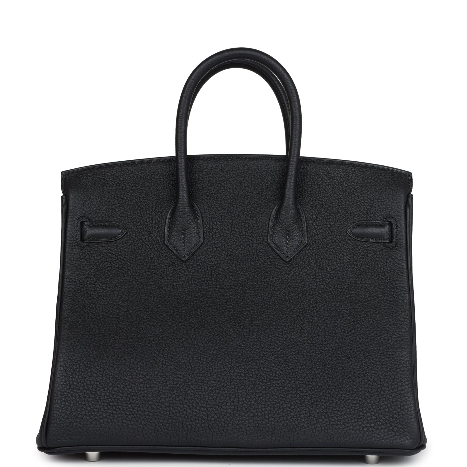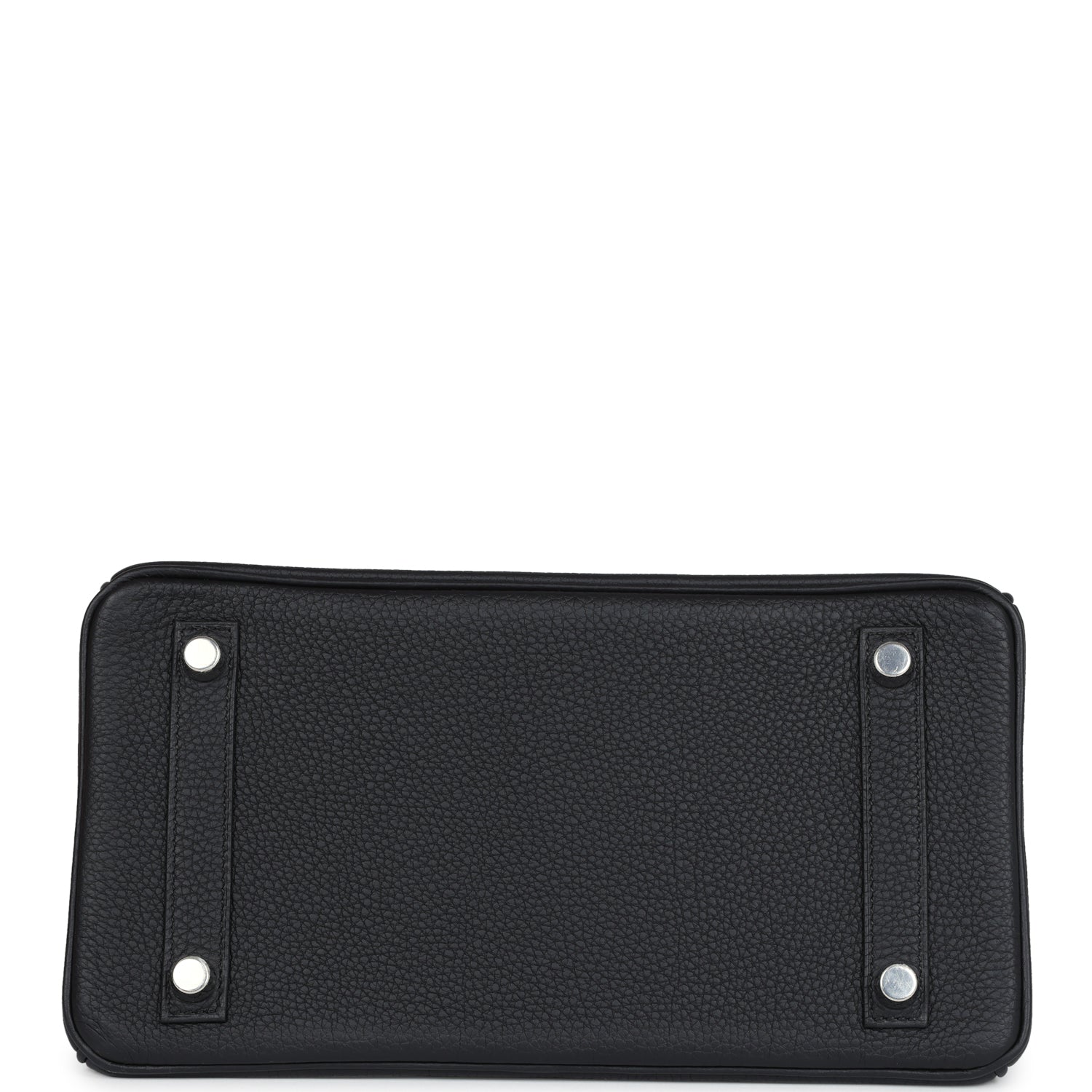 This Birkin is in Black togo leather with palladium hardware and has tonal stitching, front flap, two straps with center toggle closure, clochette with lock and two keys, and double rolled handles.