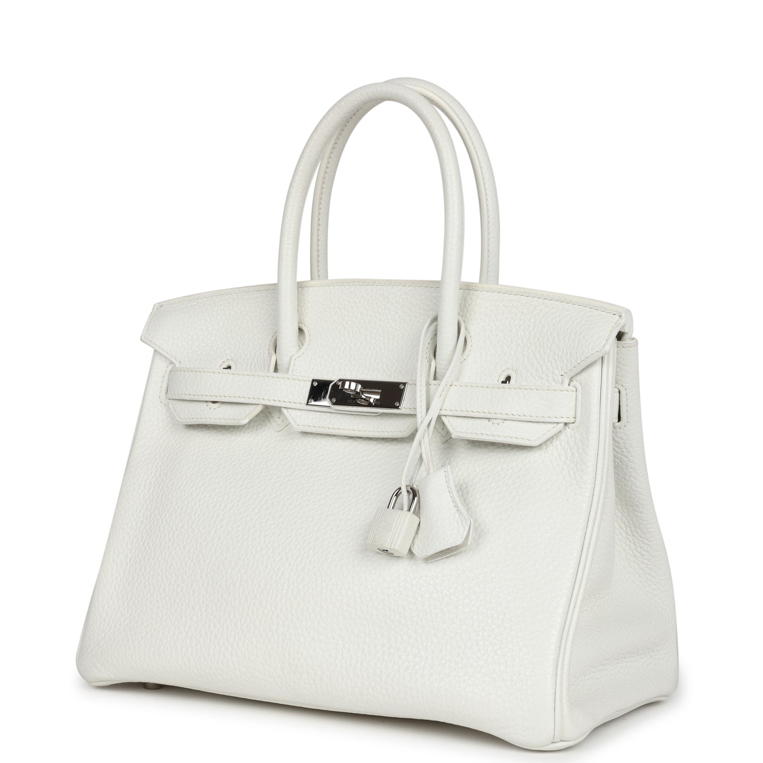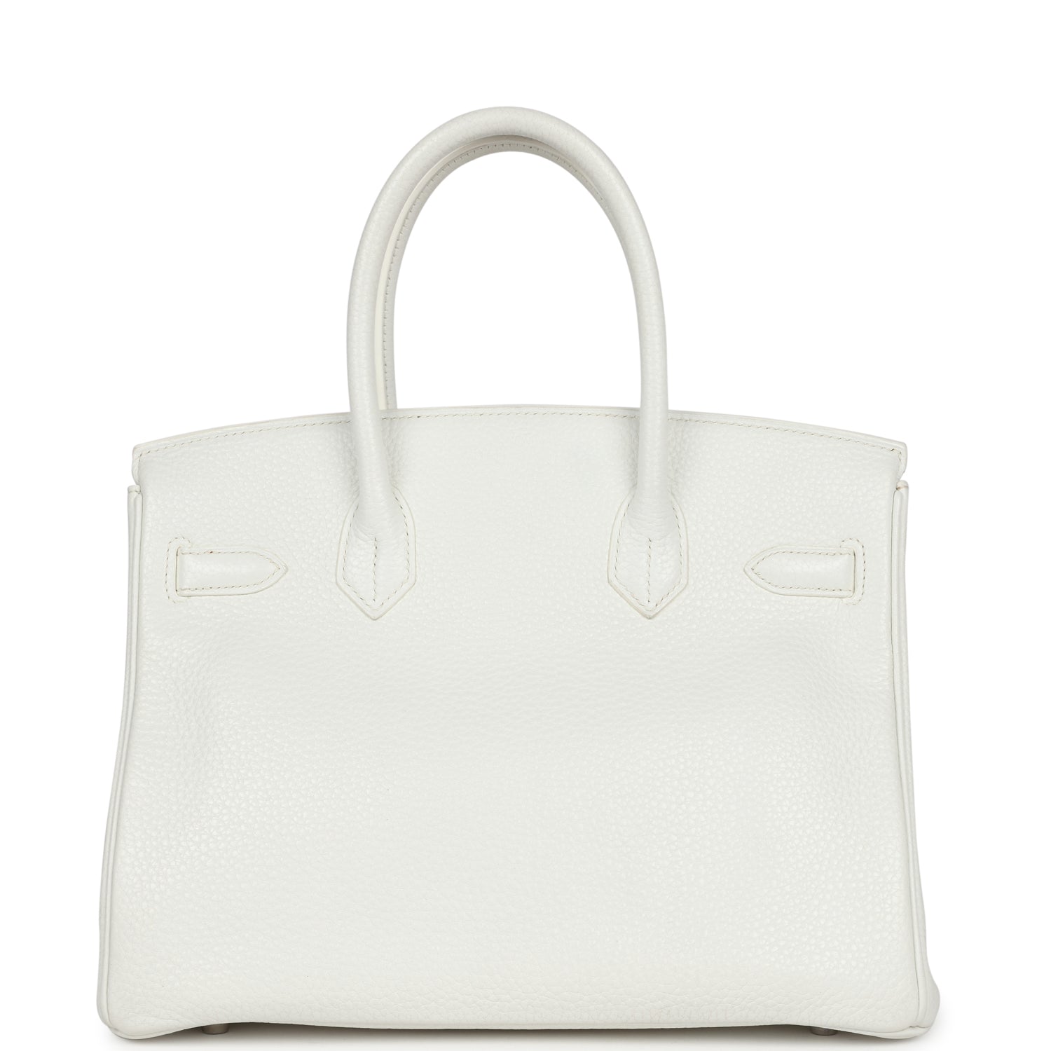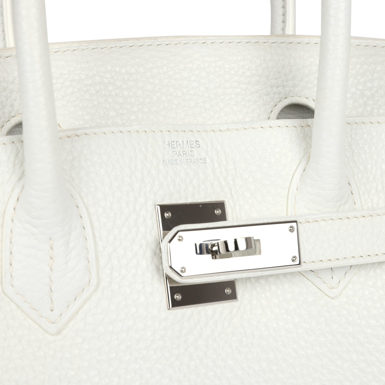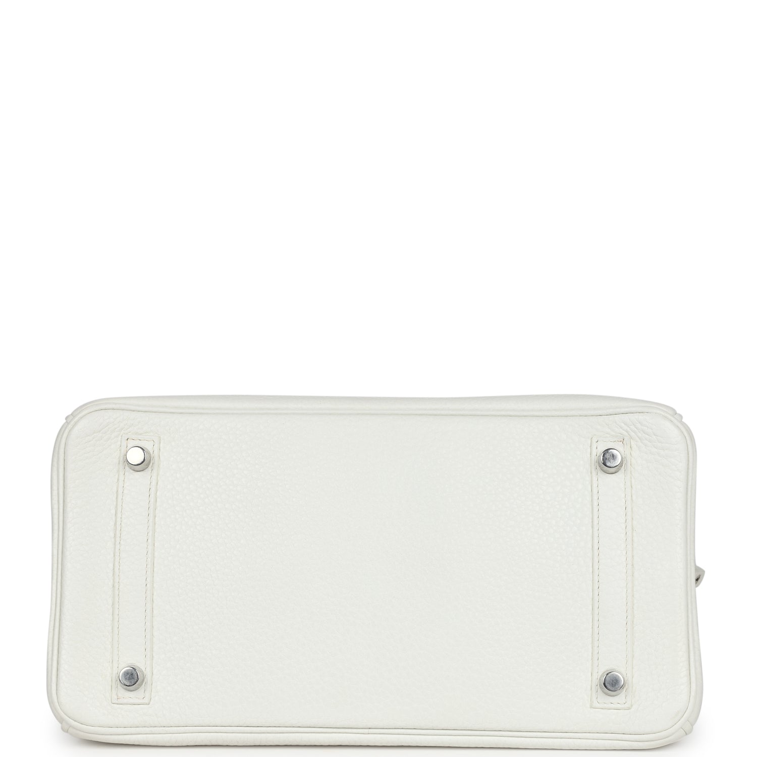 This Birkin is in White clemence leather with palladium hardware and has tonal stitching, a front toggle closure, a clochette with lock and two keys, and double rolled handles.