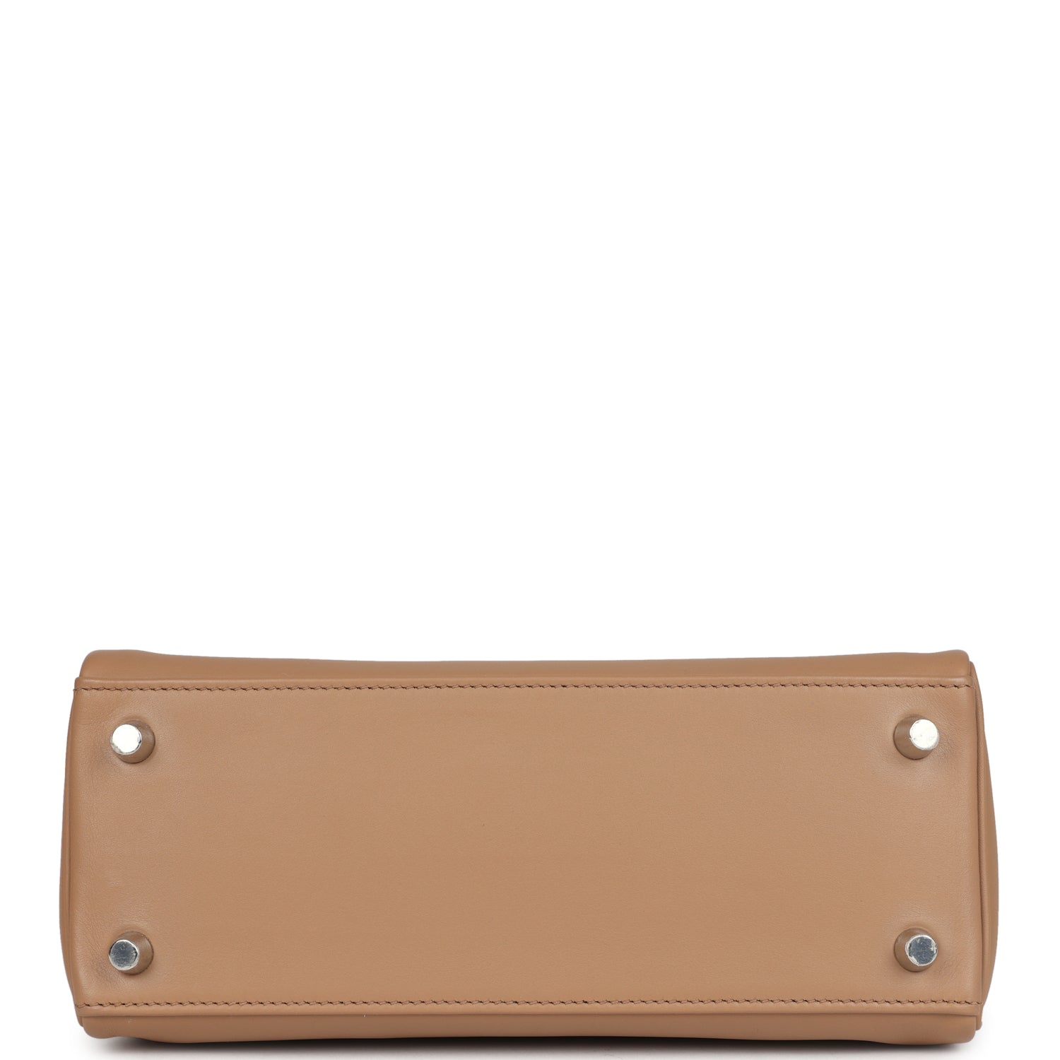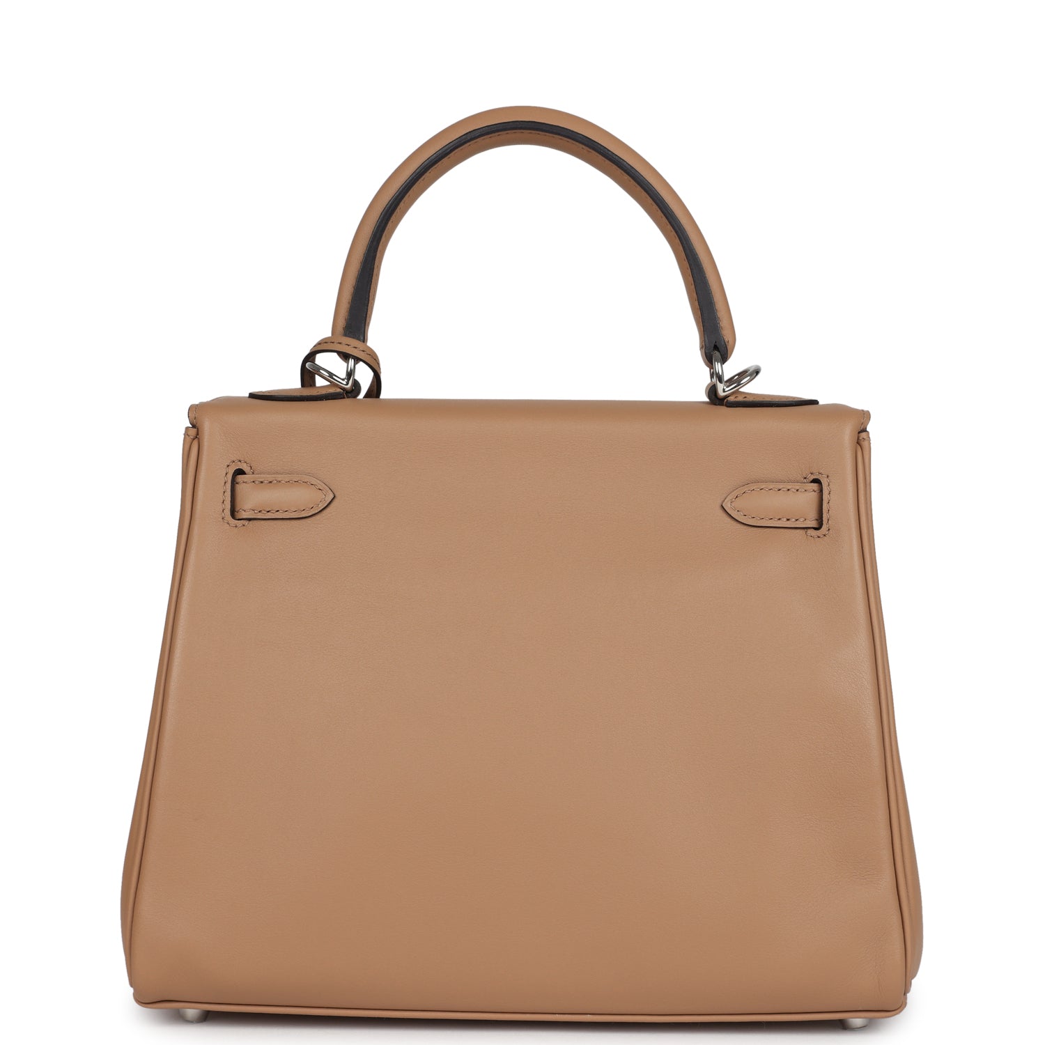 Kelly, in the Retourne style, is in Chai swift leather with palladium hardware and has tonal stitching, front flap, two straps with center toggle closure, clochette with lock and two keys, single rolled handle and an optional shoulder strap.